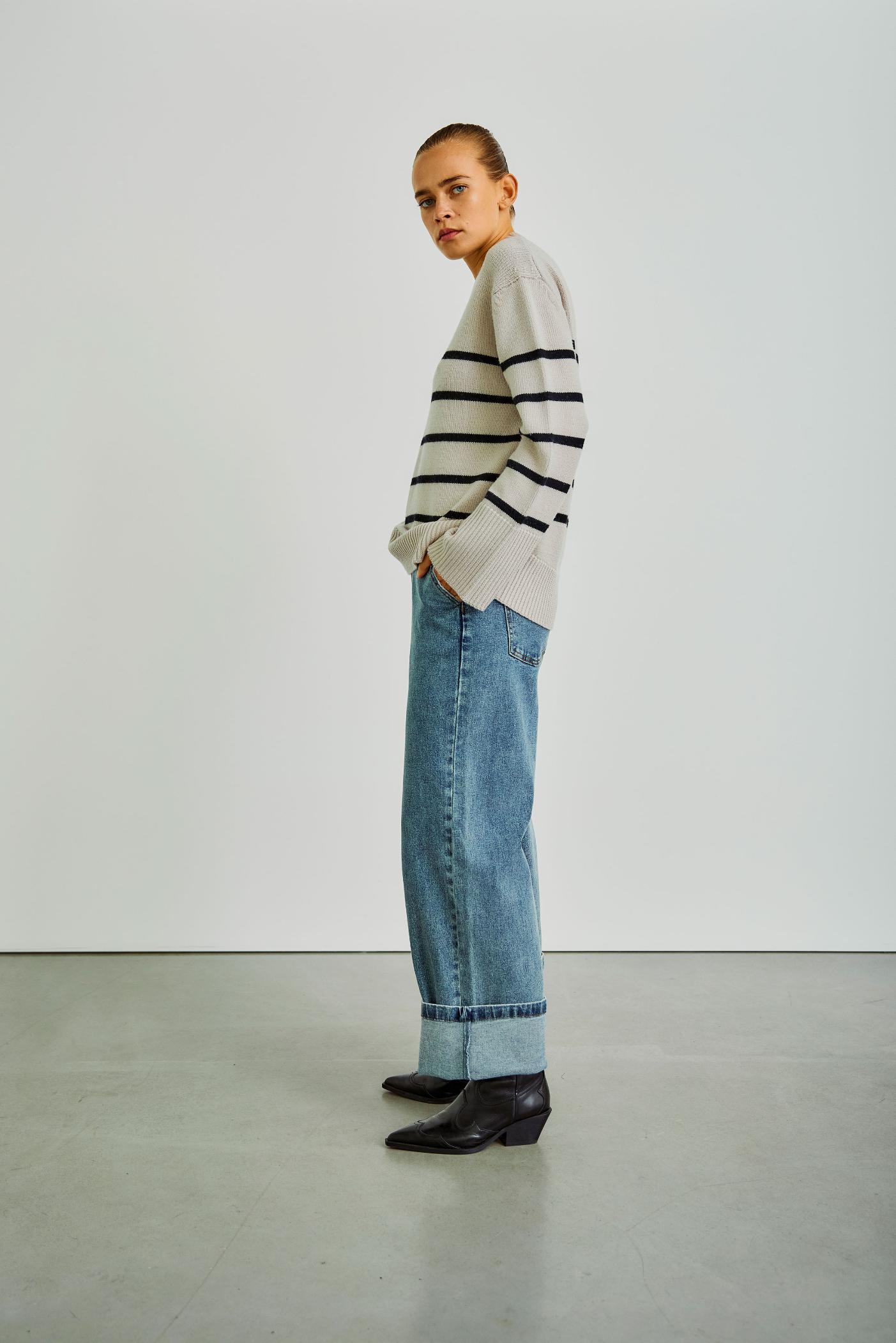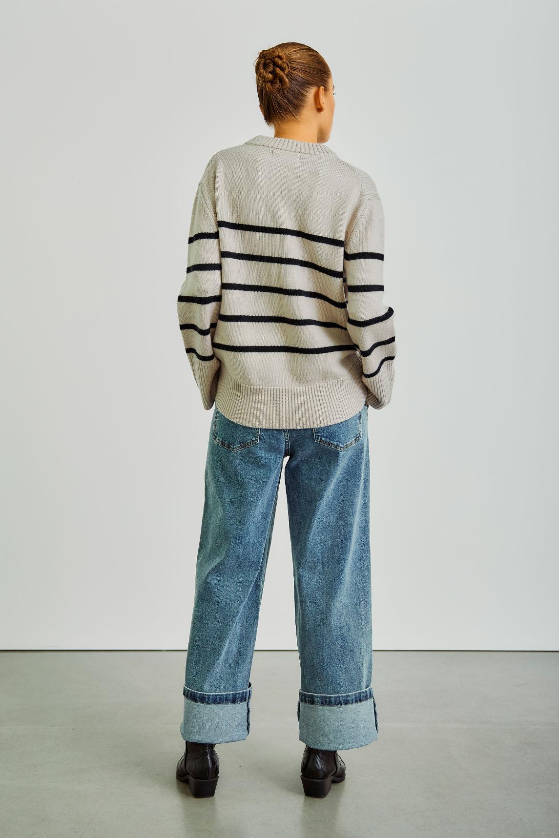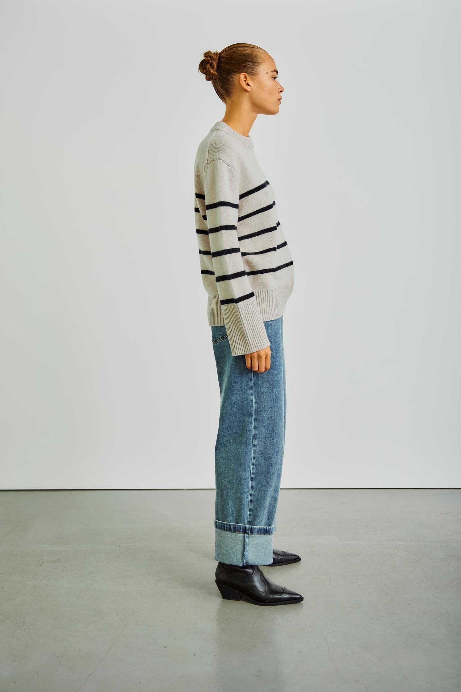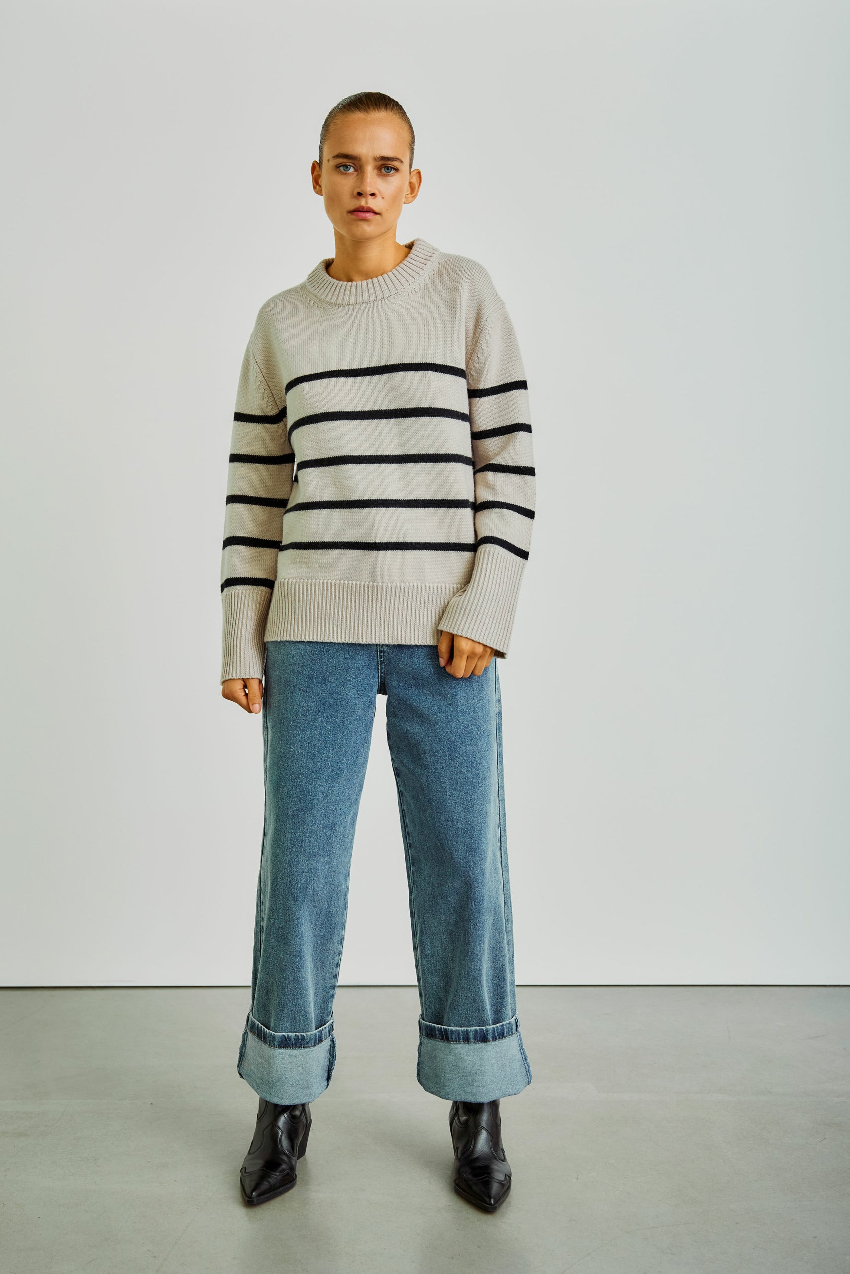 Stay timeless with this maritime striped pullover, crafted from 100% pure wool for natural warmth and comfort. Designed with a classic O neck and a regular fit, it falls just below the waist for easy wear. Ribbing at the neckline adds a clean finish, while the high-rib effect at the sleeve hems and hemline gives it a subtle, textured edge.