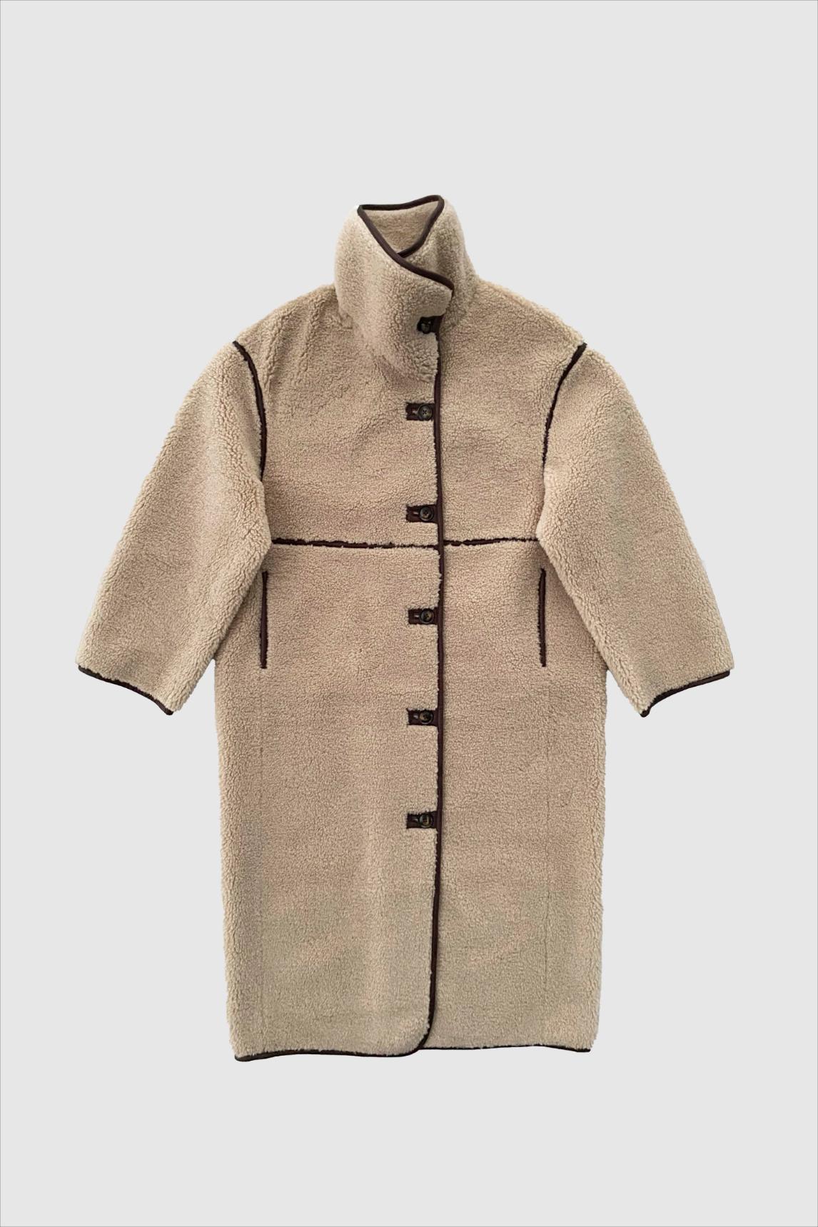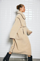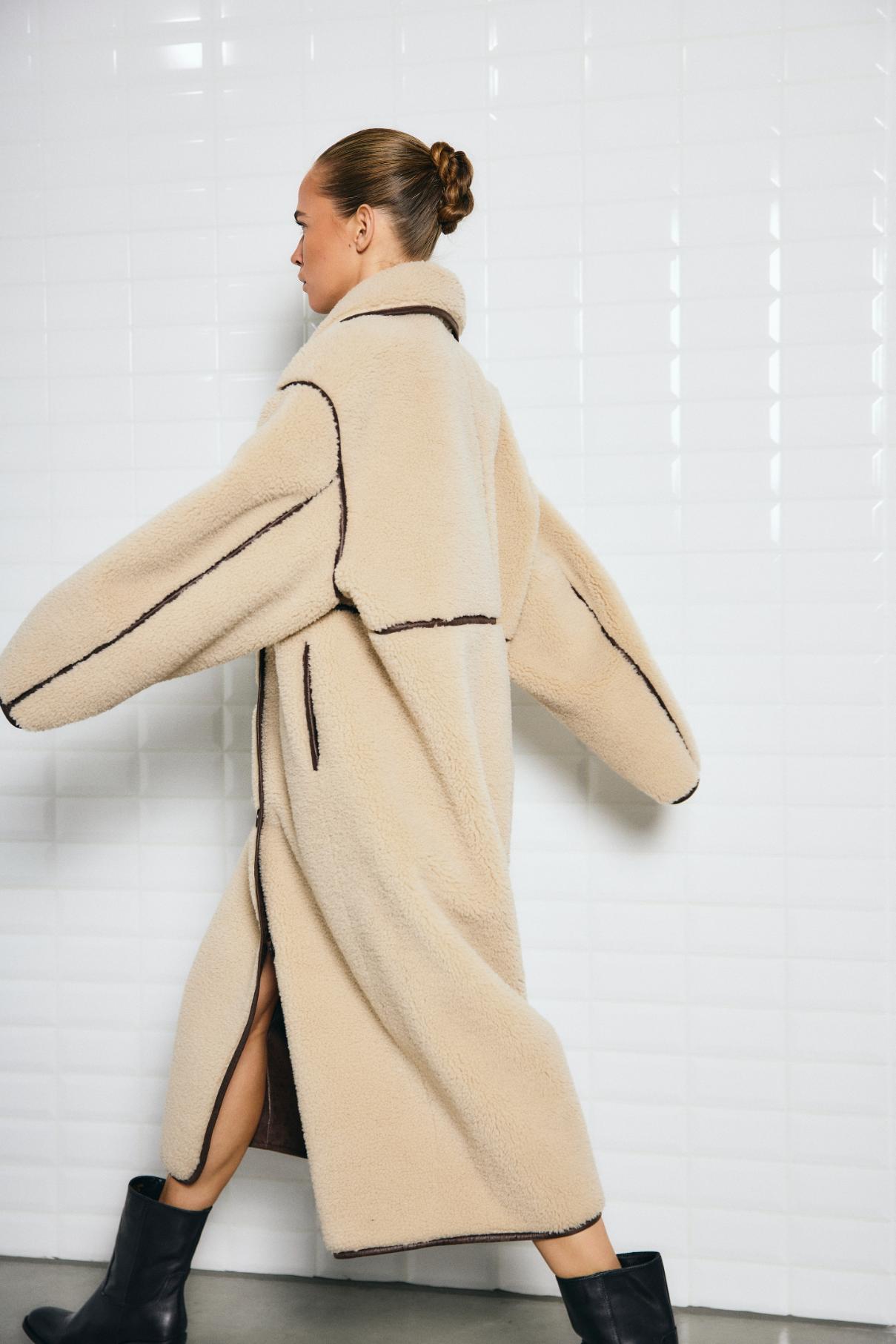 Make a statement in softness with this calf-length coat in imitation shearling. Backed with smooth vegan suede, it delivers warmth and comfort with a luxe finish. The loose fit and dropped shoulders give it an effortlessly oversized silhouette, while the standing collar can be worn up for extra drama or folded down for a classic touch. Bone-look buttons and sleek piped pockets complete the design, making this the perfect blend of cosy and chic.