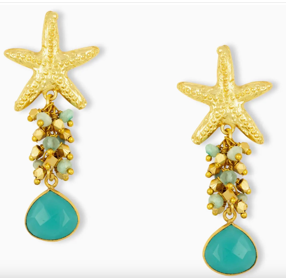 Perfect for the summer, these earrings feature a starfish stud and bead cluster drop. Perfect for an evening on the beach, these earrings scream summer elegance!