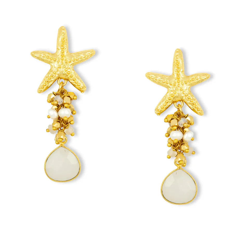 Perfect for the summer, these earrings feature a starfish stud and bead cluster drop. Perfect for an evening on the beach, these earrings scream summer elegance!