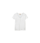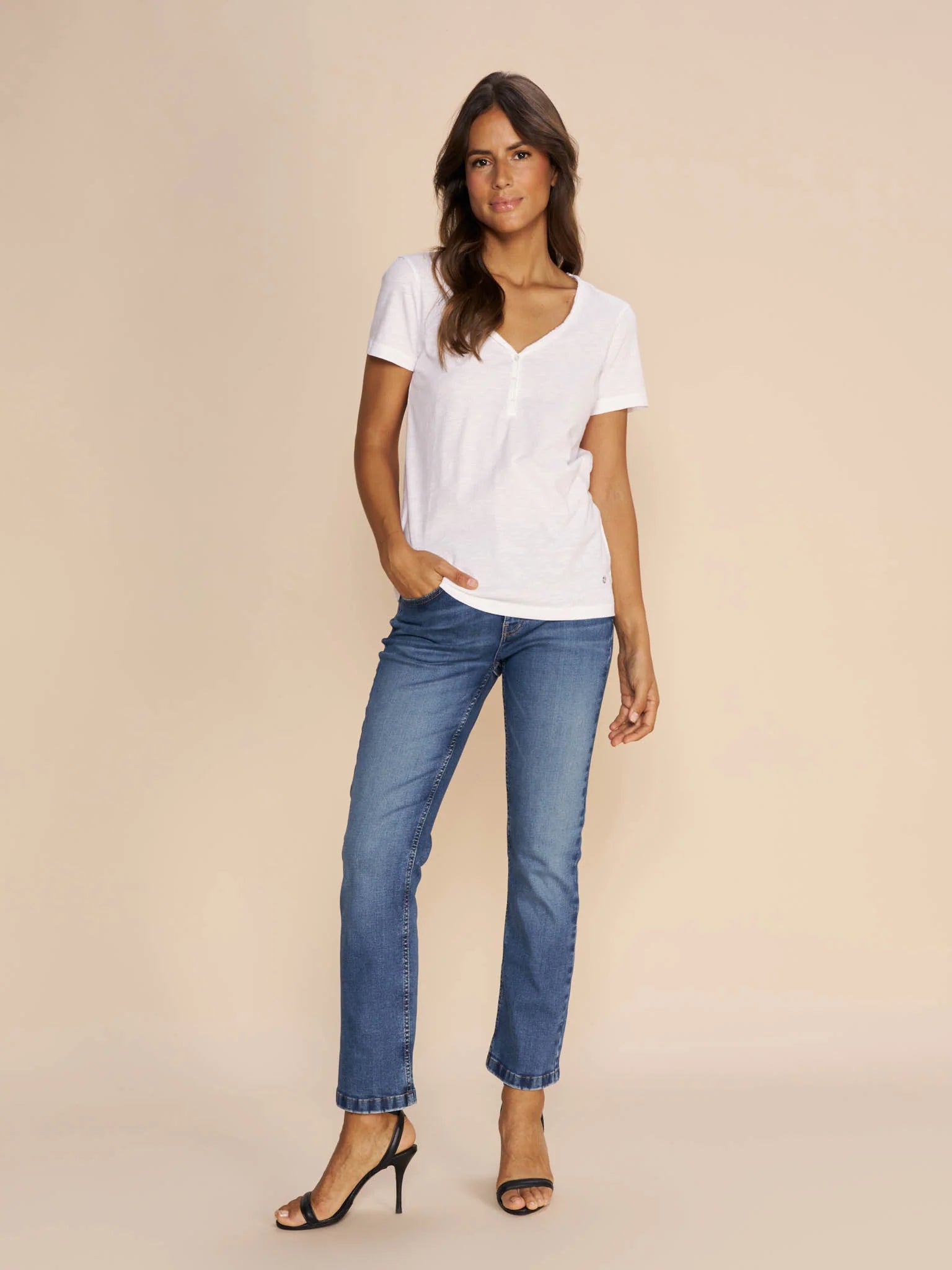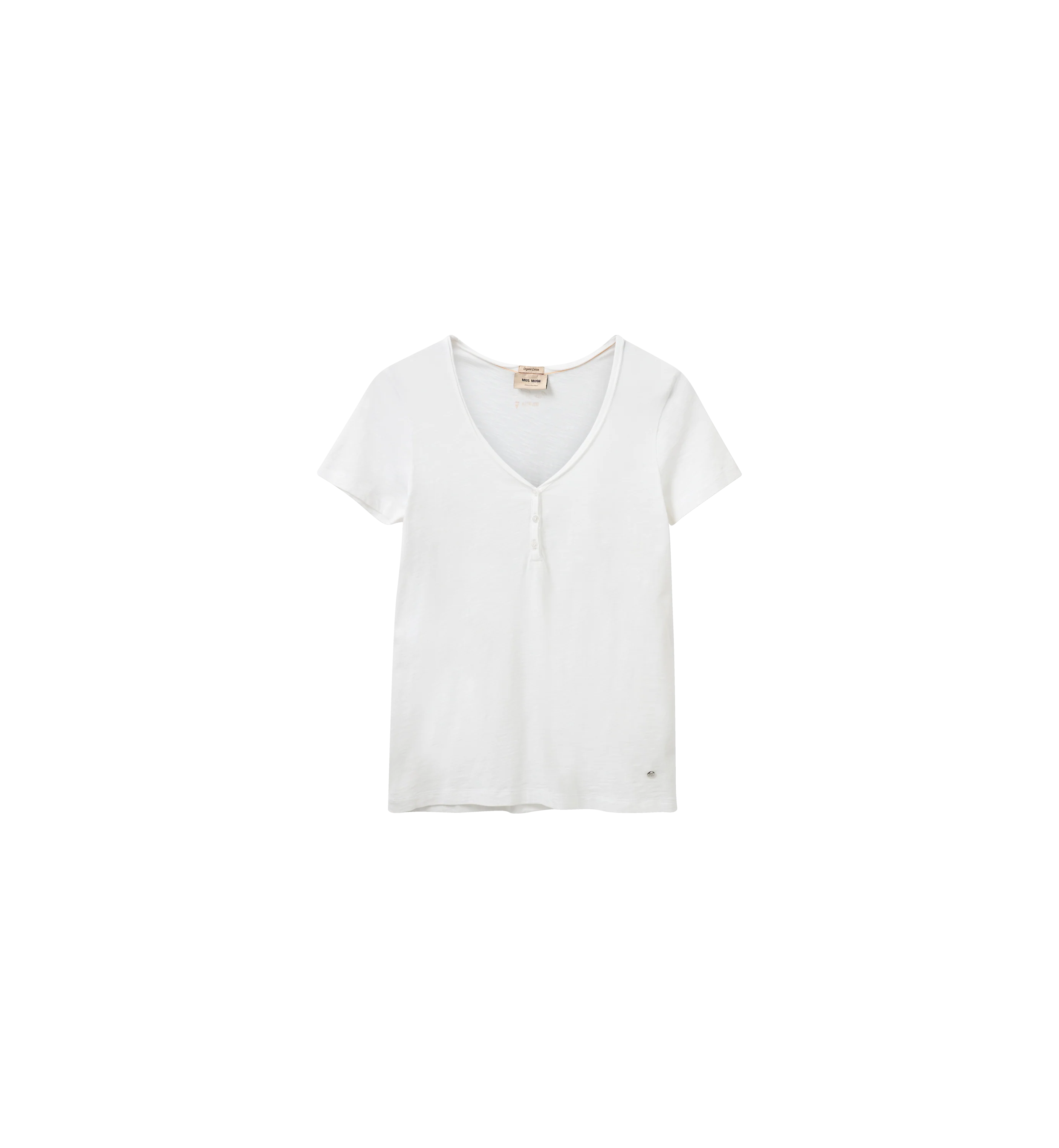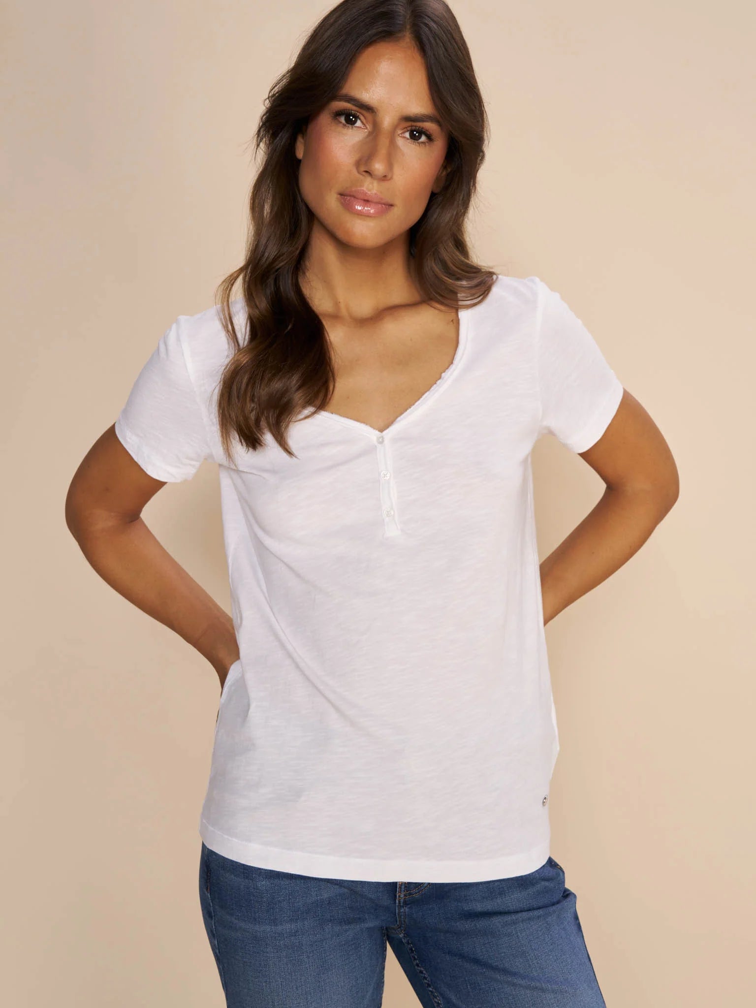 The ultimate everyday tee. This top can be thrown on with jeans or relaxed summer skirts for a casual look. With a wide v-neckline and button details on the chest, this simple top will become one of your favourites.