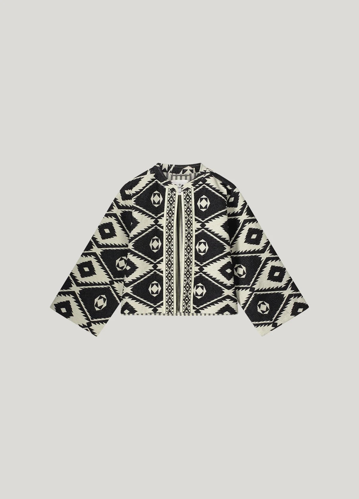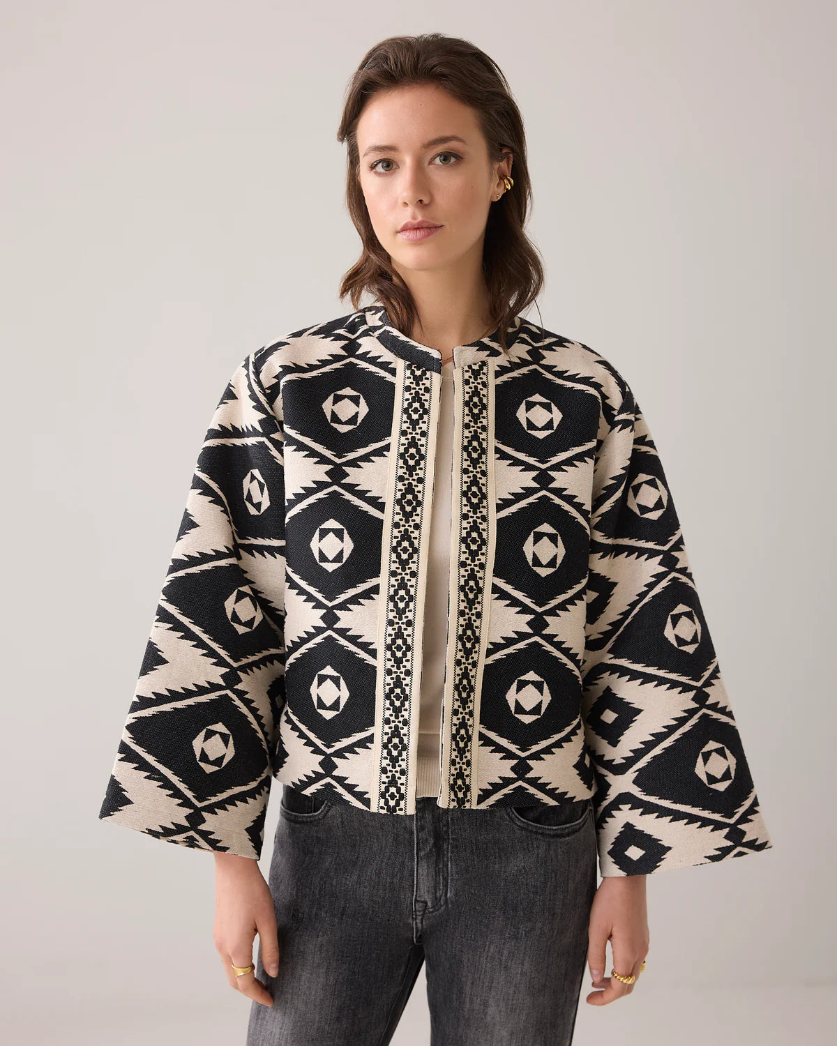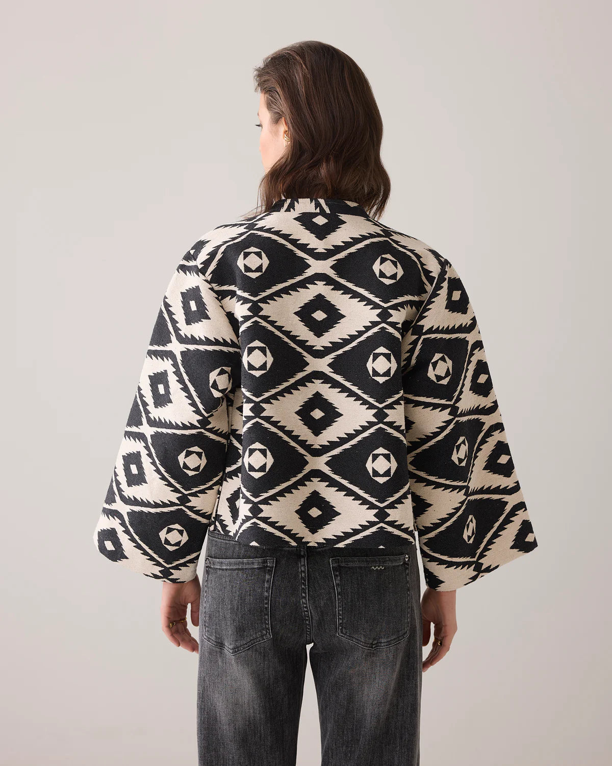 Striking and equally as stylish, this patterned jacket is made from a jacquard fabric and is inspired by the shape of a kimono. Simply throw on with a t-shirt and jeans for everyday outfits.