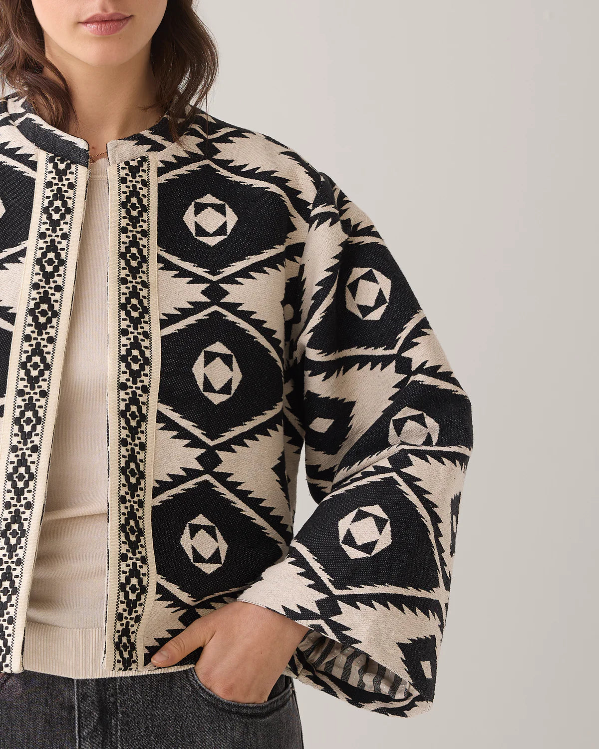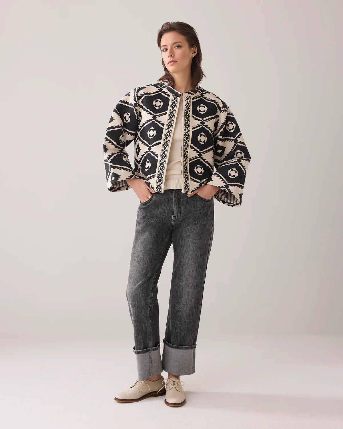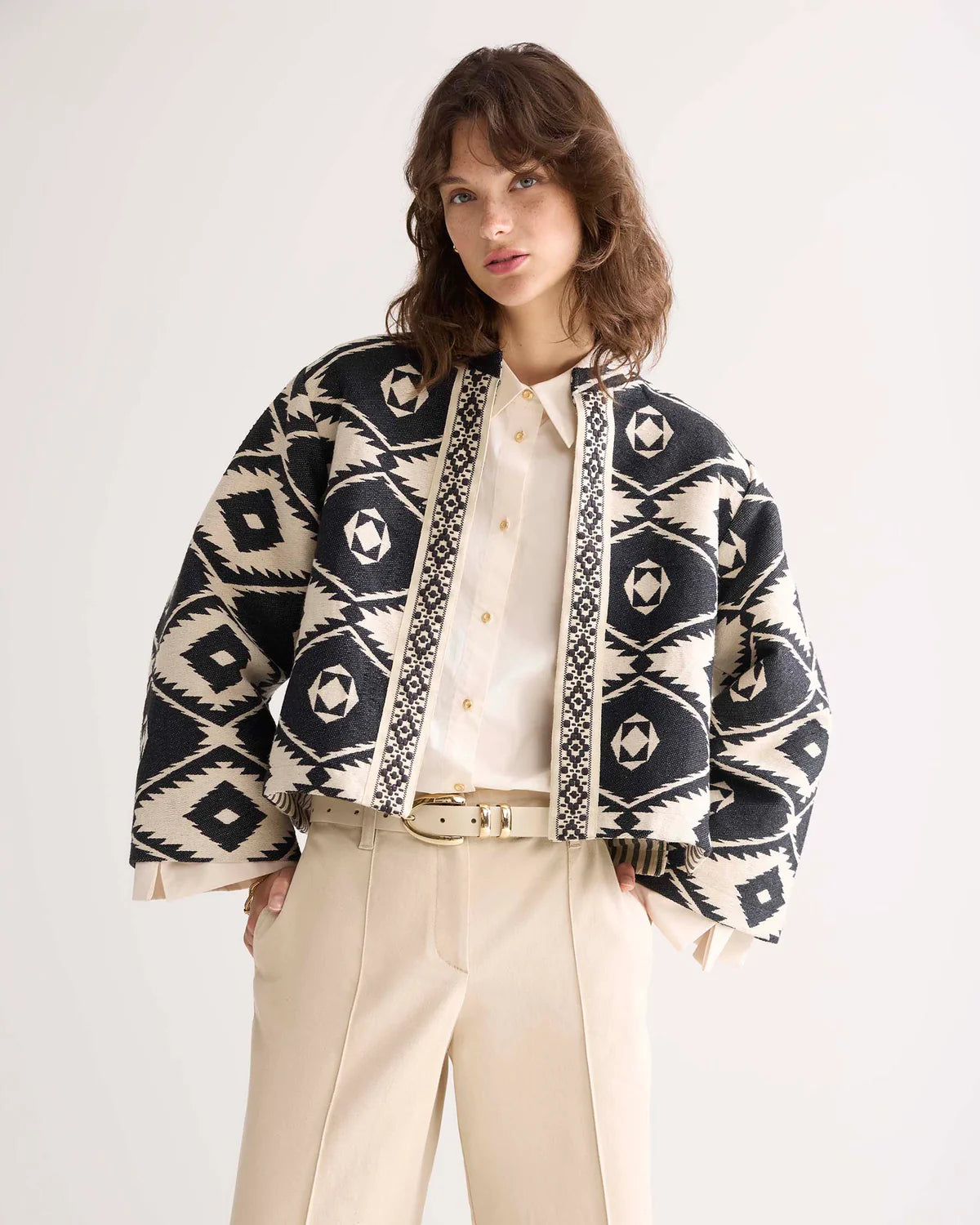 Striking and equally as stylish, this patterned jacket is made from a jacquard fabric and is inspired by the shape of a kimono. Simply throw on with a t-shirt and jeans for everyday outfits.