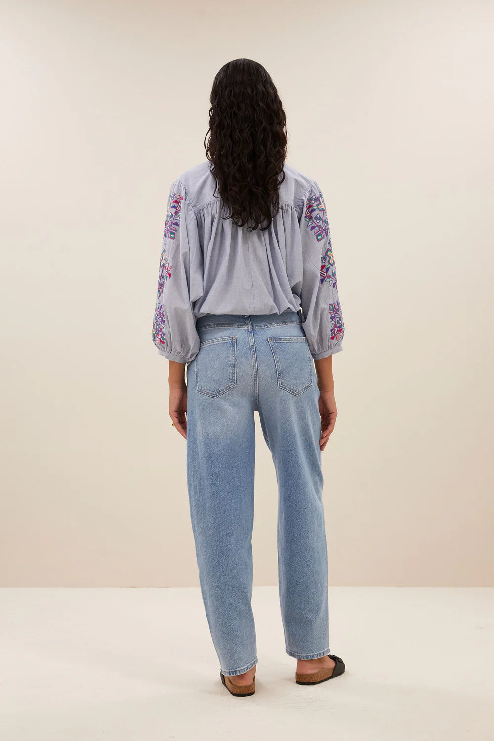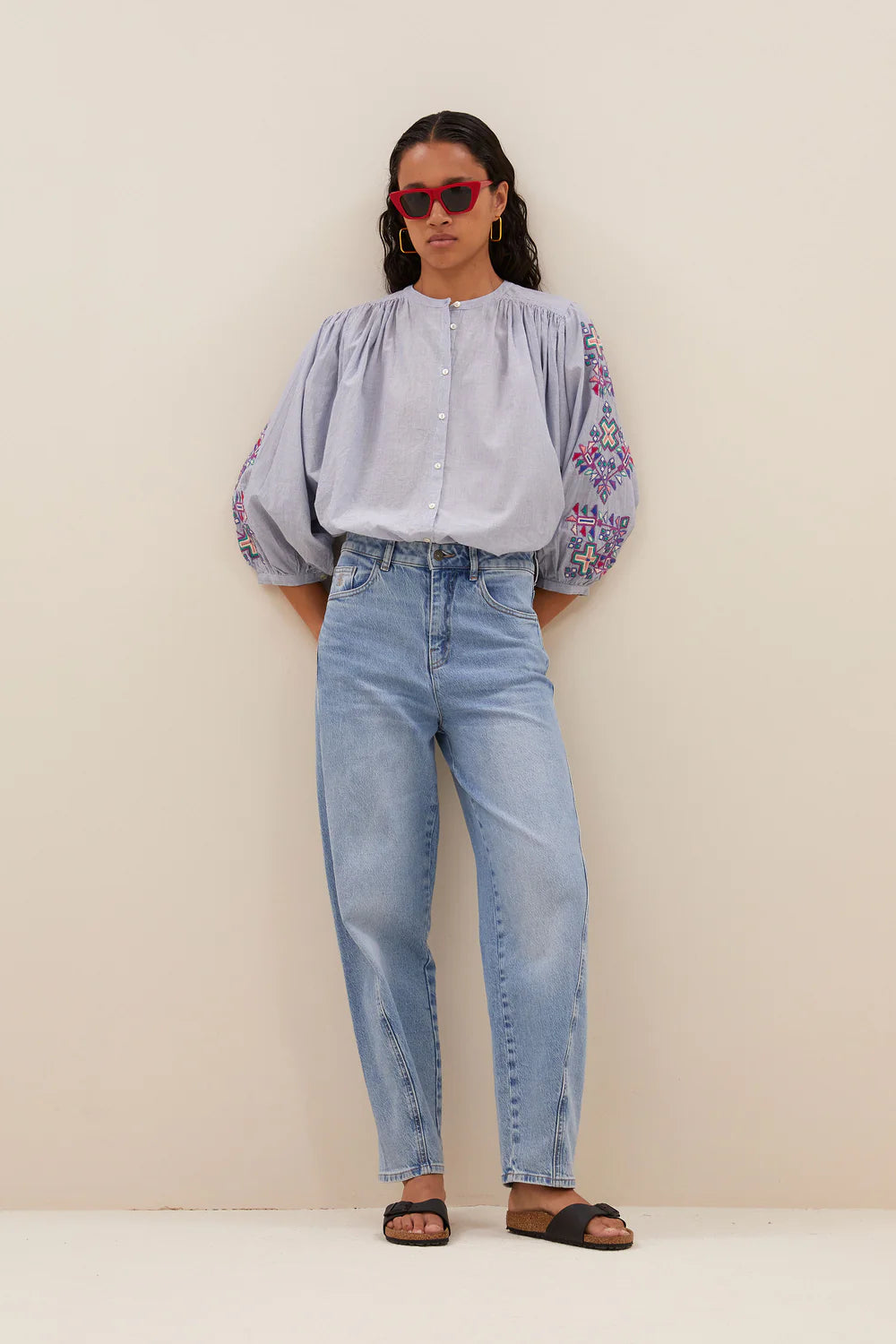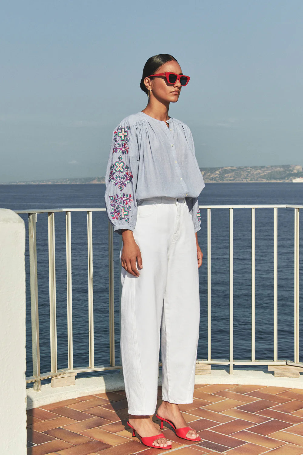 This eye-catching blouse will bring your spring style to the next level, giving you a the ultimate silhouette thanks to it's dramatic and beautiful voluminous sleeves. The detail doesn't end there though, the embroidery makes this truly unique.