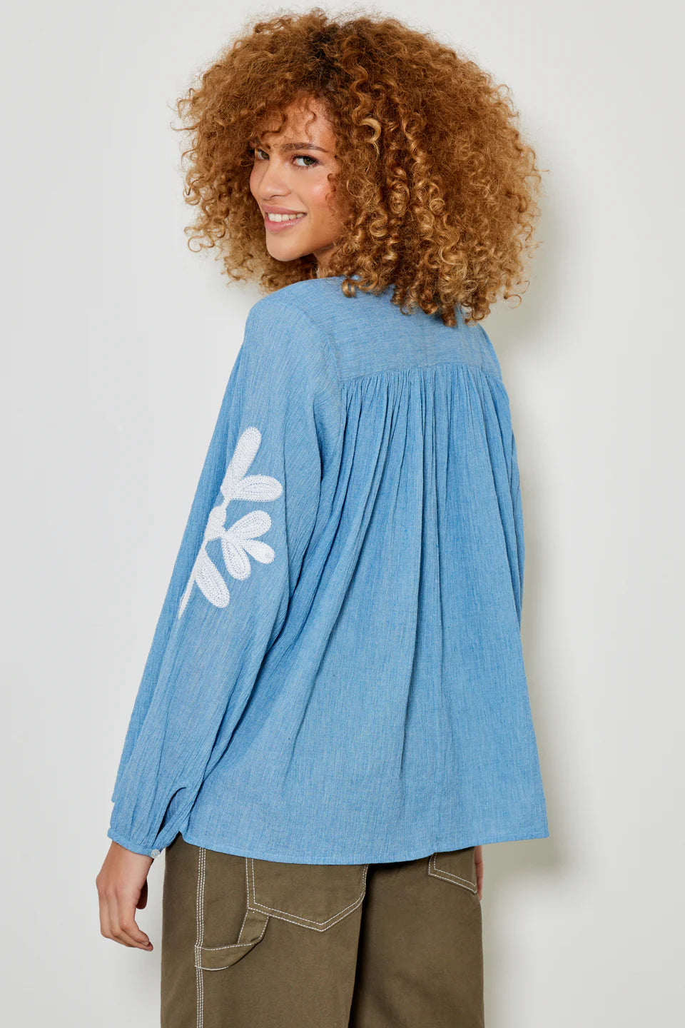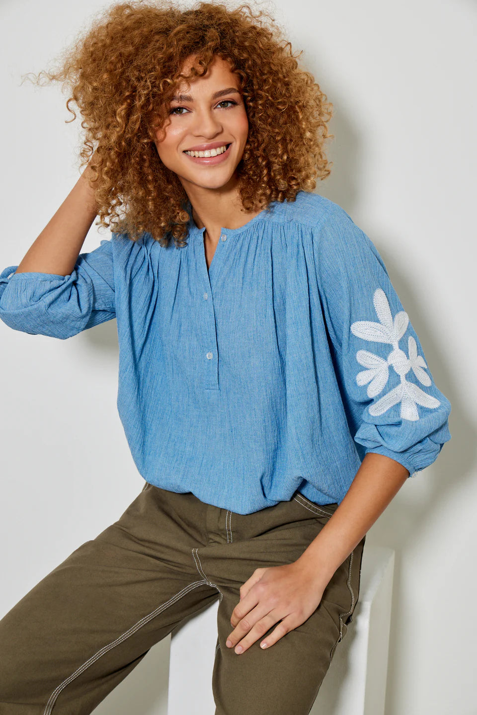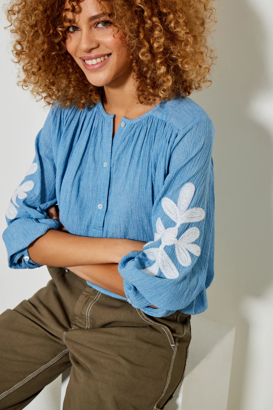 This simple blouse is the perfect style for everyday outfits. With a classic relaxed cut and long sleeves, this can be transitioned through the summer into the cooler months. The delicate embroidery adds an extra twist to this simple style. With a rounded finish on the bottom, this blouse looks great with jeans for a contemporary look.
