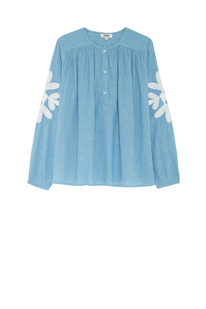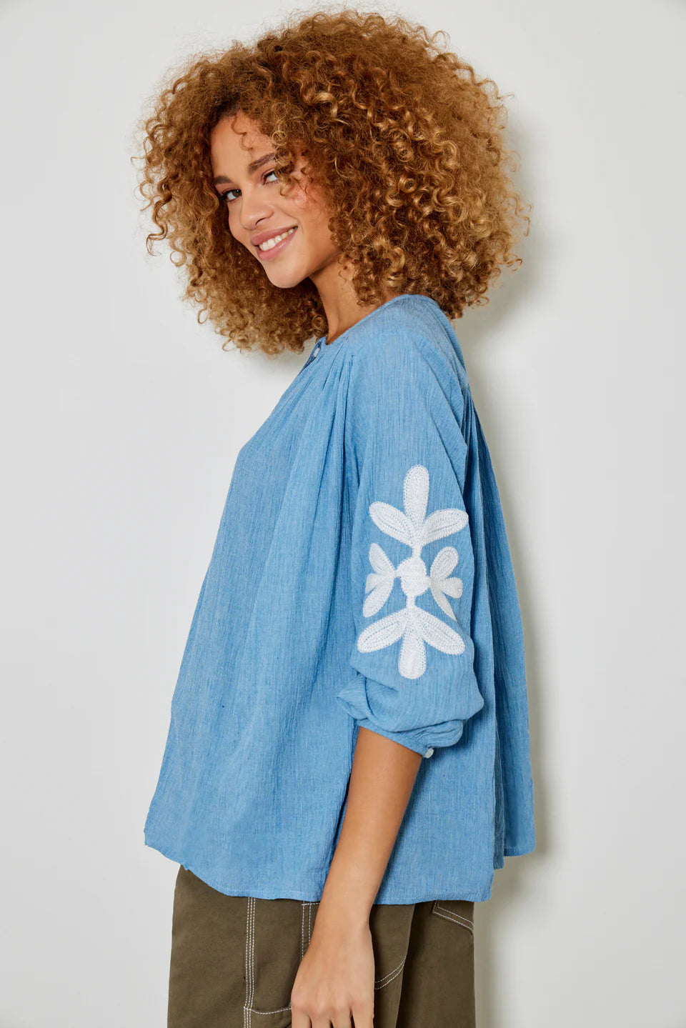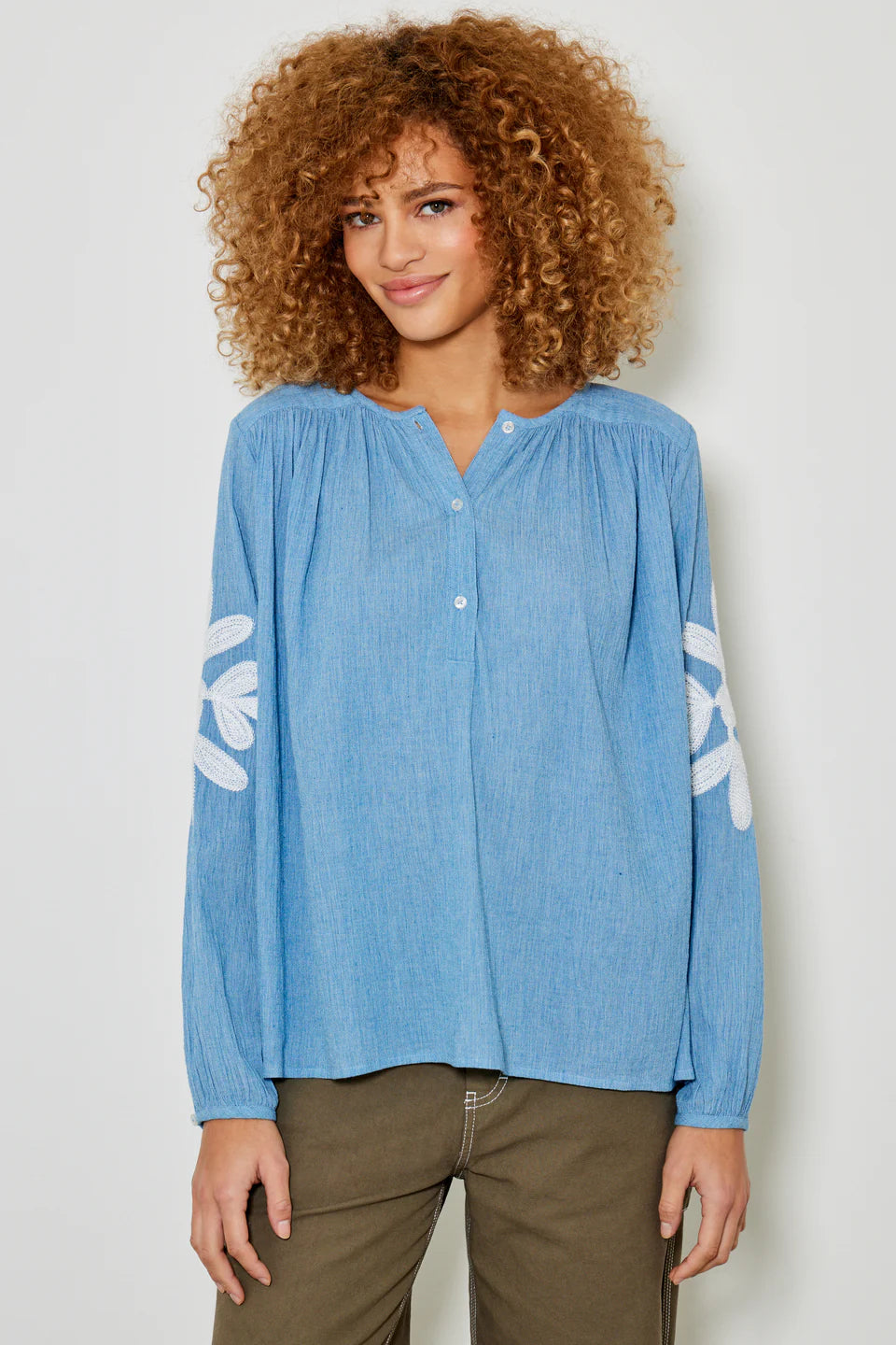 This simple blouse is the perfect style for everyday outfits. With a classic relaxed cut and long sleeves, this can be transitioned through the summer into the cooler months. The delicate embroidery adds an extra twist to this simple style. With a rounded finish on the bottom, this blouse looks great with jeans for a contemporary look.