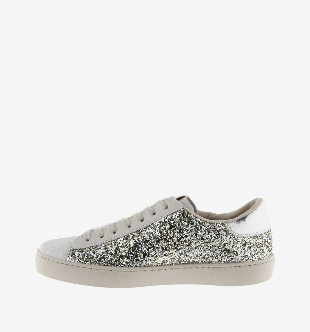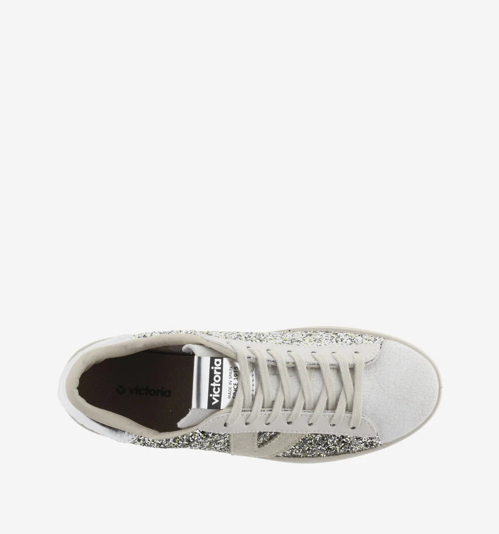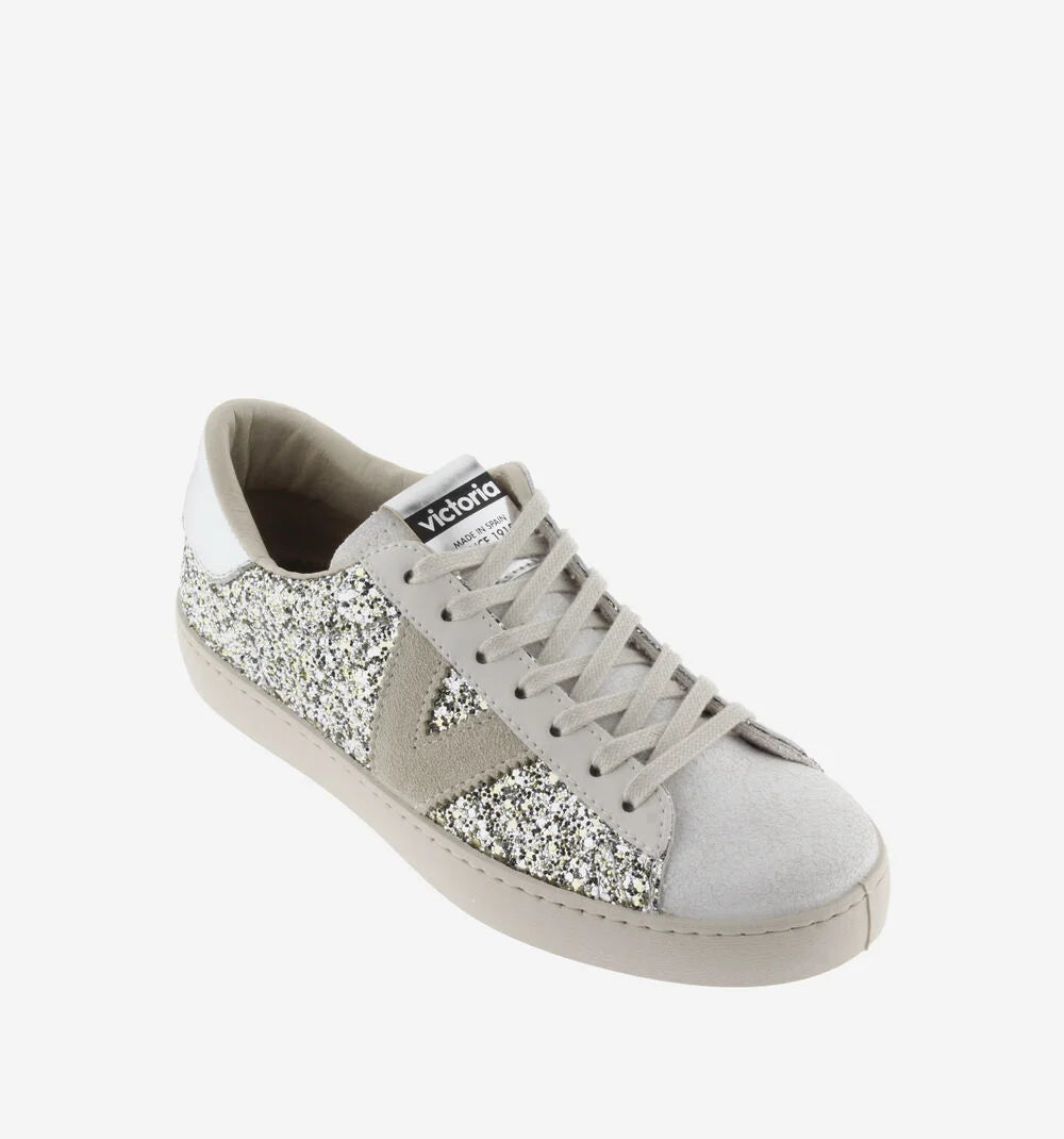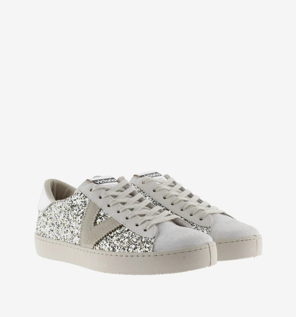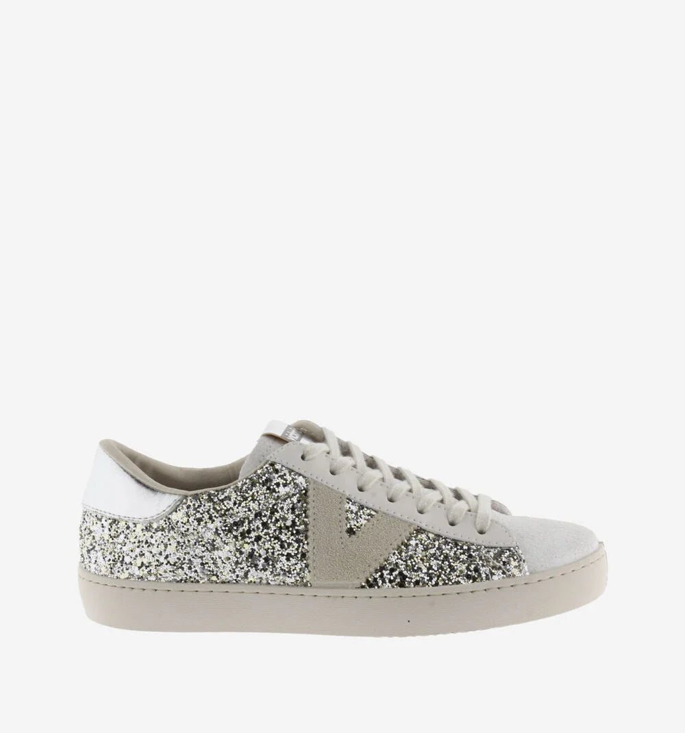 Get ready to dazzle in these silver glitter sneakers. In a classic plimsole shape, these trainers can finish off any simple outfit with sparkle. The trademark Victoria logo gives these super sparkly shoes a casual finish.