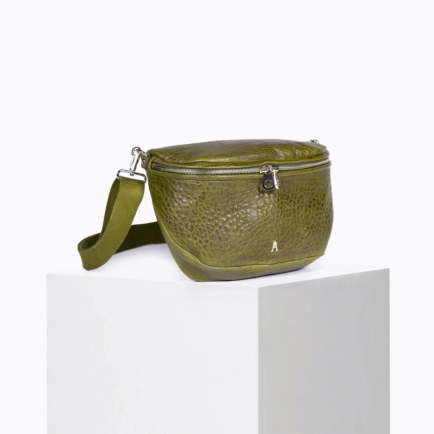 Crafted from premium lambskin leather, this stylish and functional bag features a unique bubble texture and a rich olive colour, perfect for adding a twist to any outfit. It's spacious interior provides room for all your essentials making it the perfect bag for daily errands, travel or casual outings.