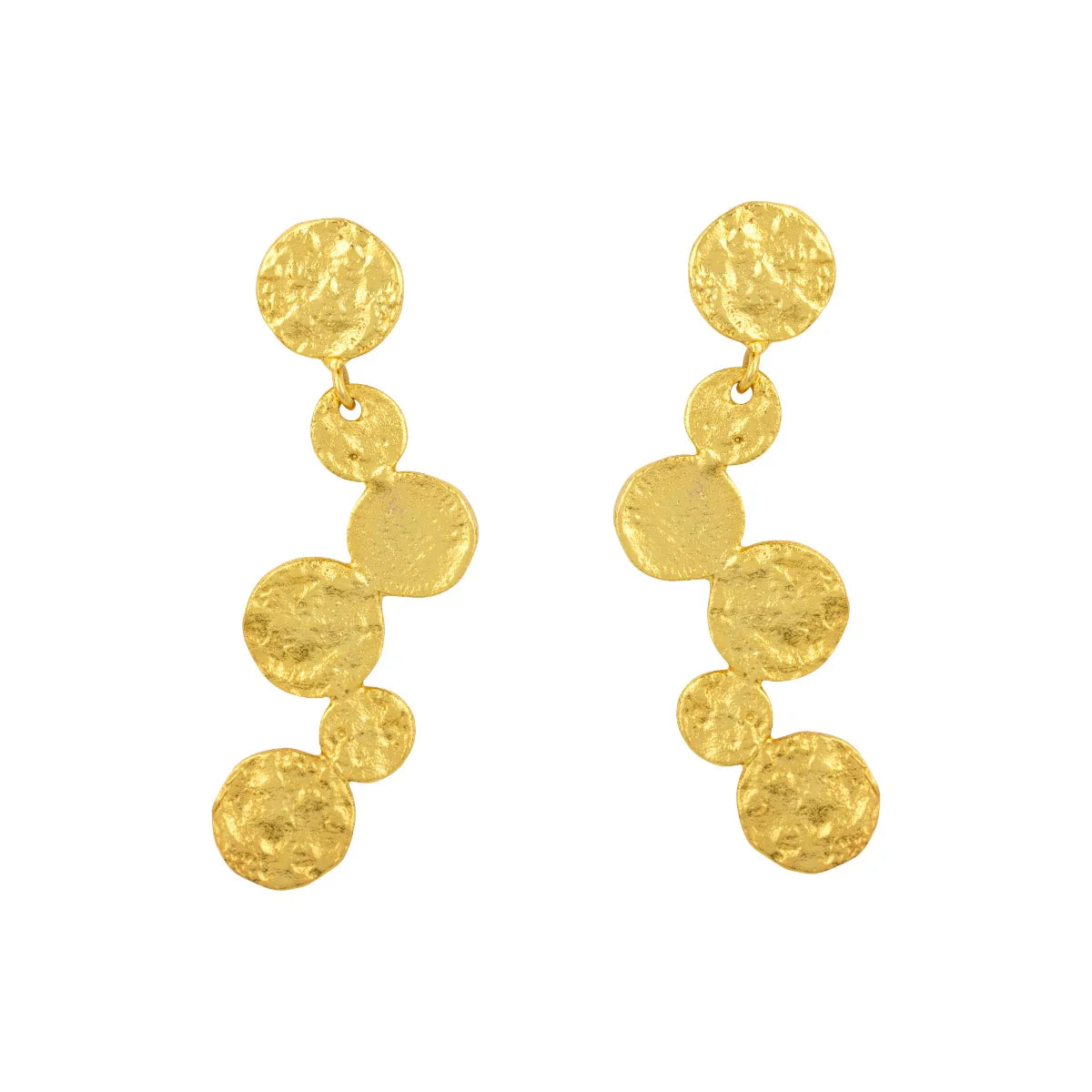 These earrings are hand-crafted with a gold, beaten bubble effect. In a statement drop design, these earrings can dress up a simple outfit with their striking gold colour and design.