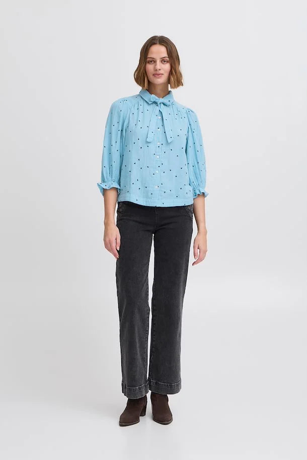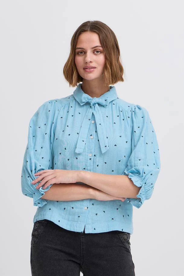 Sophisticated but equally playful, this beautiful shirt will add some youthful energy to any classic work wear look. With puffed sleeves and a necktie bow, this shirt has an all over heart print which we LOVE! Simple pair with some easy jeans for everyday events or dress up with a blazer and suit trousers for work.