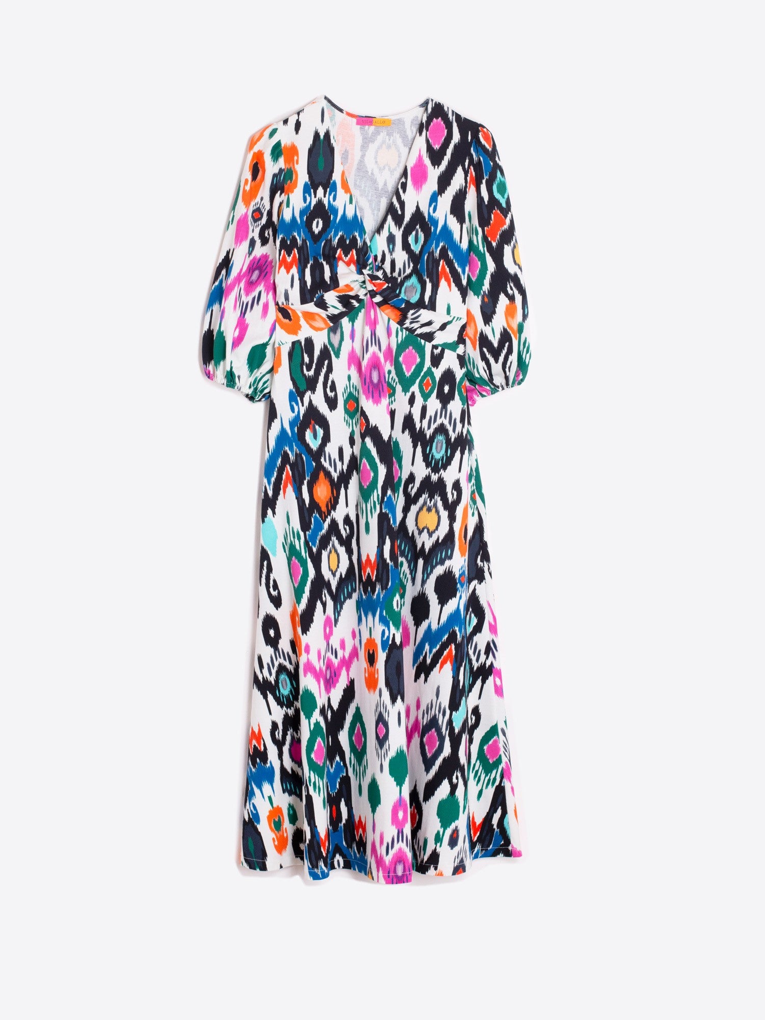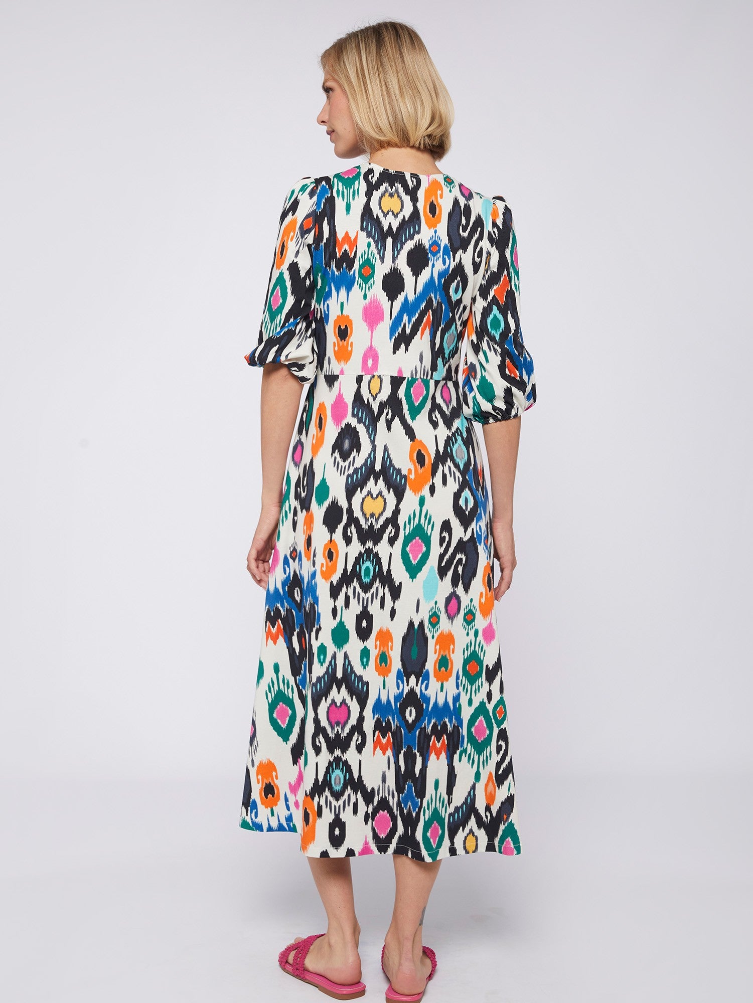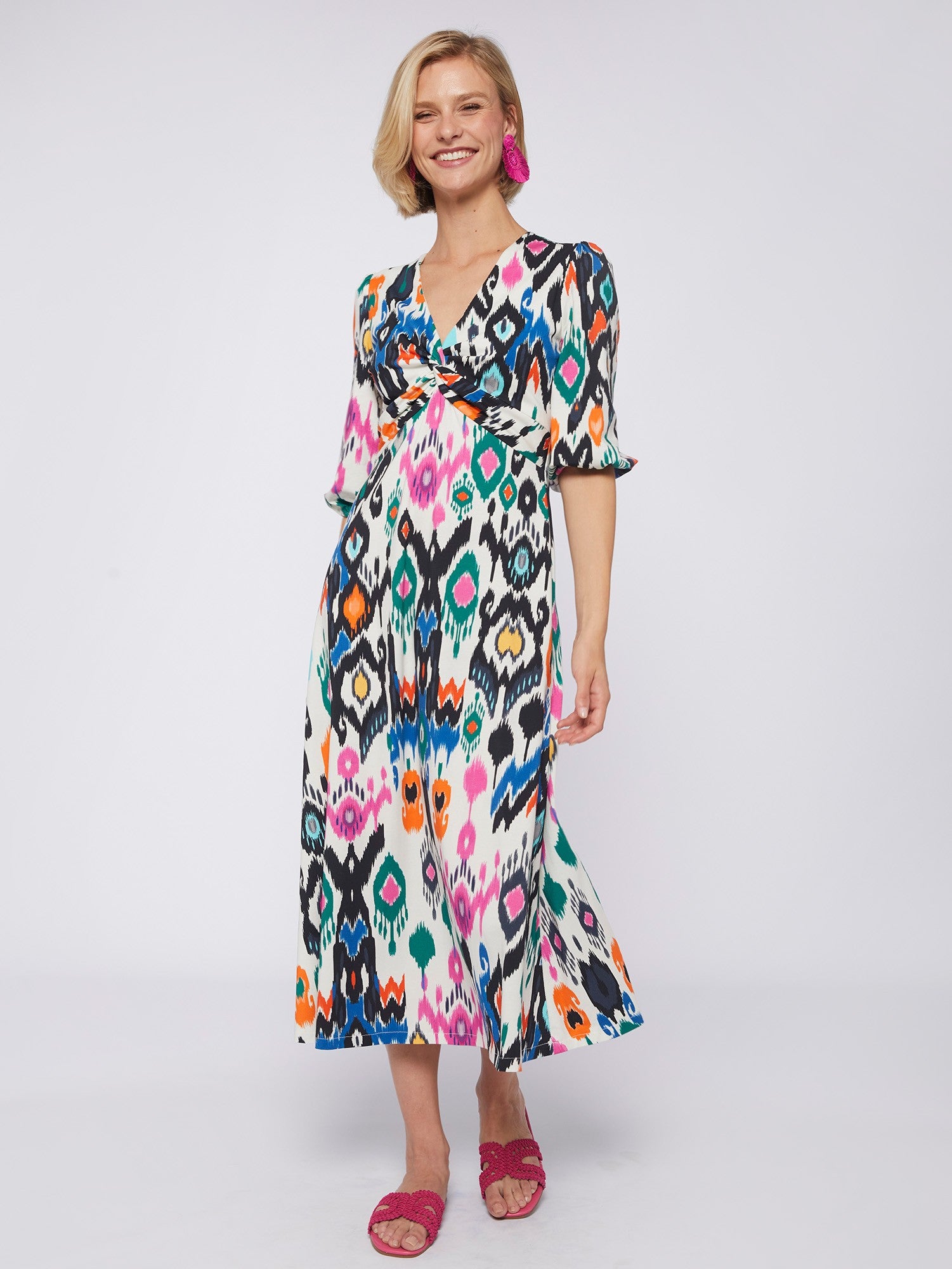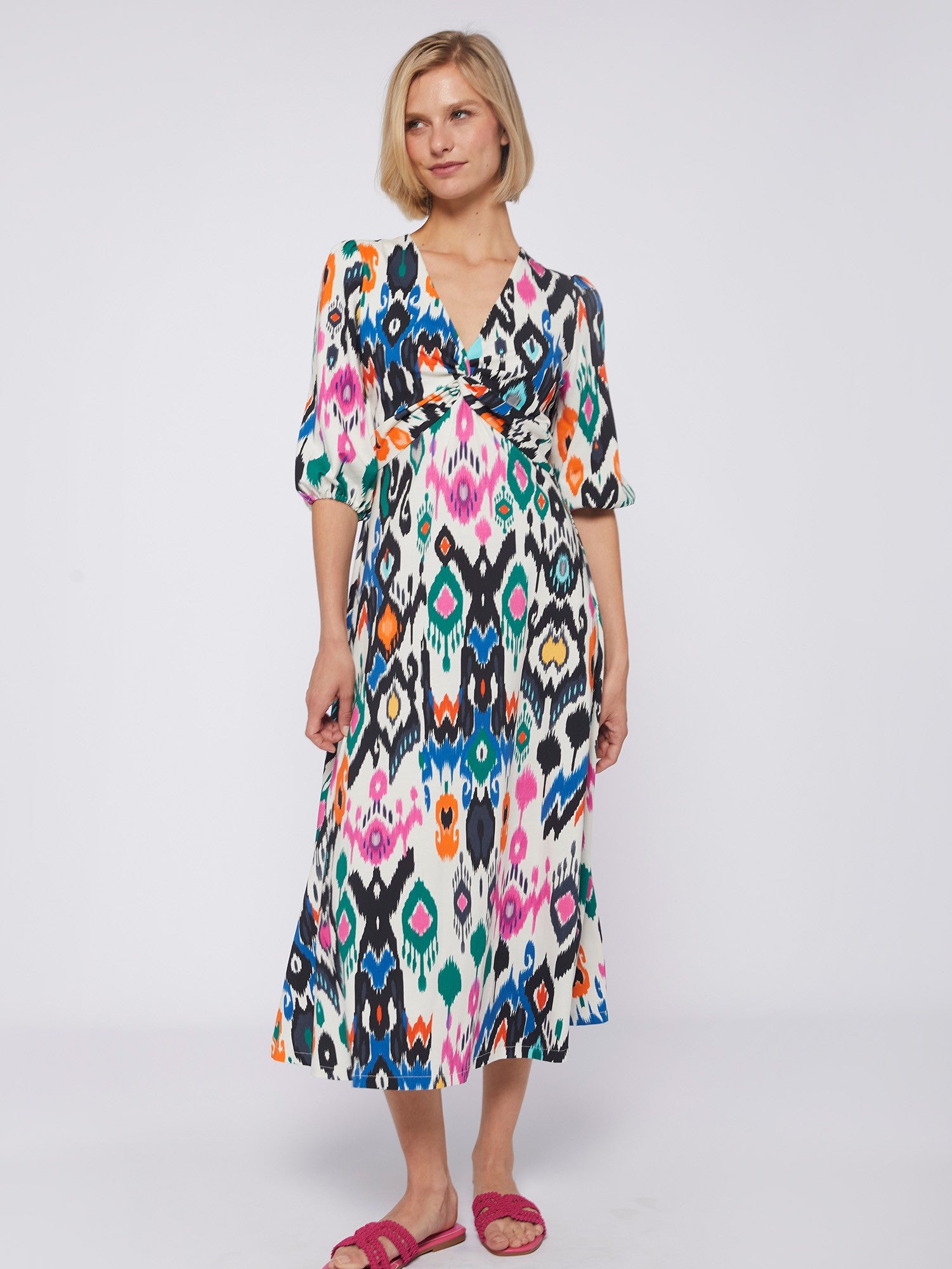 Get ready to turn heads in our Carolina Dress, featuring a playful multicoloured ikat print! This dress is sure to add a touch of fun to your wardrobe with its midi length and elastic knit fabric, perfect for staying comfortable but stylish. Dress it up with some killer sandals or keep it casual with some sleek pumps.