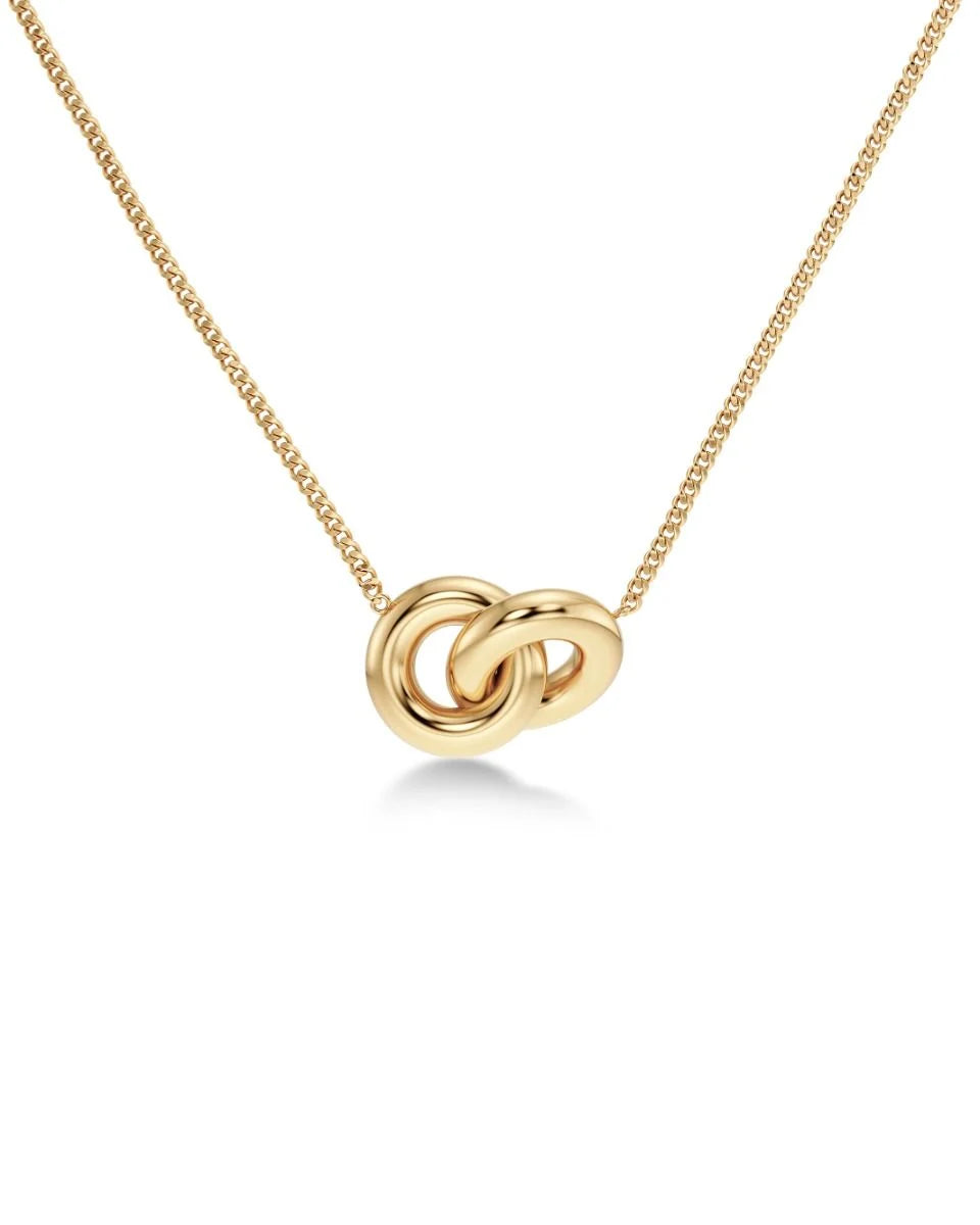 This necklace is an absolute must-have, with two rounded pendants that are connected infinitely. With soft curb link chains, this necklace can be worn everyday as a simple piece, or layered for a statement look.
