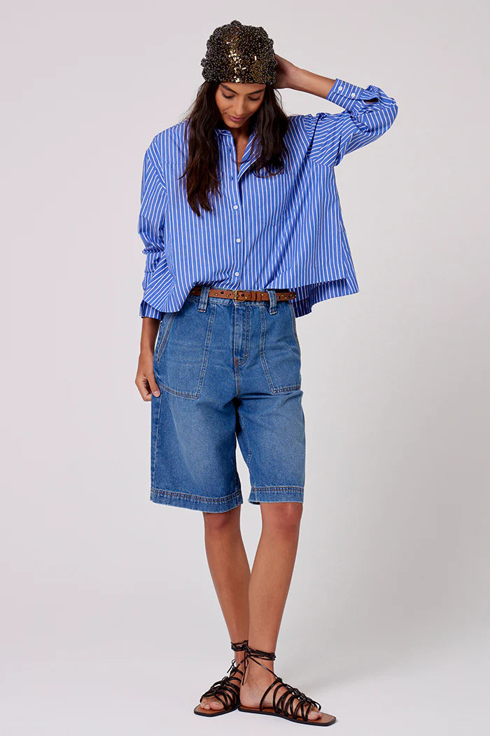 This straight cut shirt is a wardrobe essential, with a button up front and classic collar, this shirt couldn't be more timeless. We especially love this when paired with a pair of white pants and tan sandals for that chic look.