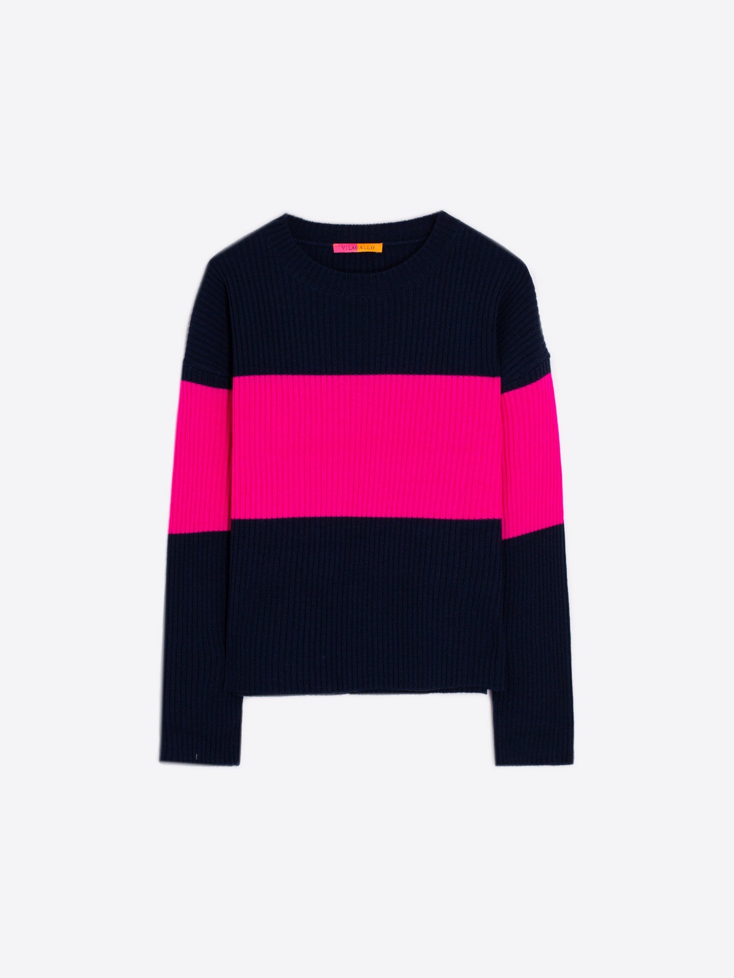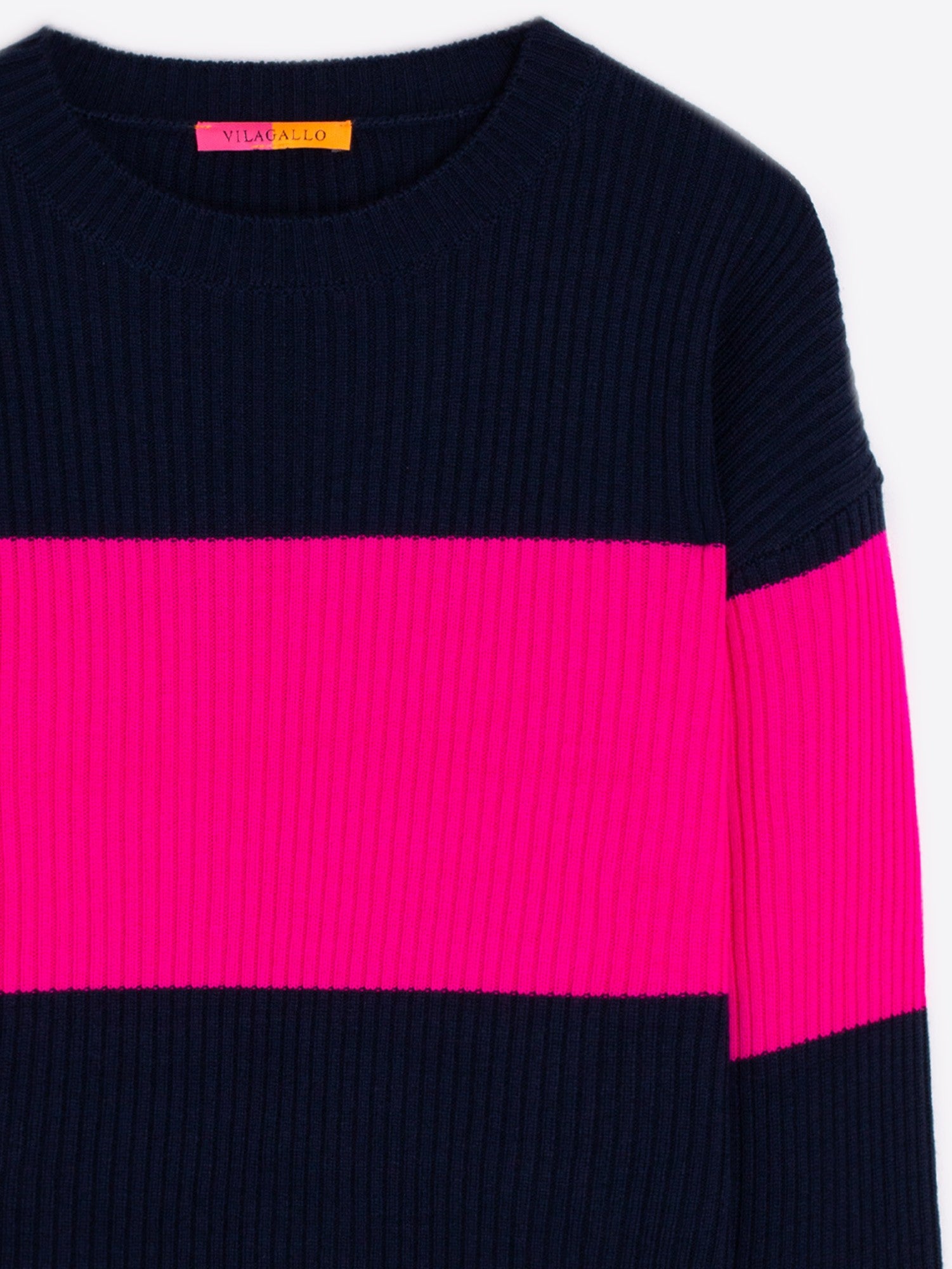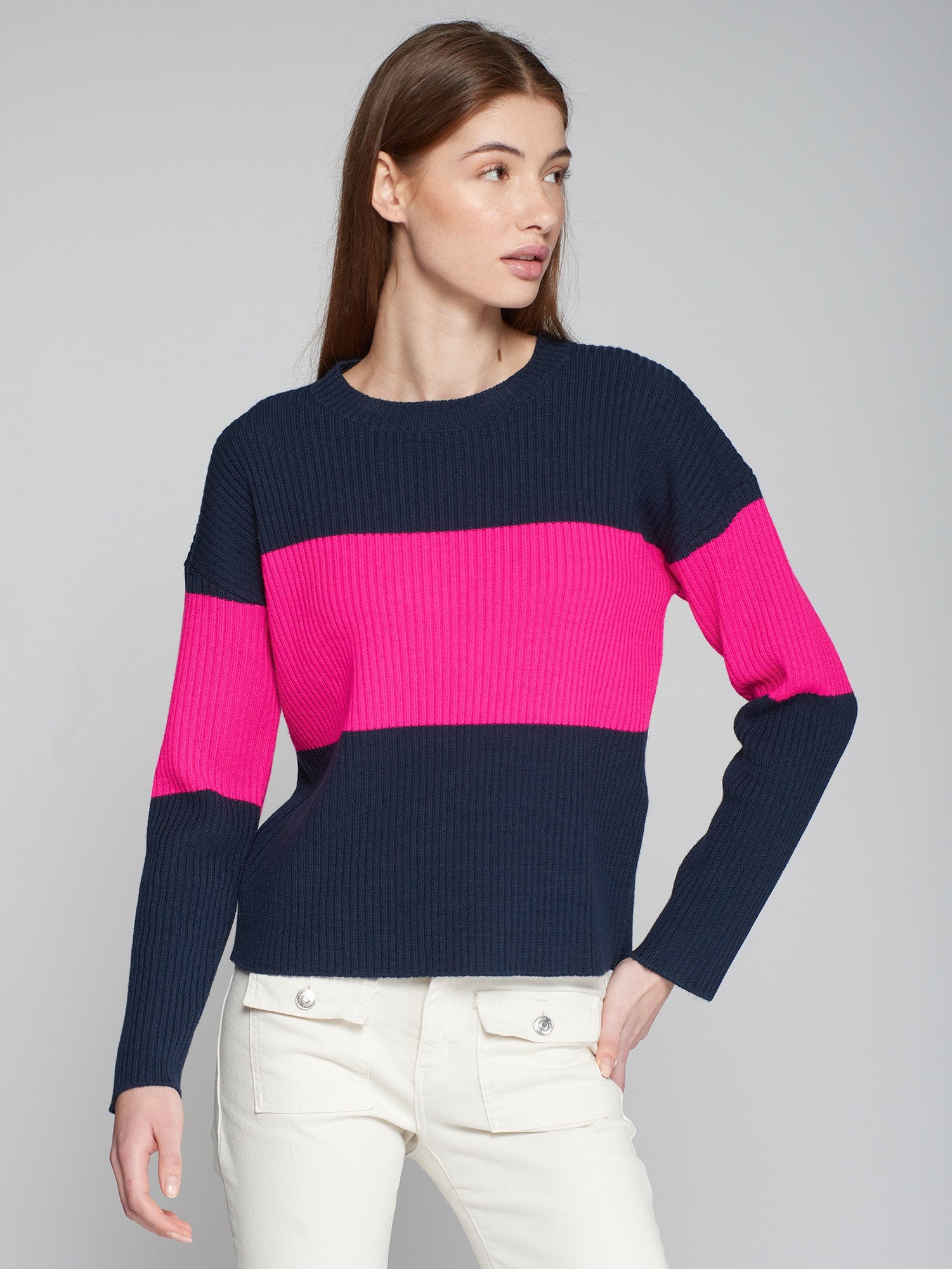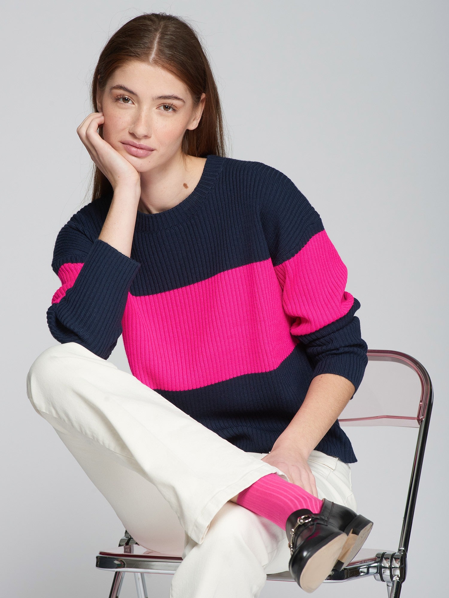 This cosy pullover features a colour blocked stripe in a striking fuchsia pink. The crew neckline and ribbed effect keep this jumper classic in shape, sure to stay in fashion year after year.