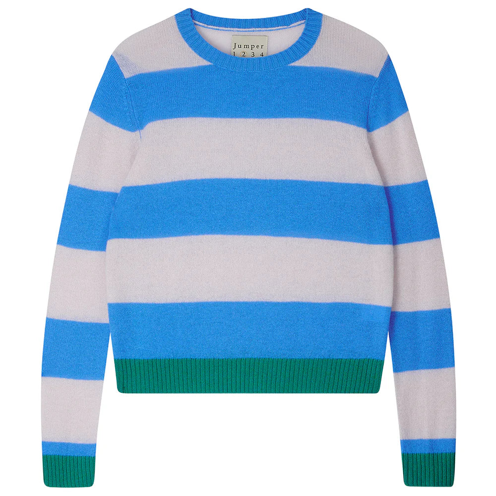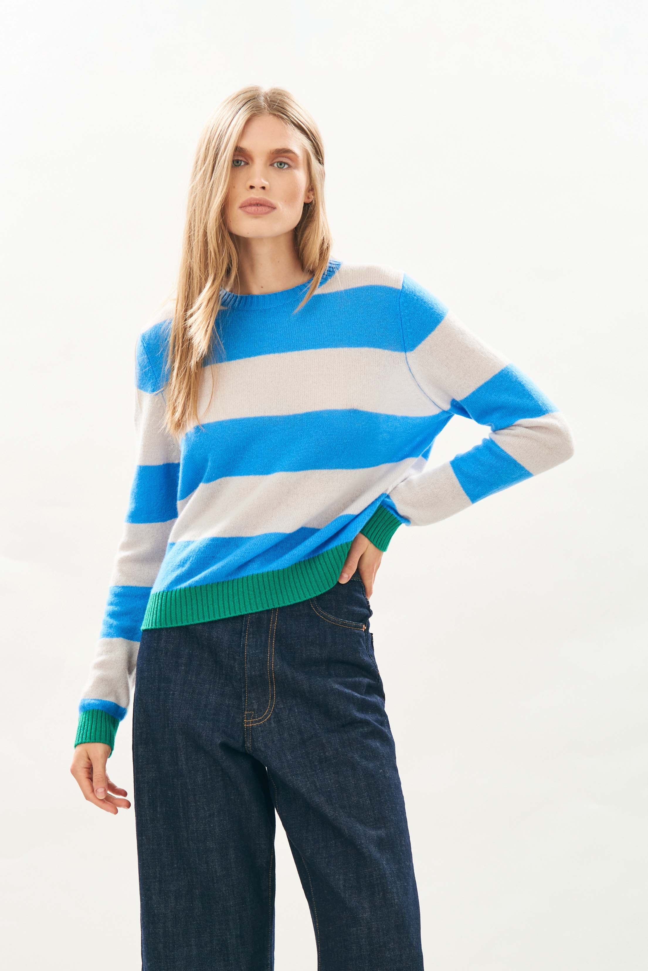 Stand out in style with our fashionable Contrast Stripe Crew. The bright and vibrant colors of sky and emerald bring a pop of color to any outfit. Made with a super soft cashmere, this crew provides both comfort and fashion in one.