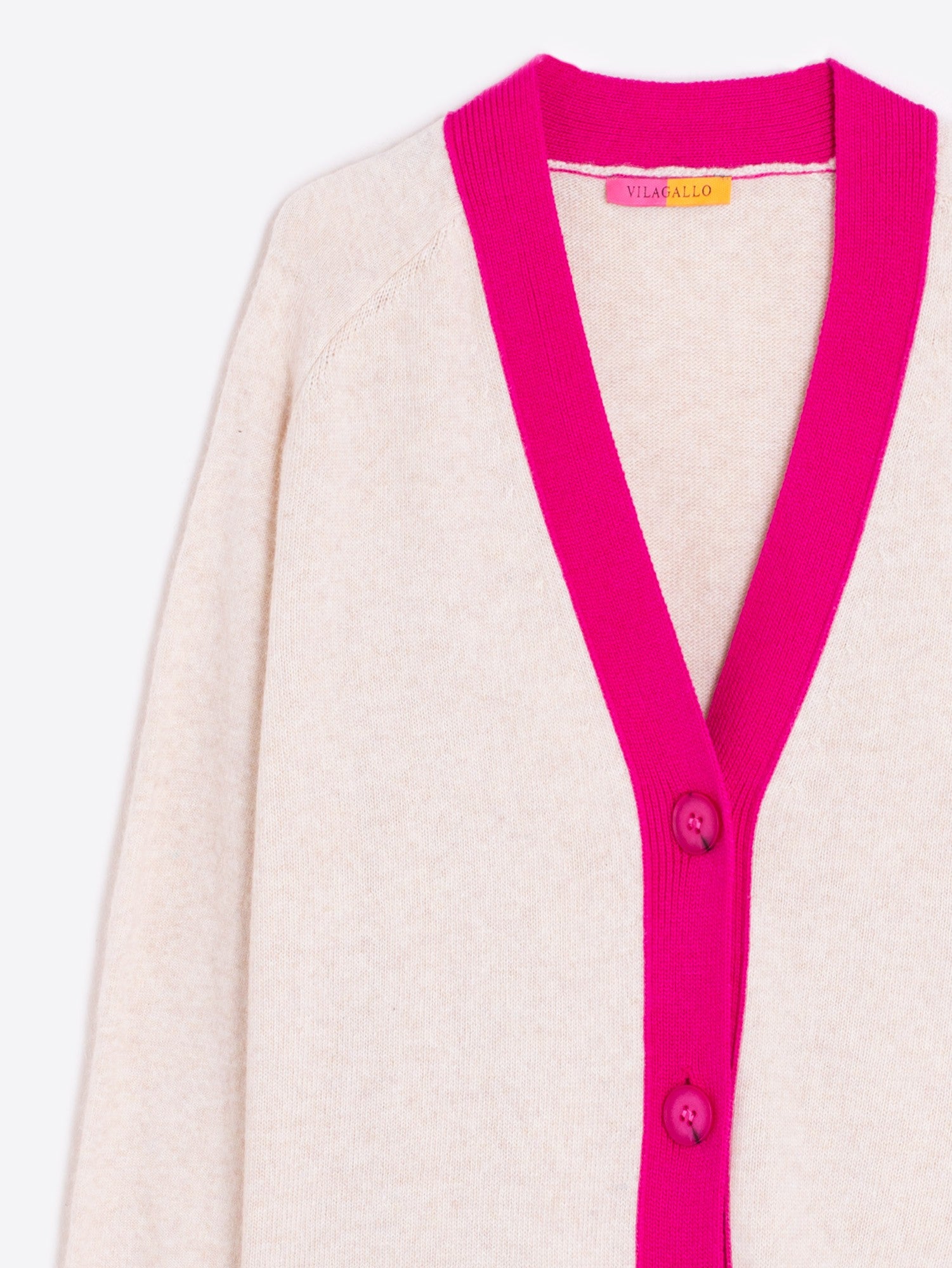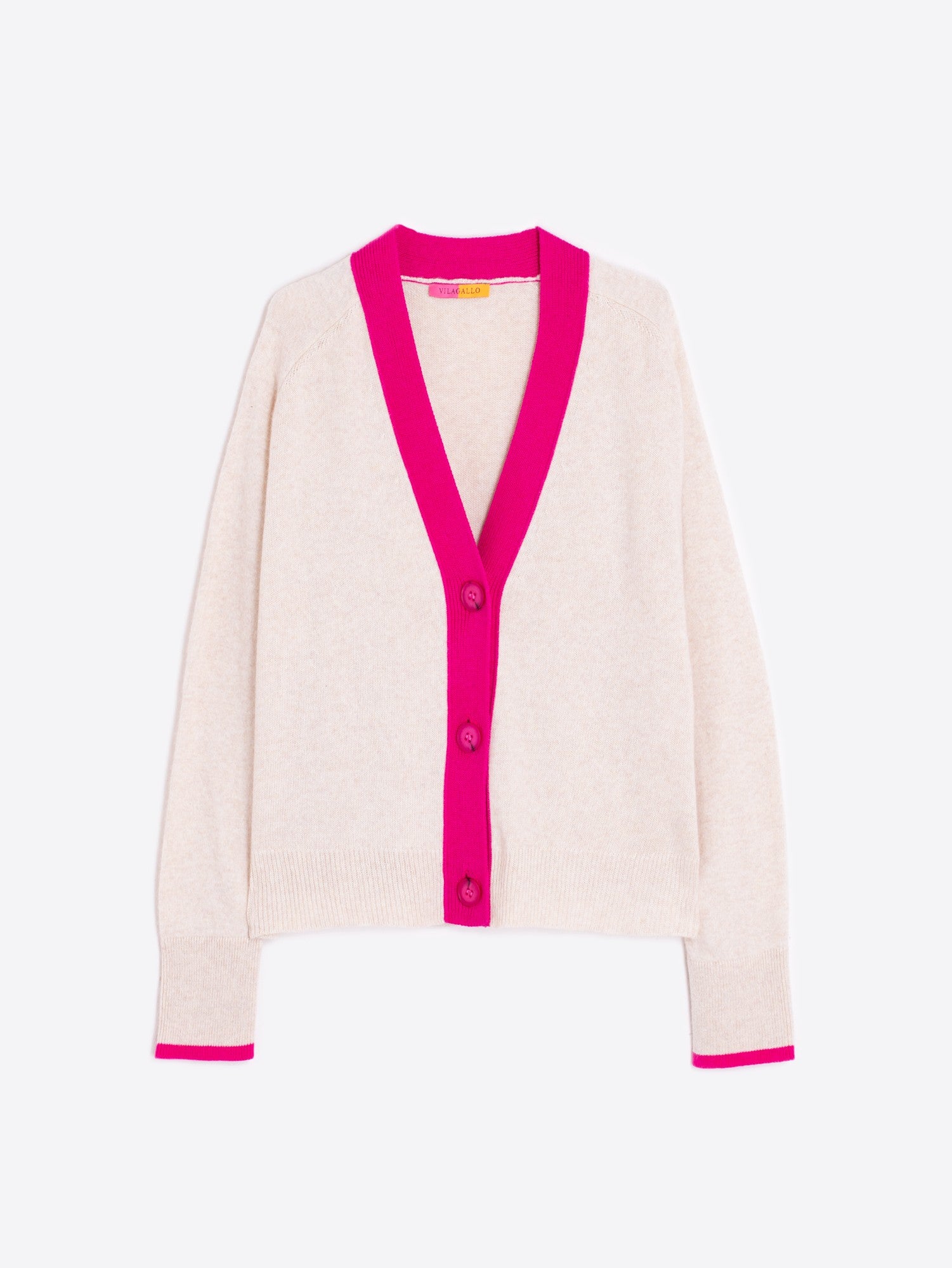 Stay warm and stylish with the fashionable Corto Cardigan in Ecru/Fuchsia. This off white cardigan features striking fuchsia details for a pop of colour. Made with cosy material, it's perfect for any winter occasion.