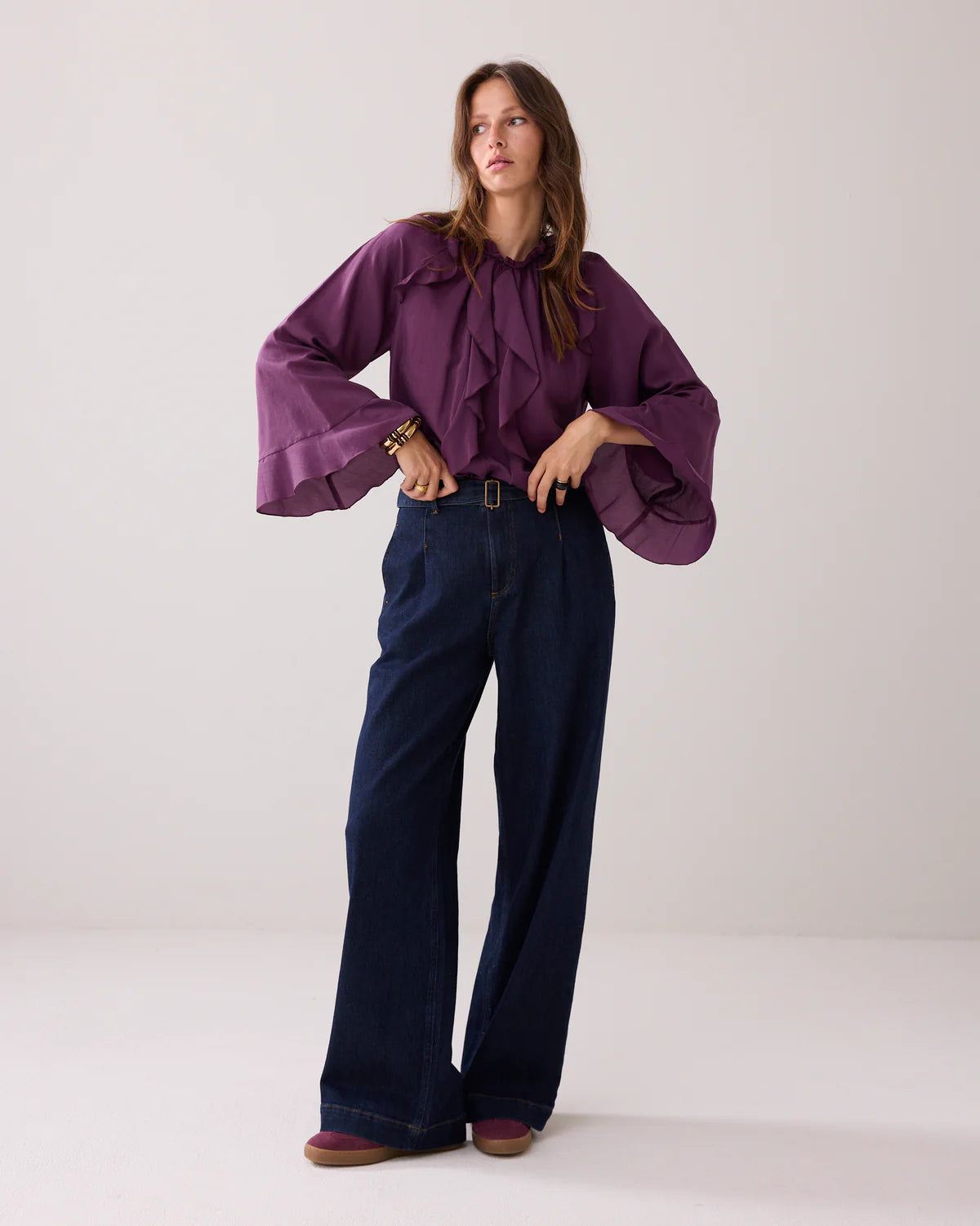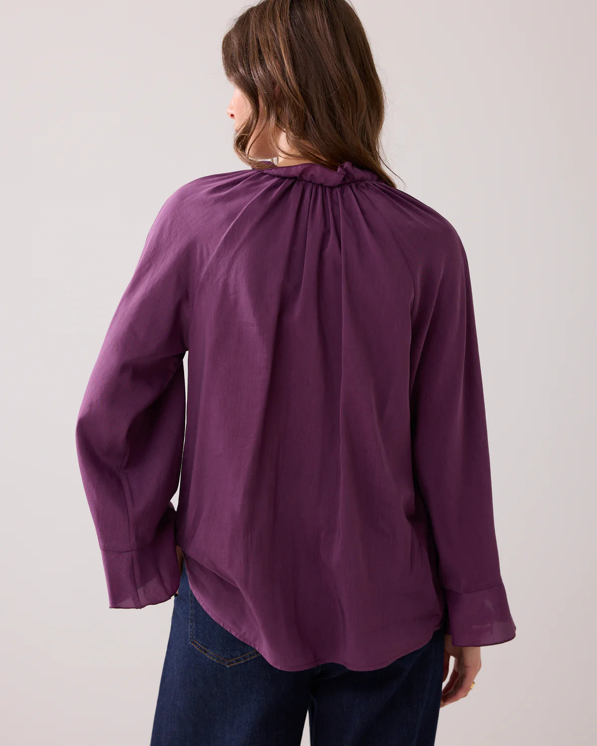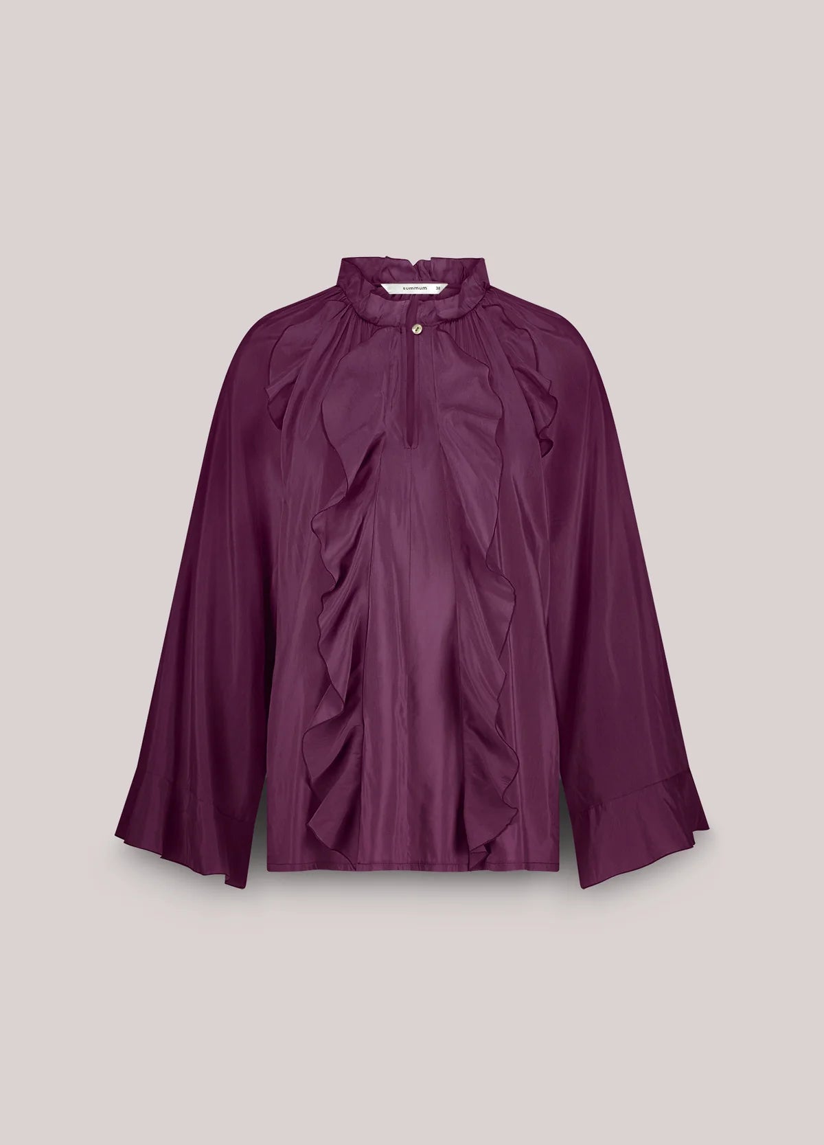 Romantic with a modern edge, this blouse is all about the details. The stand-up collar is trimmed with delicate ruffles, echoed by flared sleeves and soft frills that run through the front. Crafted from a shiny-effect fabric in a rich winter plum shade, it catches the light beautifully with every move.