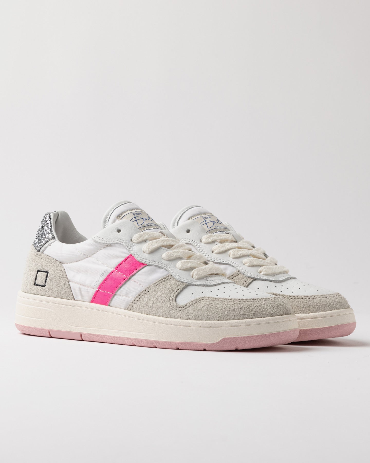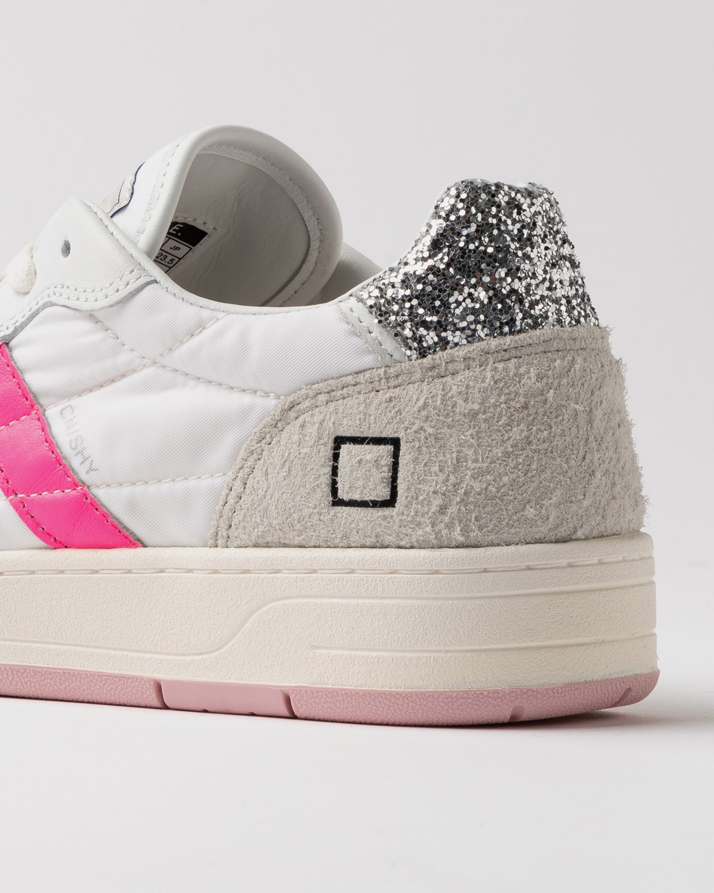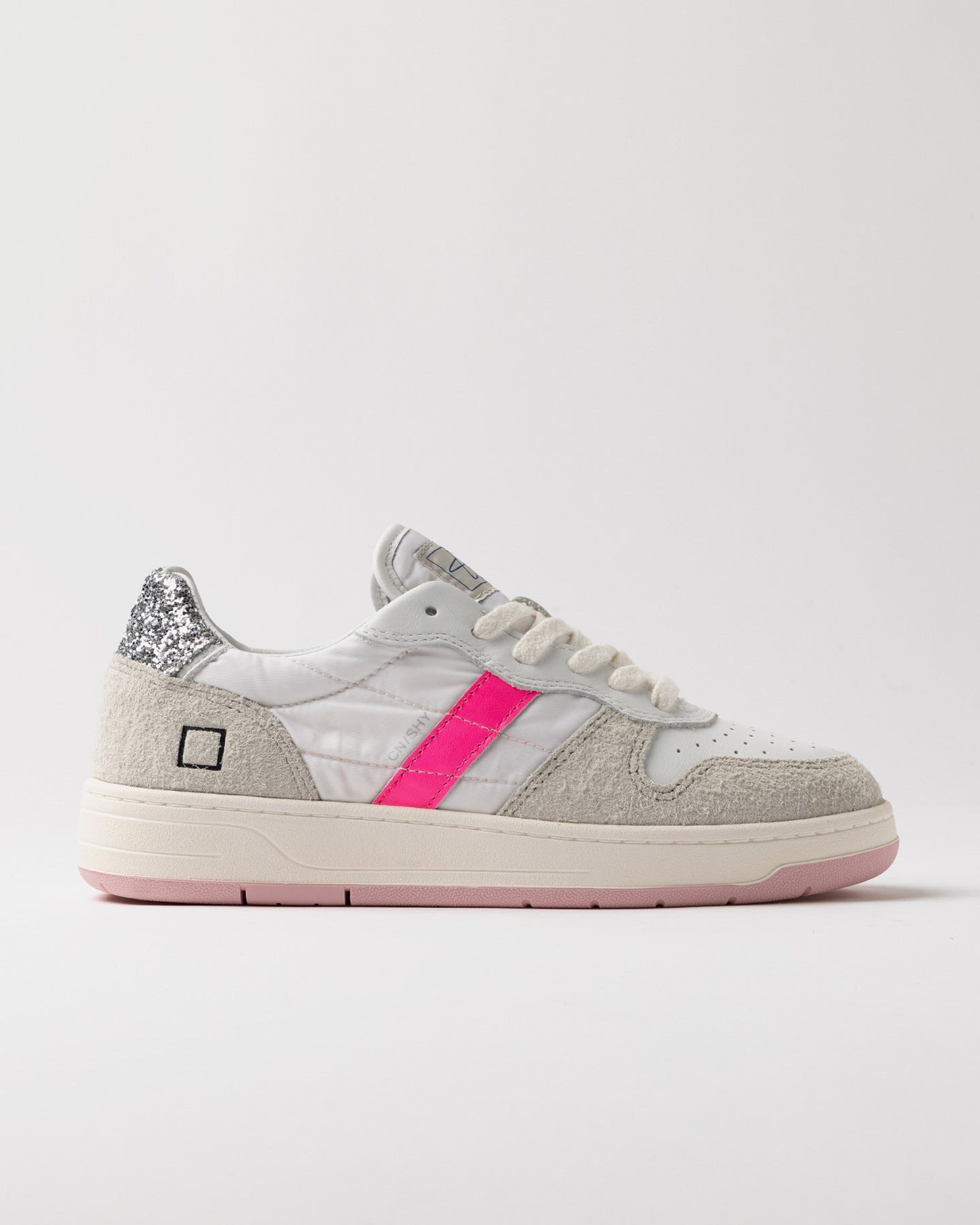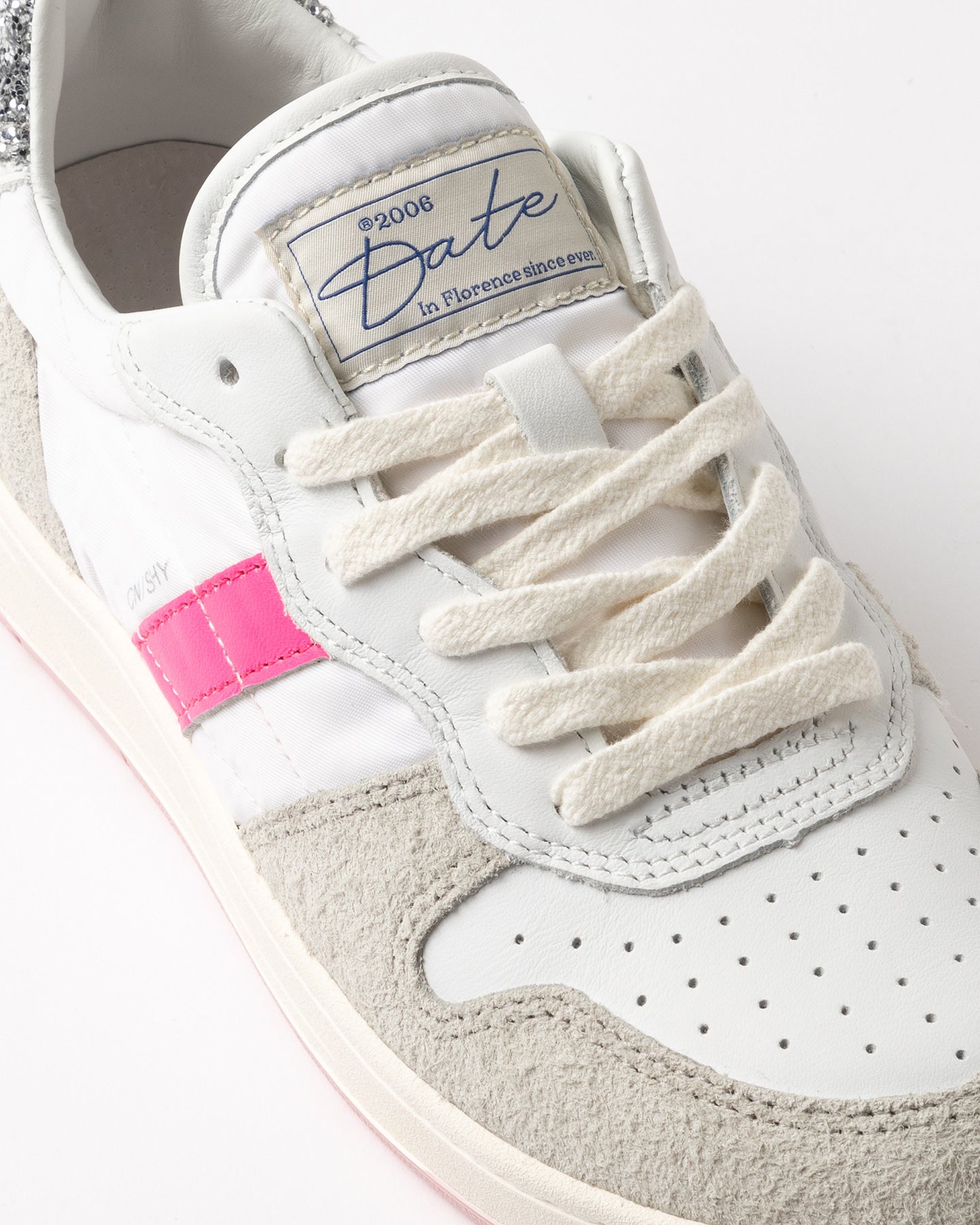 These sneakers are sure to brighten up your outfit and bring some serious sparkle! Made from a white leather and nylon, these funky trainers have tone-on-tone suede details, making them easy to style but a definite statement! The silver glitter back tab and side detail in fluorescent pink leather make these trainers an amazing focal piece for your outfit.