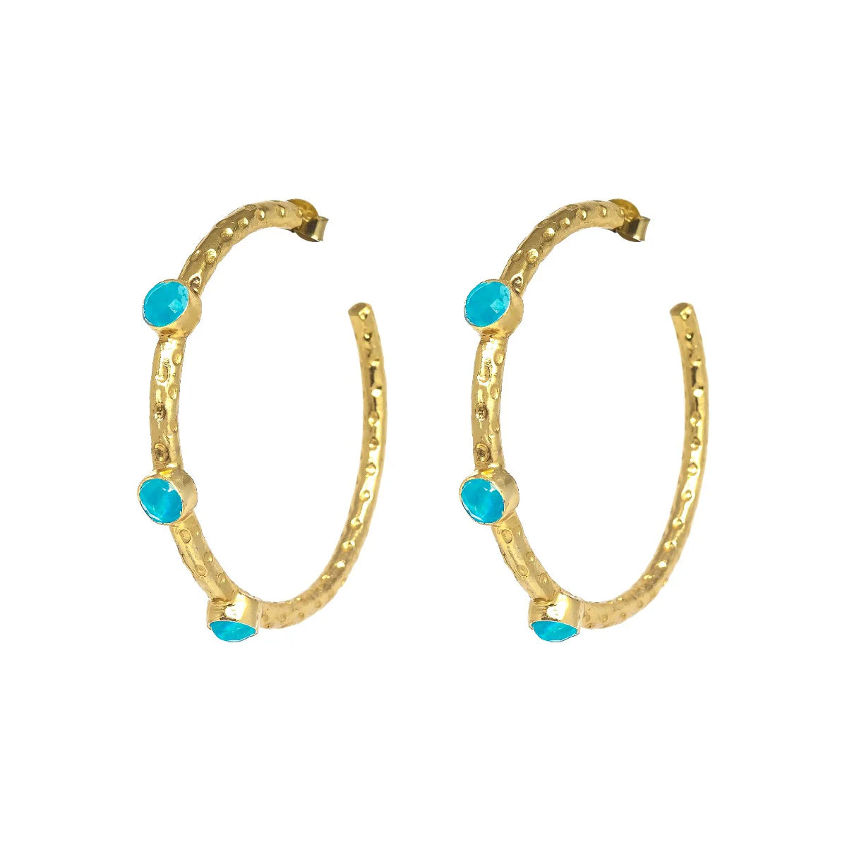 These textured gold hoops add a modern touch to any outfit and the bright turquoise gemstones add a statement pop of colour. With a classic lightweight hoop shape, these earrings can be transformed from day to night.