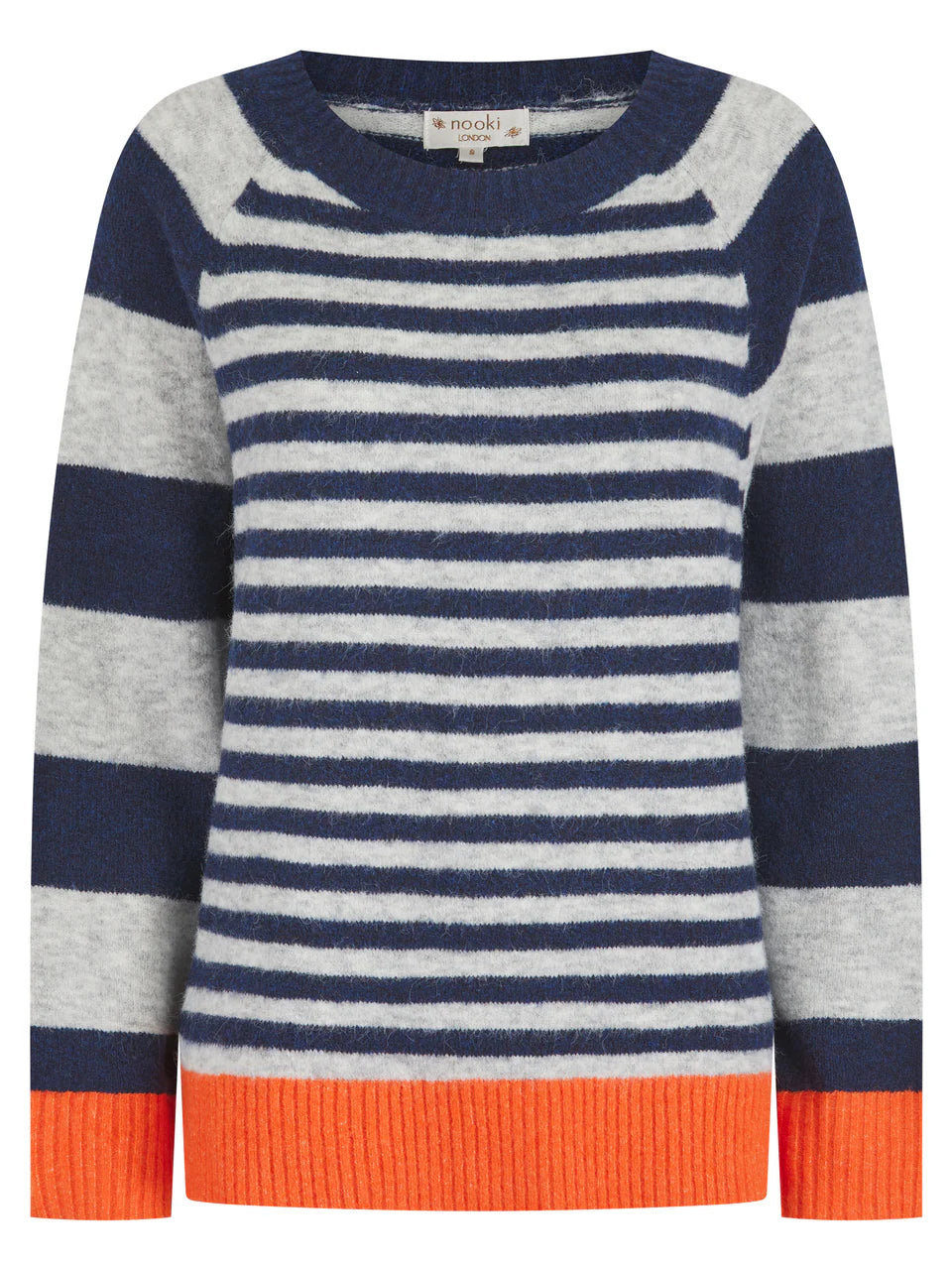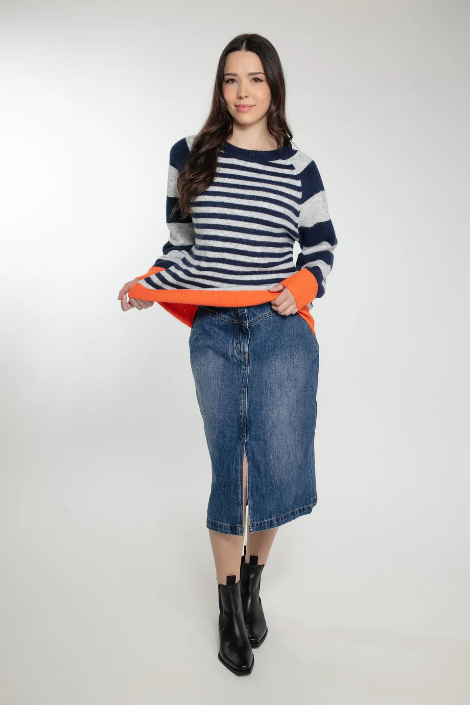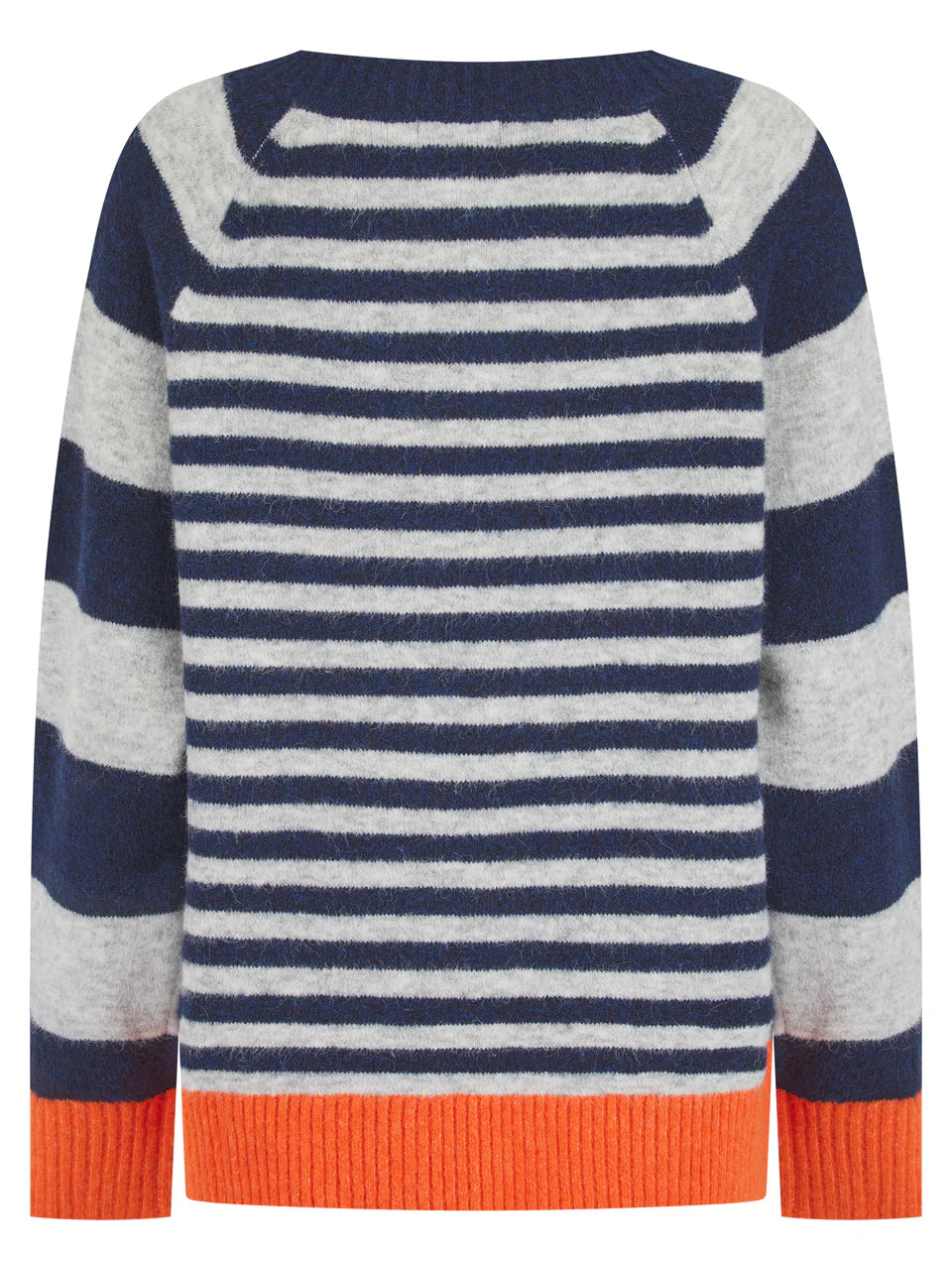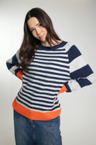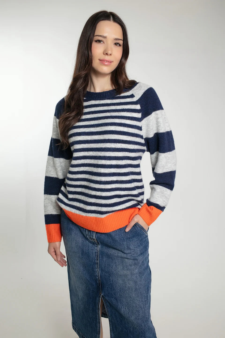 This laid back jumper is the perfect casual pullover this winter. Its striped design is complemented by vibrant colorful details at the cuffs and hem, adding a touch of style to any outfit.