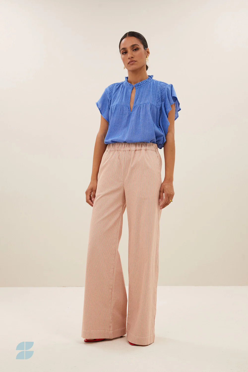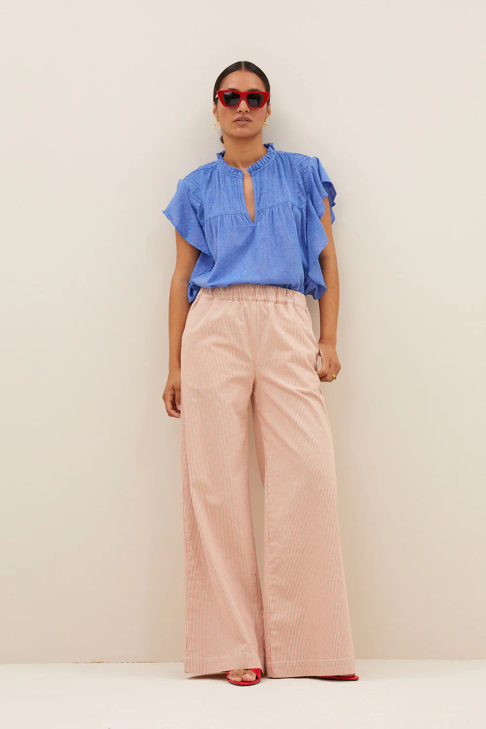 Fun, flirty and full of character, this blouse features beautiful ruffled details around the neckline and on the sleeves. The keyhole neckline brings some extra detail to your look, perfect for dressing up for summer parties with linen trousers.