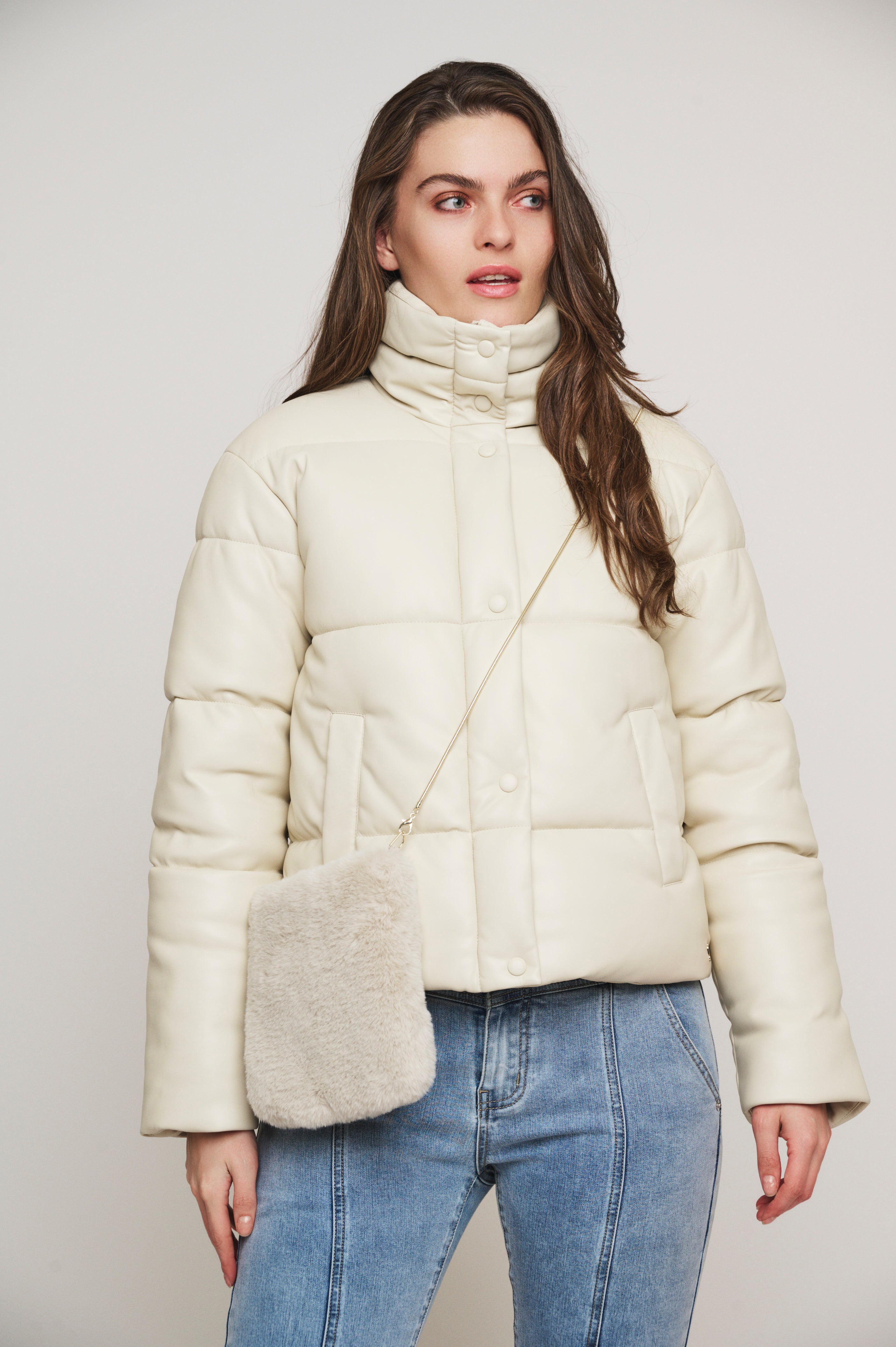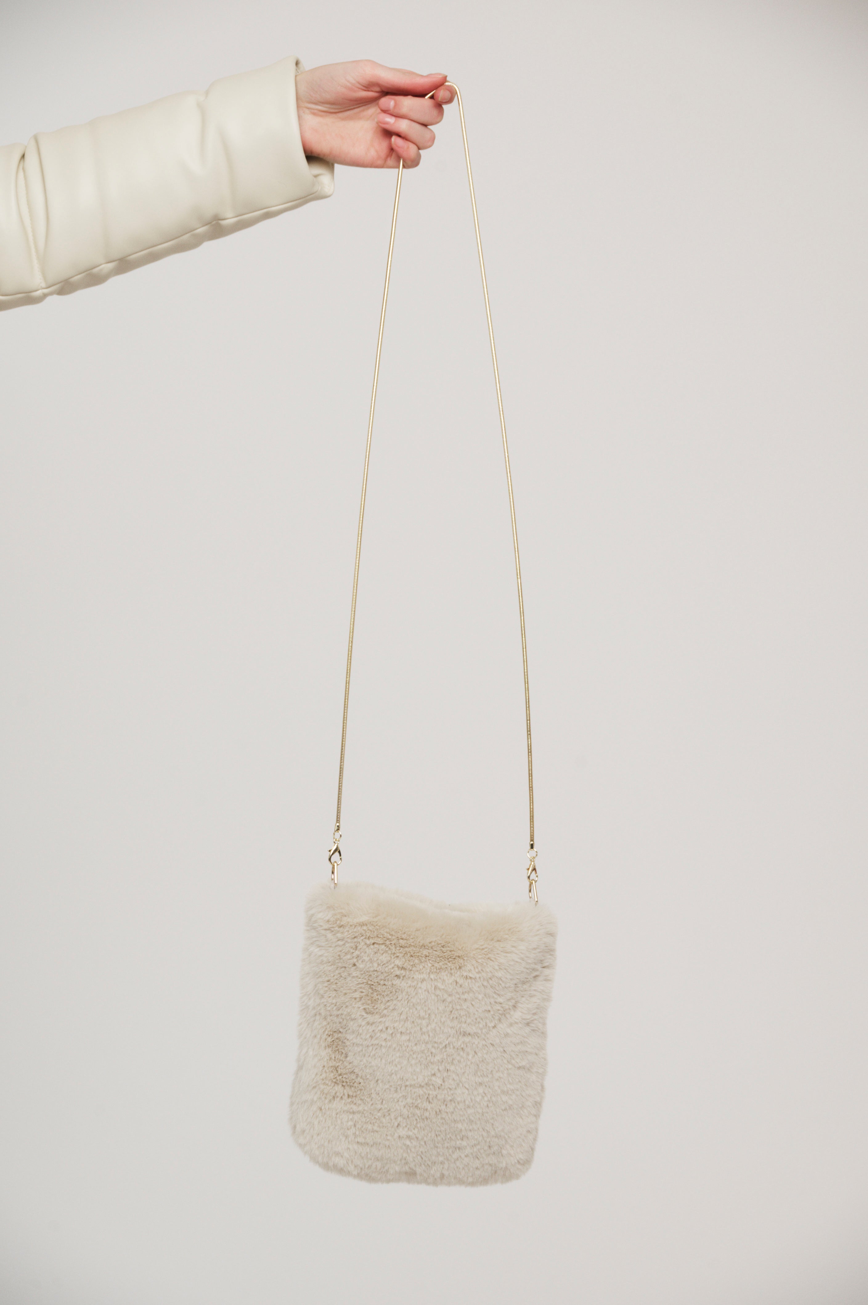This sweet little shoulder bag is the perfect winter accessory. With a faux fur style, the long metal cord allows you to throw this bag over your shoulder for days on the go.