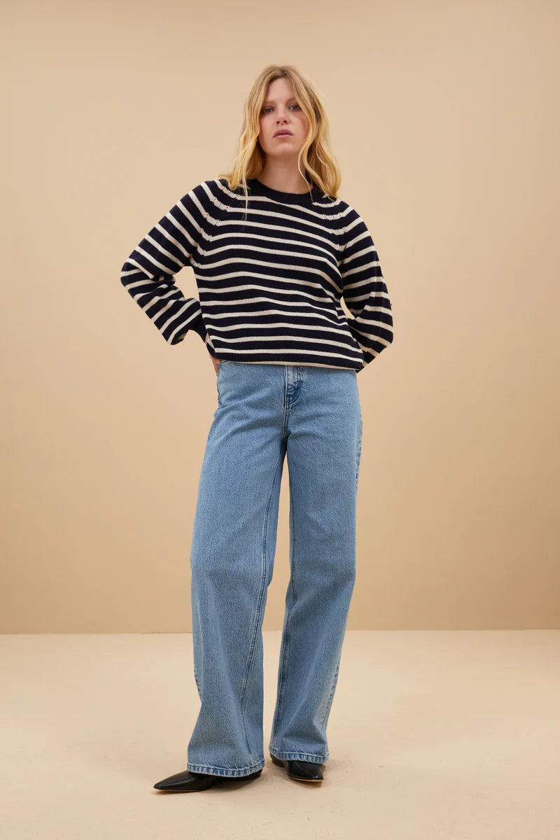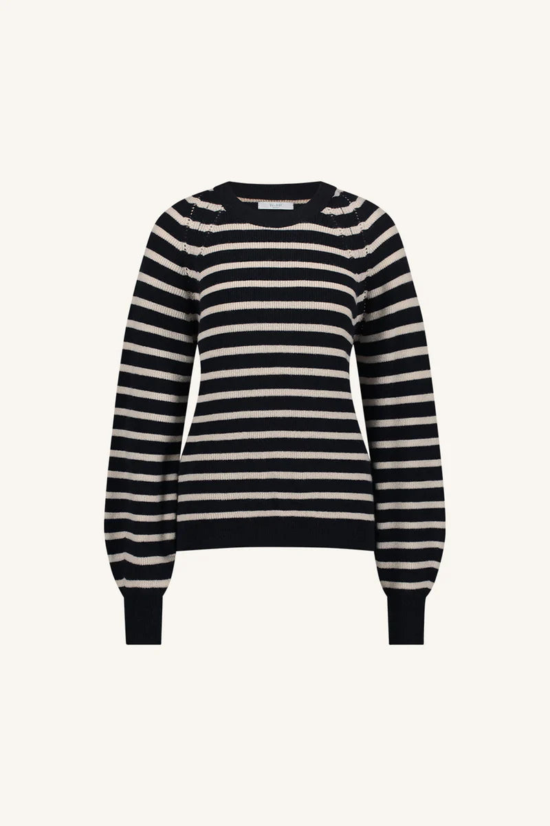 Made from a soft wool blend, this casual relaxed fit pullover features rib knit edges and a high neckline for a cosy feel. The subtle puff sleeves and classic stripes add a Parisian touch, complete your look with a white blouse layered underneath.