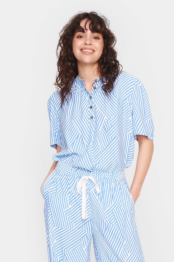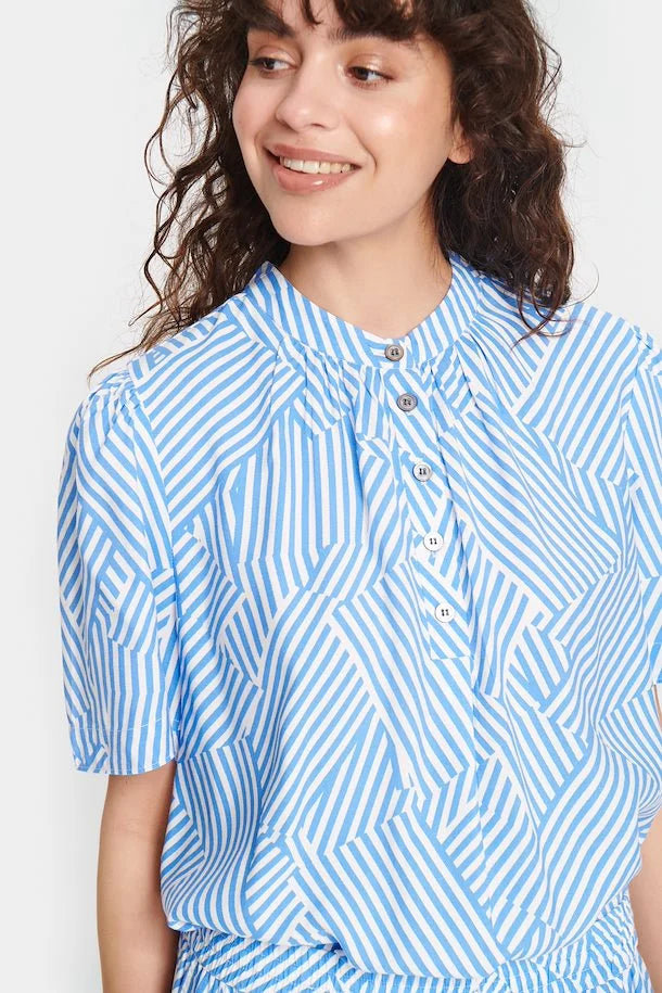 This top features a half-button design, short sleeves, and a unique braided striped pattern. With a regular fit, you'll feel comfortably chic all day long. In a lightweight relaxed feel, this blouse is perfect for the hot days of summer, great for tucking into linen trousers or shorts and pairing with a pair of metallic Lez Tropeziennes sandals.