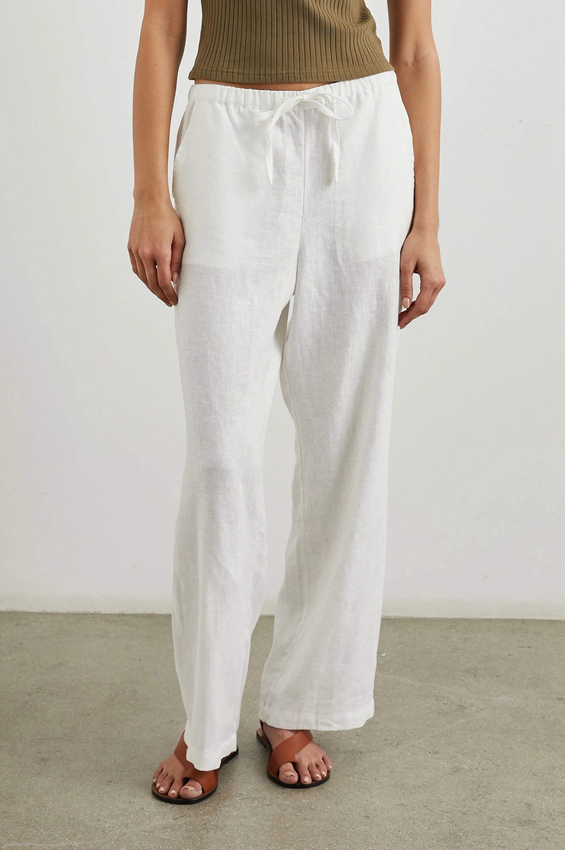 A pair of linen trousers transforms your usual t-shirts and blouses into a total summer ready outfit. With a relaxed fit and comfortable drawstring waist, these sheer linen pants can be dressed up or down for any occasion this summer.