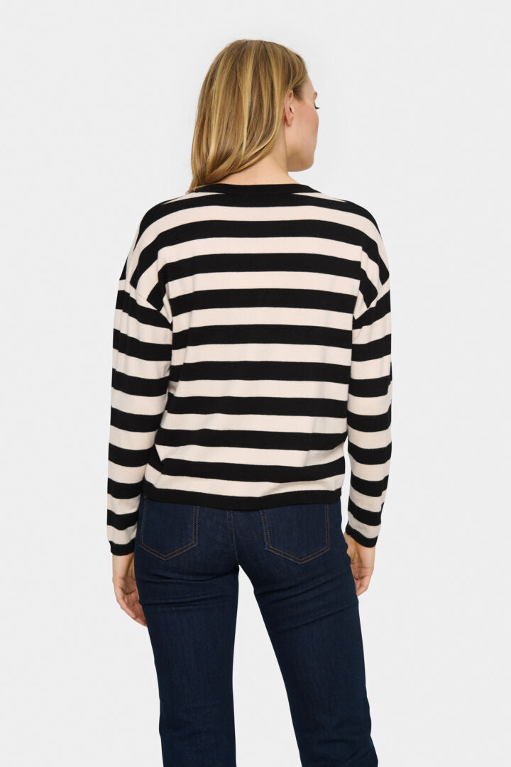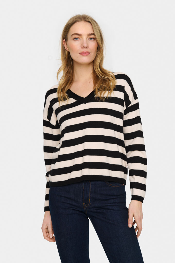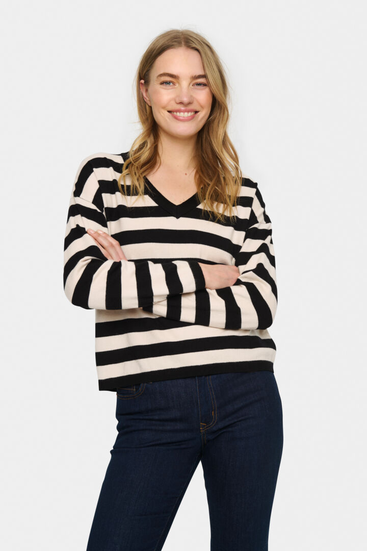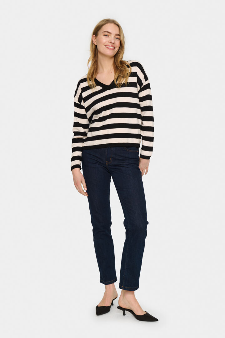 This jumper is classic with a fashionable striped design, paired with a flattering v-neckline, making it a versatile addition to any wardrobe. Easy to layer up and style, this pullover can be paired with skirts, jeans or tailored trousers.