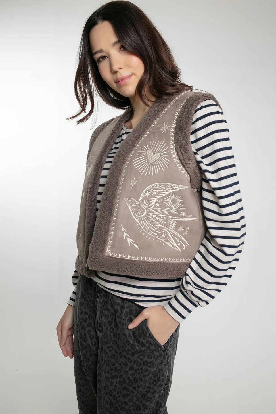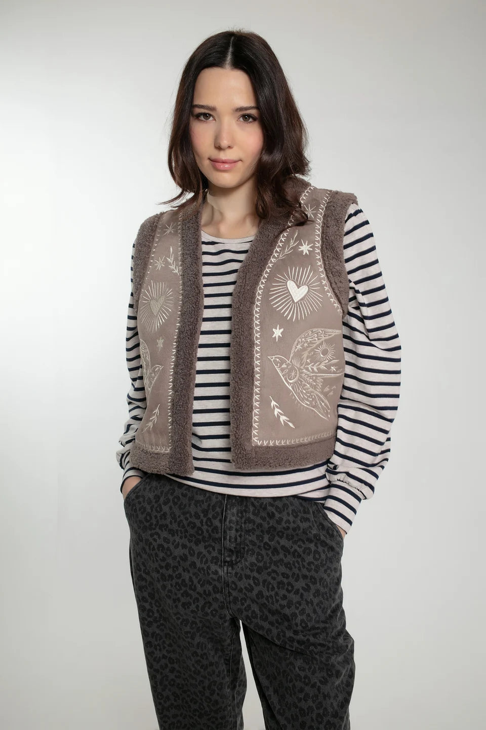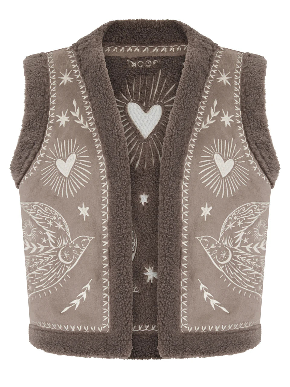 This bohemian inspired open style gilet features stunning embroidered details. Perfect for the season, this fashionable gilet is a must-have addition to your wardrobe, adding a touch of chic to any autumnal outfit.