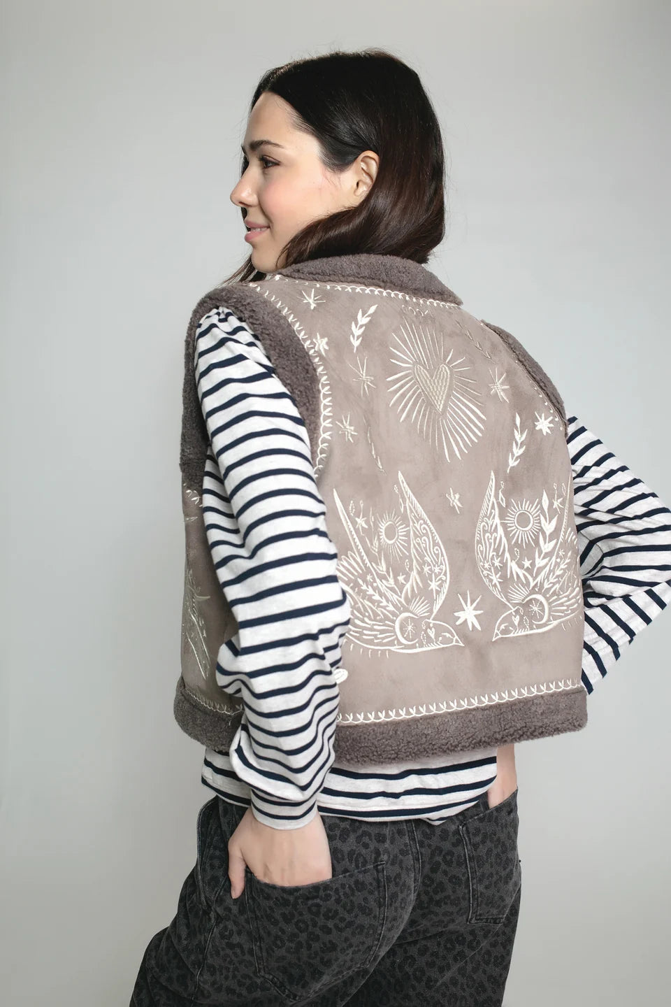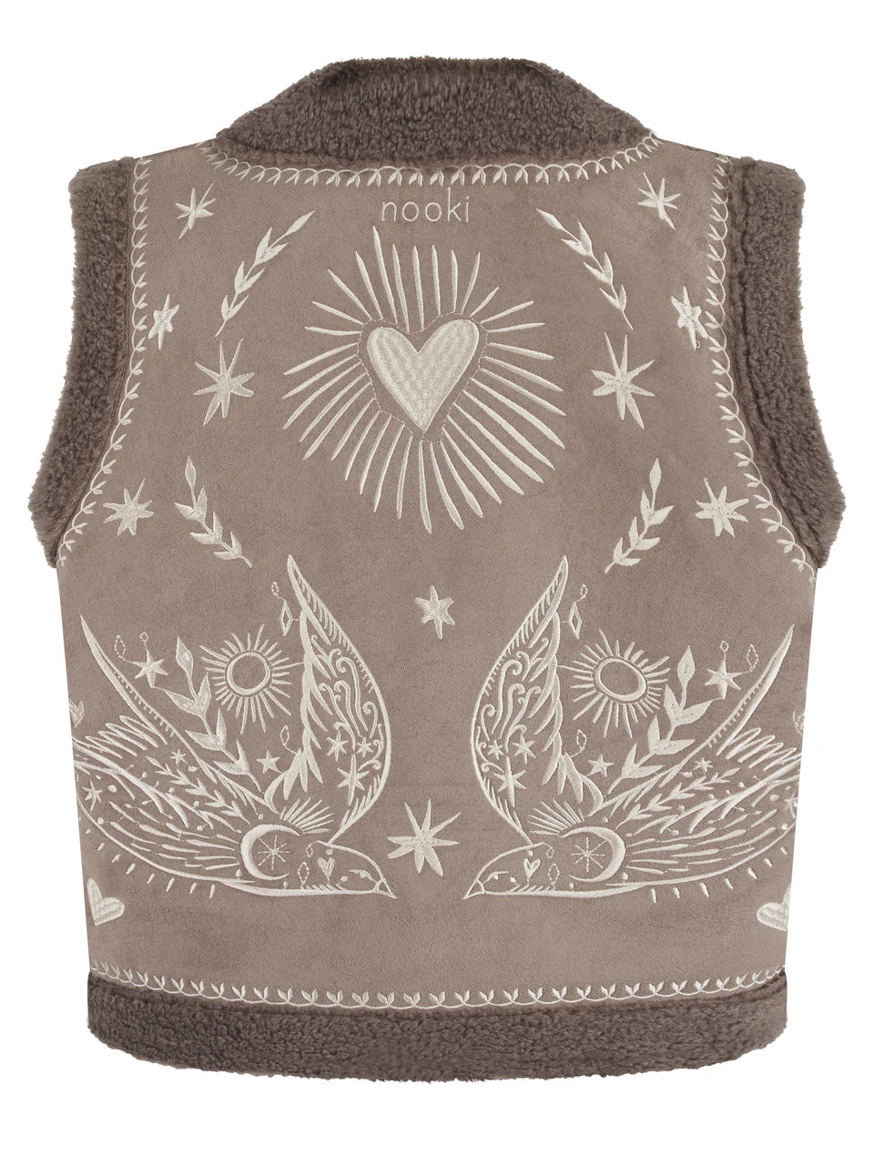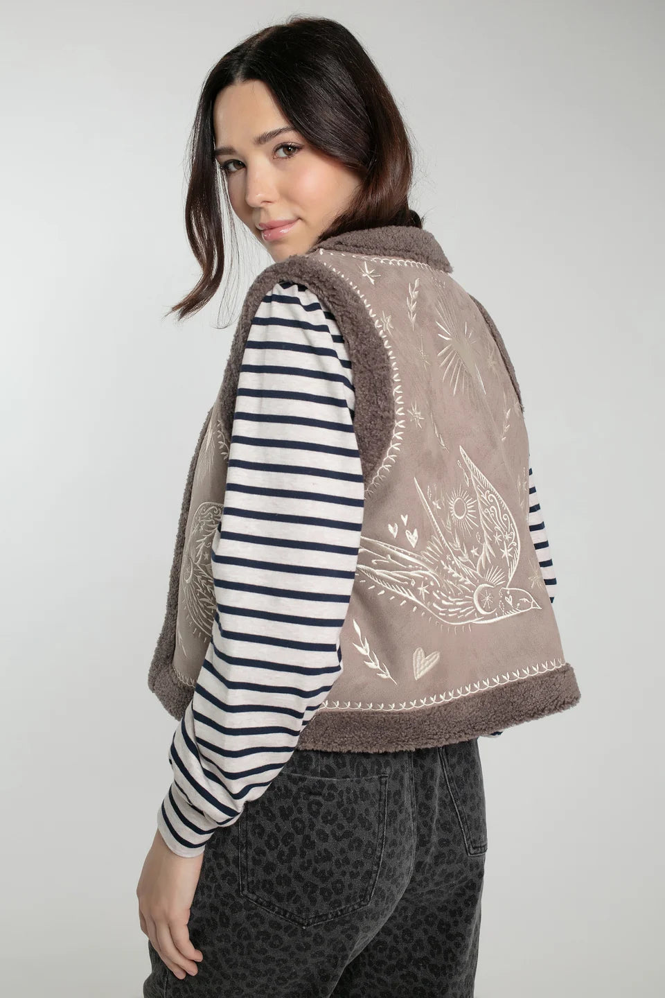 This bohemian inspired open style gilet features stunning embroidered details. Perfect for the season, this fashionable gilet is a must-have addition to your wardrobe, adding a touch of chic to any autumnal outfit.