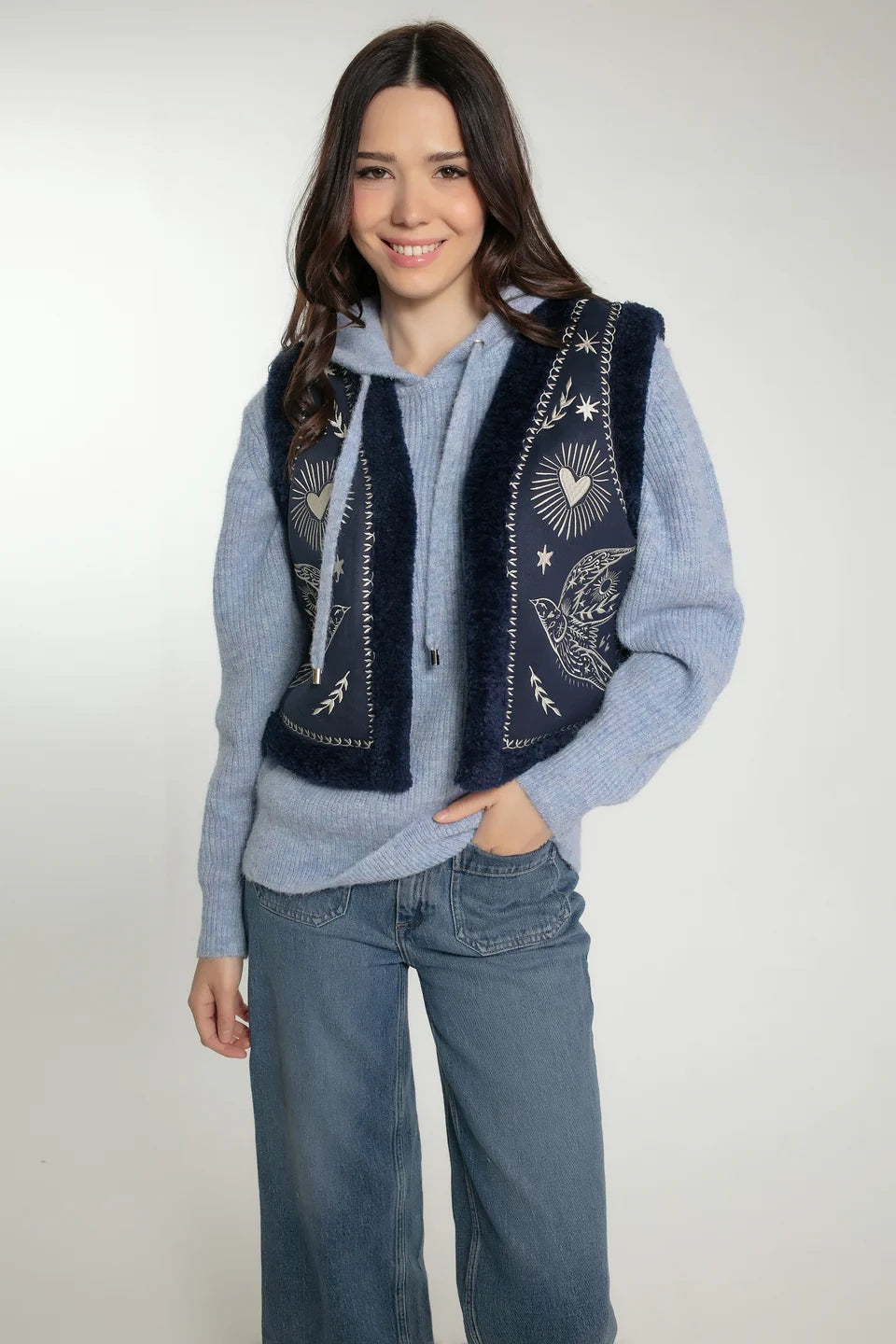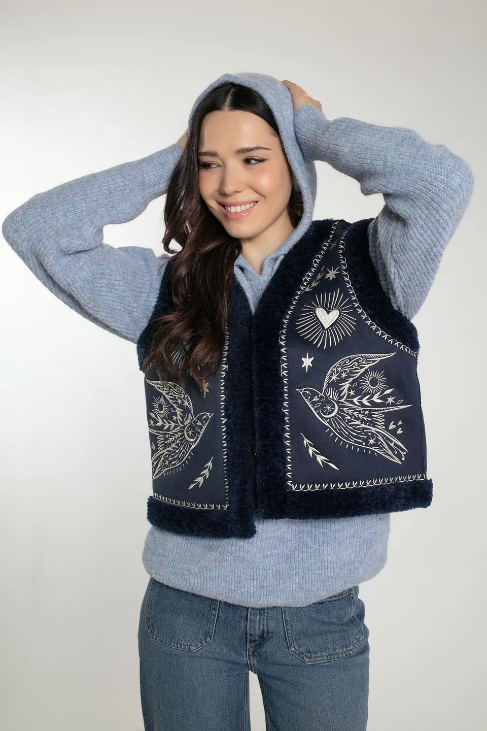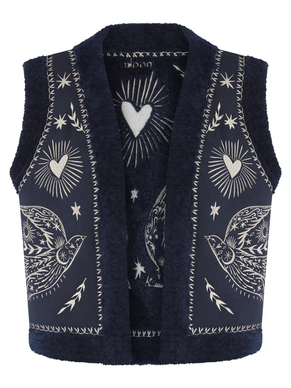 This bohemian inspired open style gilet features stunning embroidered details. Perfect for the season, this fashionable gilet is a must-have addition to your wardrobe, adding a touch of chic to any autumnal outfit.