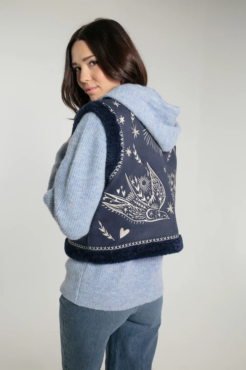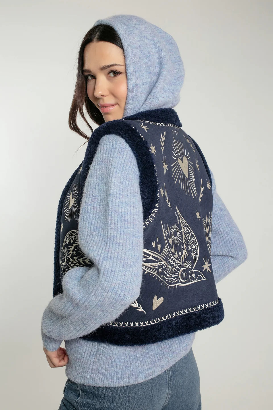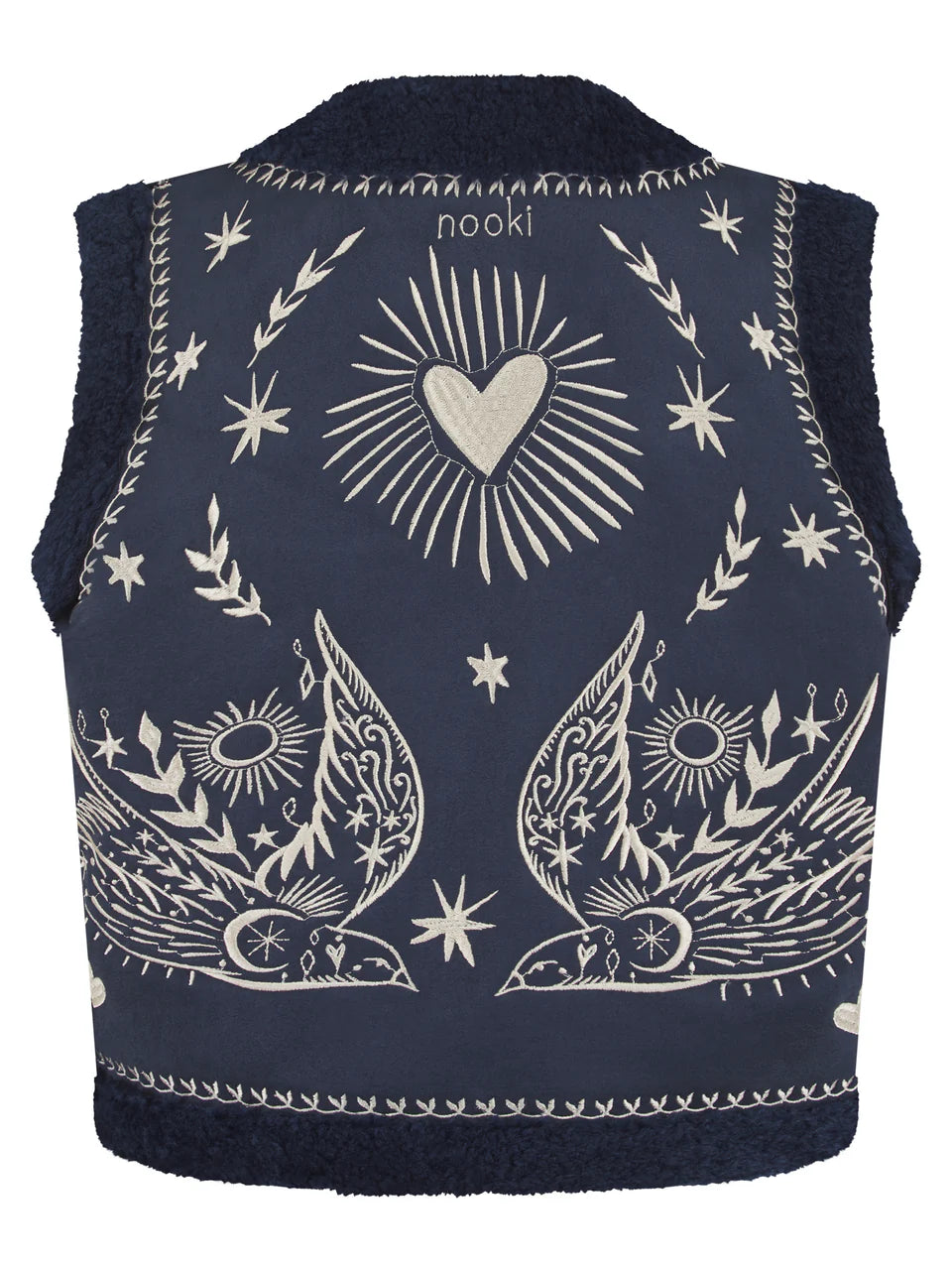 This bohemian inspired open style gilet features stunning embroidered details. Perfect for the season, this fashionable gilet is a must-have addition to your wardrobe, adding a touch of chic to any autumnal outfit.