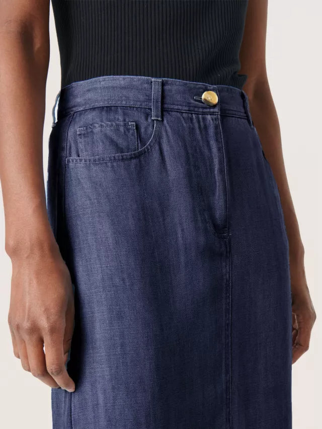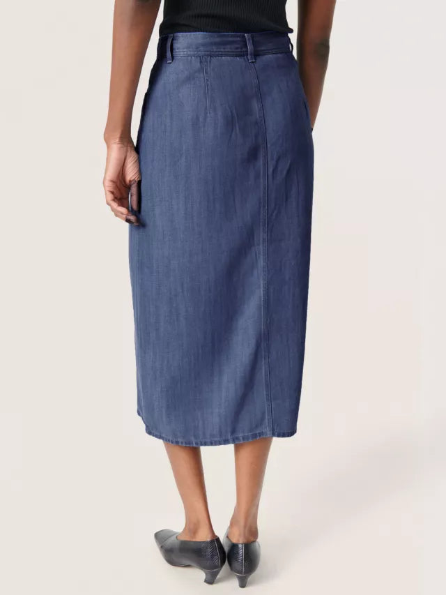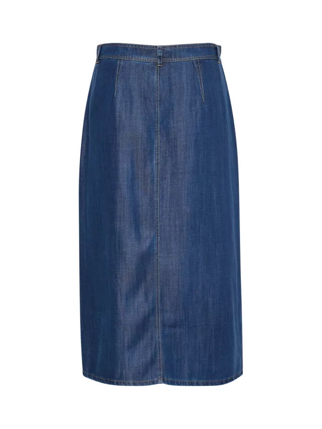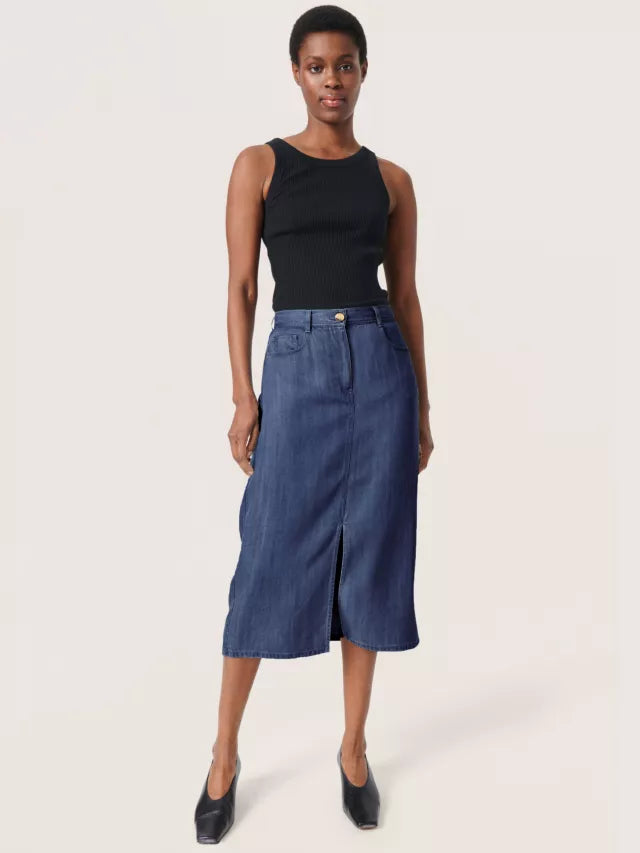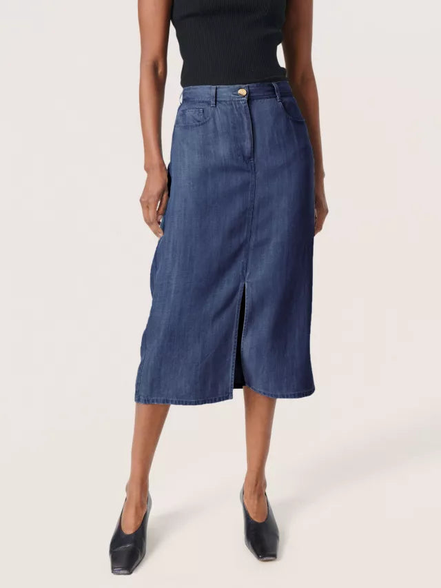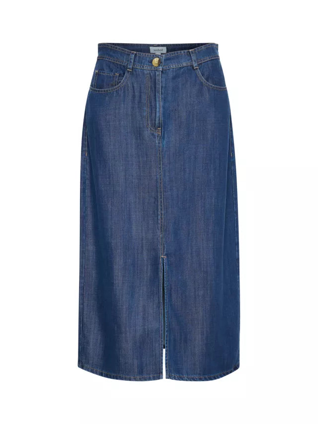 A midi skirt is a versatile piece for the wardrobe. It can be paired with feminine blouses for a dressed-up look, or keep it casual with a graphic tee and jumper. This skirt has a straight fit with a slit for added style and movement. Pair with the matching jacket for a fashionable double-denim look.