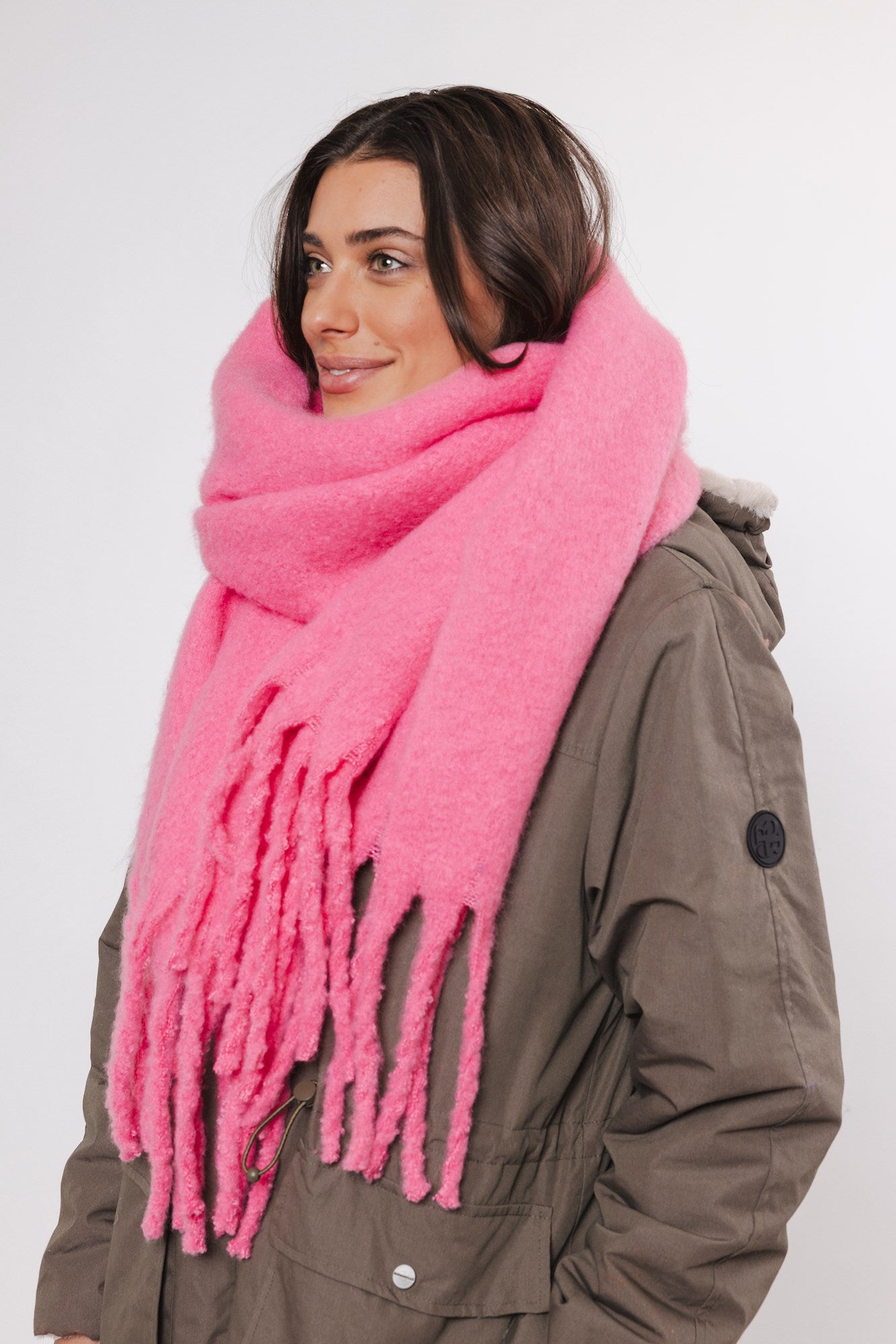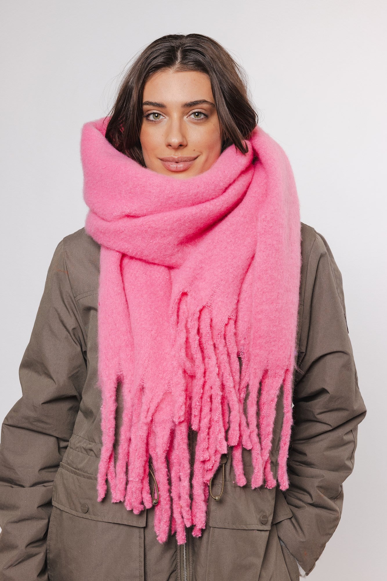 This gorgeous blanket scarf is a must-have winter accessory. In this striking pink colour, you can add a touch of fun to your winter wardrobe. The fringed ends are a classic style, great for pairing with warm coats.