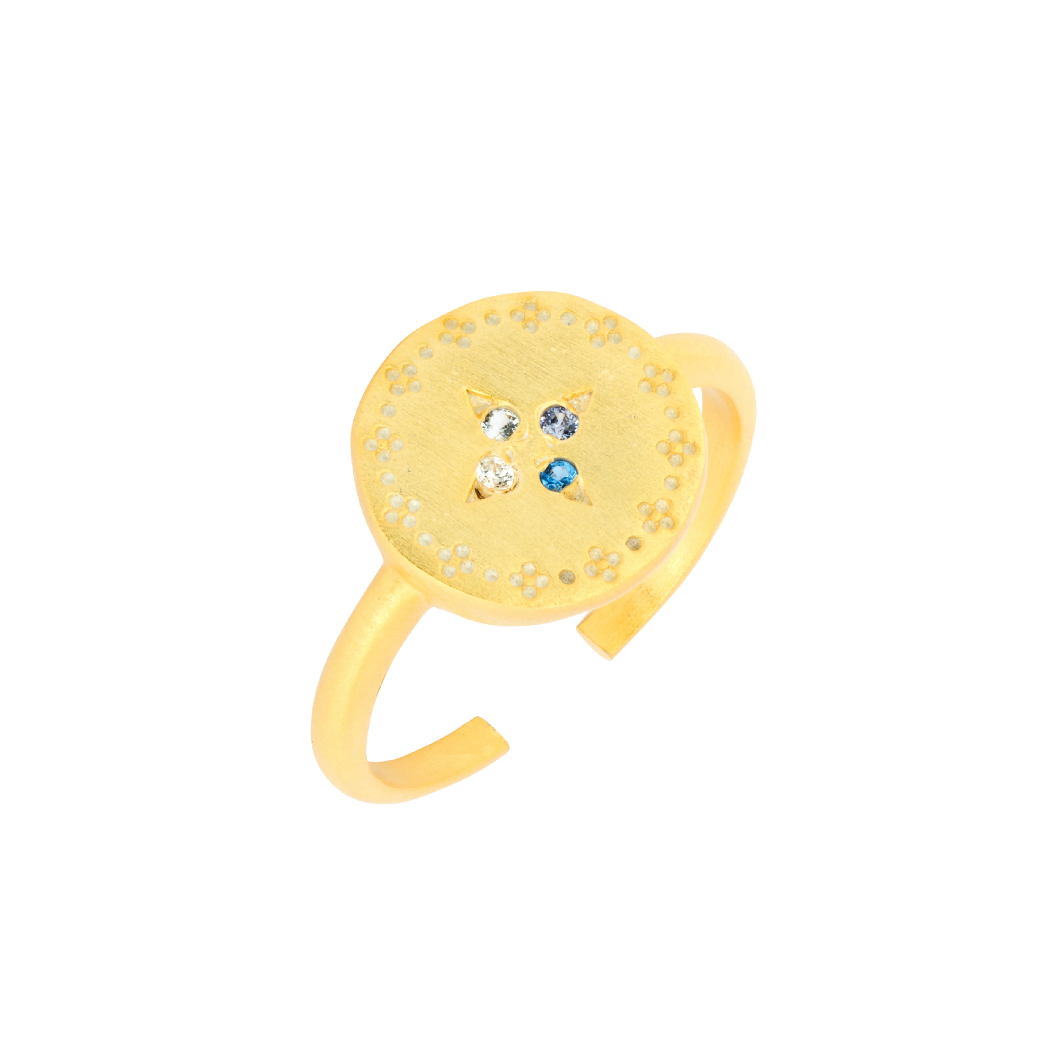 This gold ring is the perfect solo piece for your hands. With small but mighty blue crystals, this ring brings some subtle colour to any look. We also have matching earrings and a necklace avaliable.