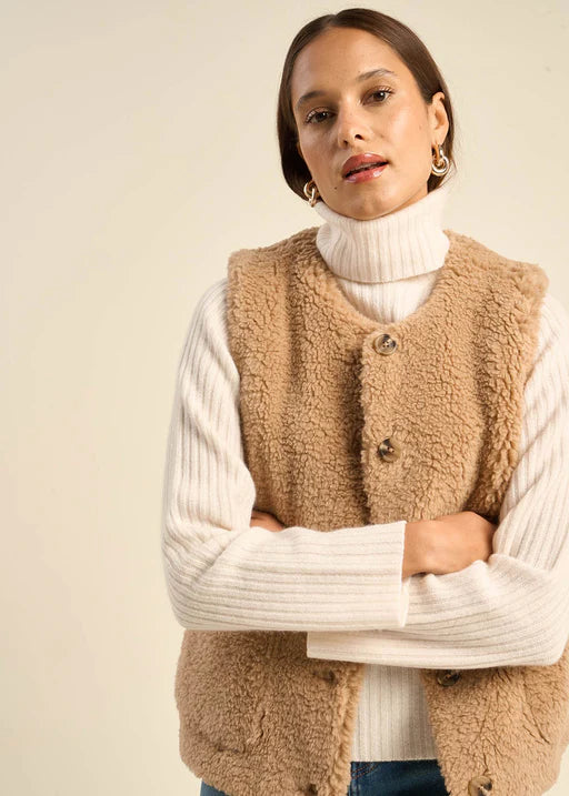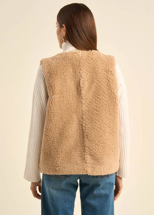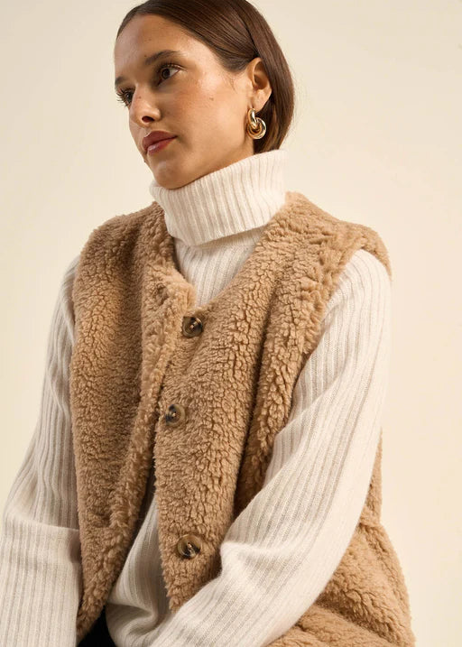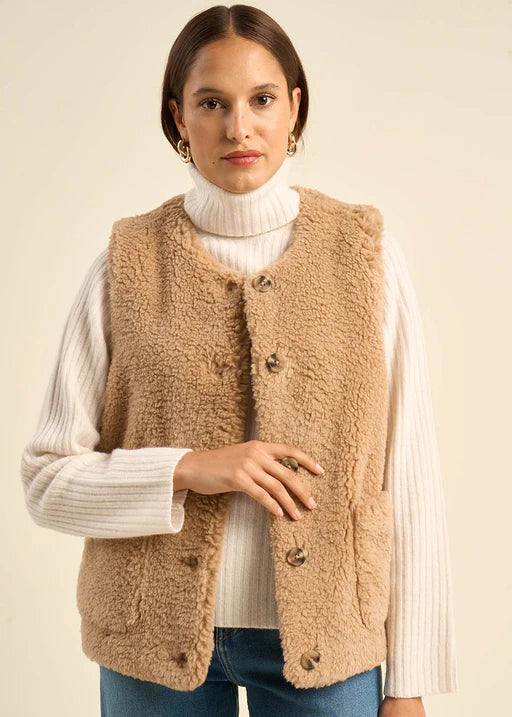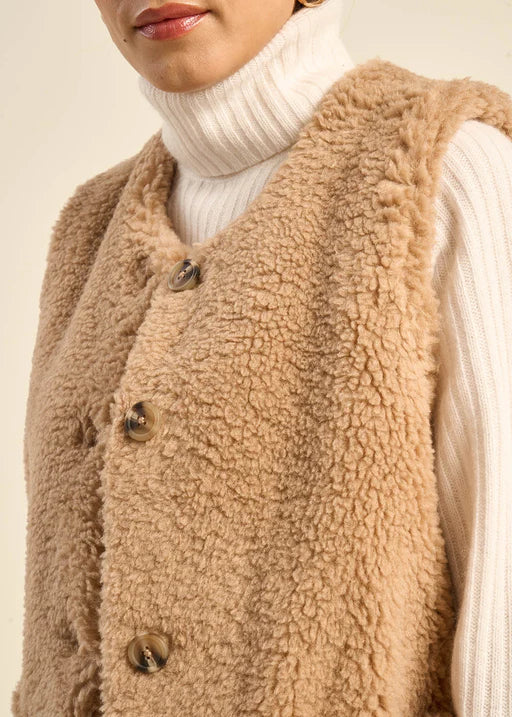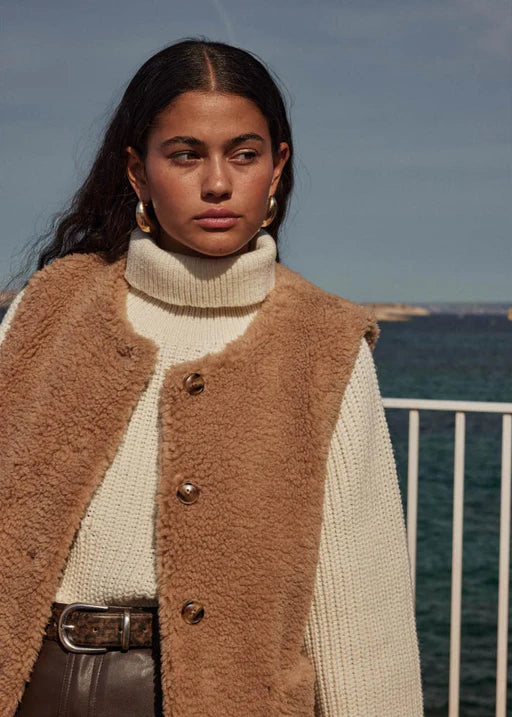 This camel-colored faux fur vest is sleeveless, perfect for layering over your favourite knitwear and dresses. With a round collar and button-up design, you can stay warm and fashionable.