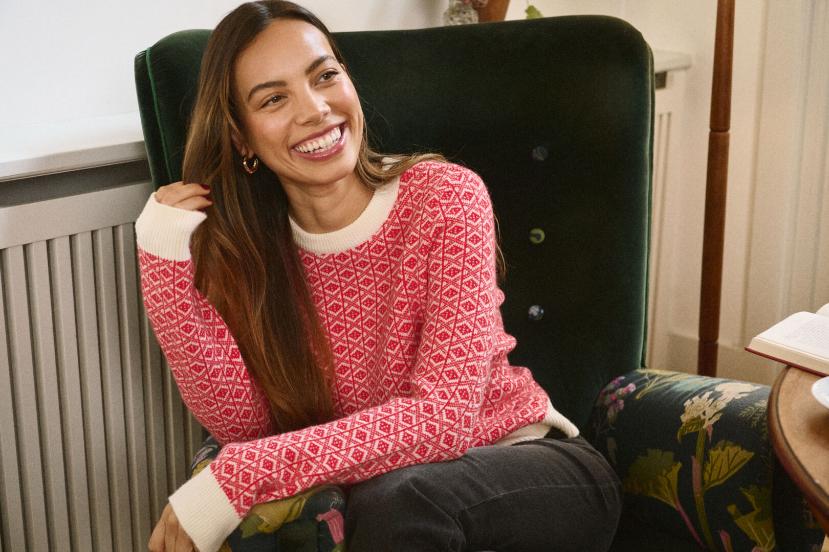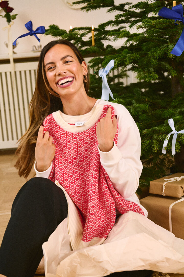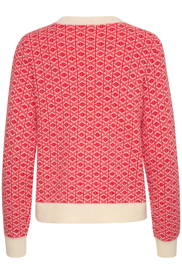 This vibrant, printed sweater in racing red is sure to turn heads. Perfect for adding a pop of fashionable color to your winter wardrobe. Stay cozy and stylish this holiday season in our must-have Christmas red pullover.
