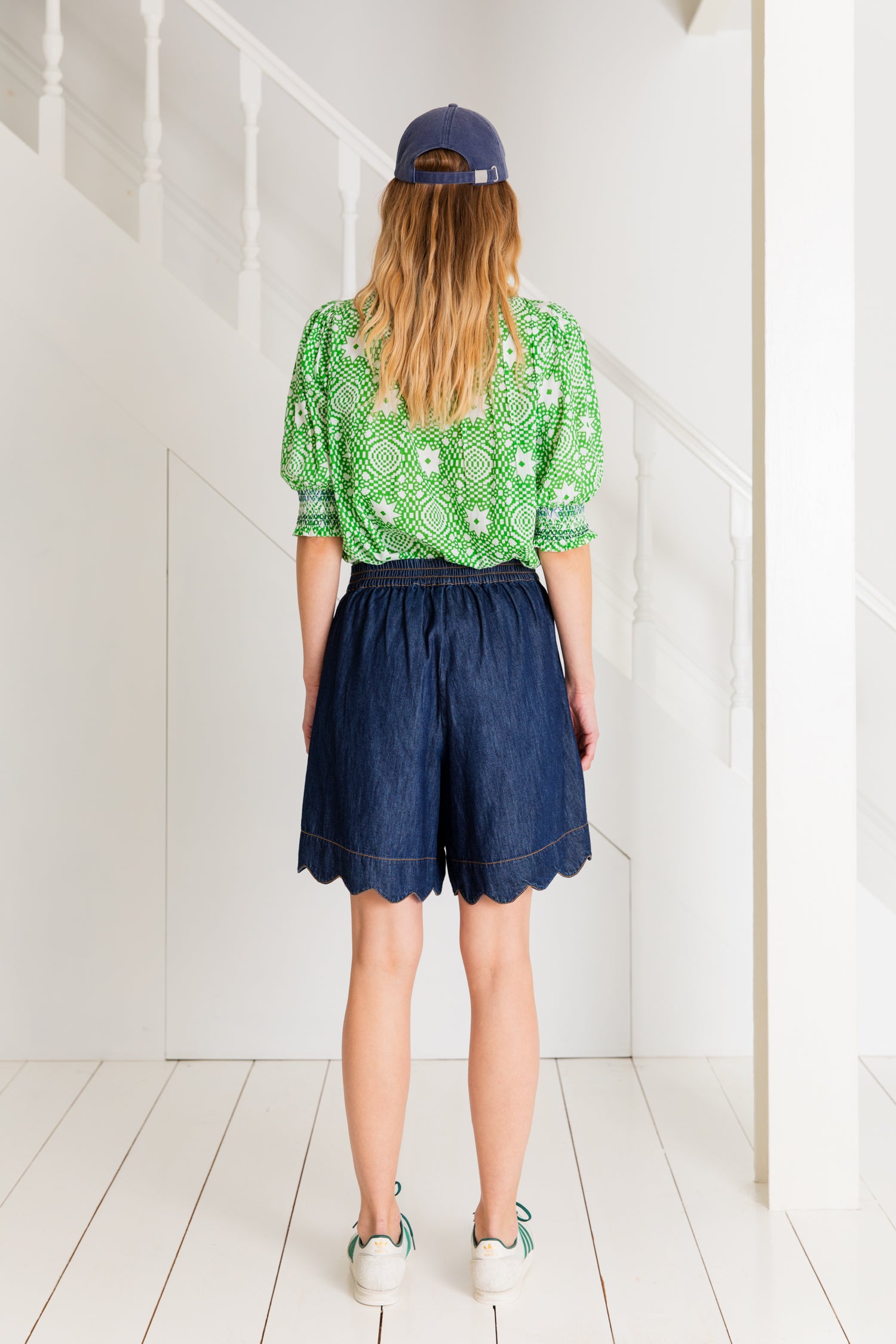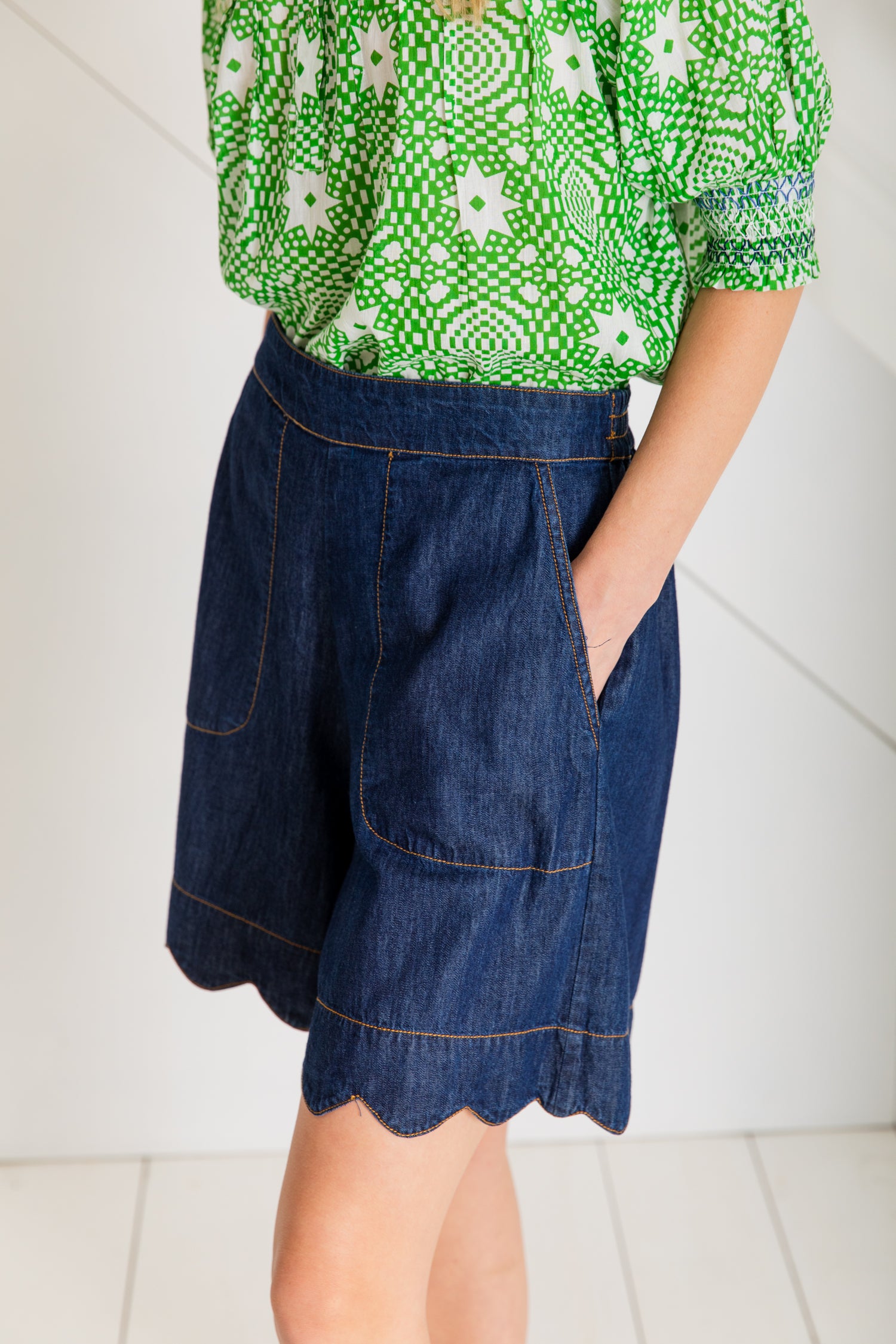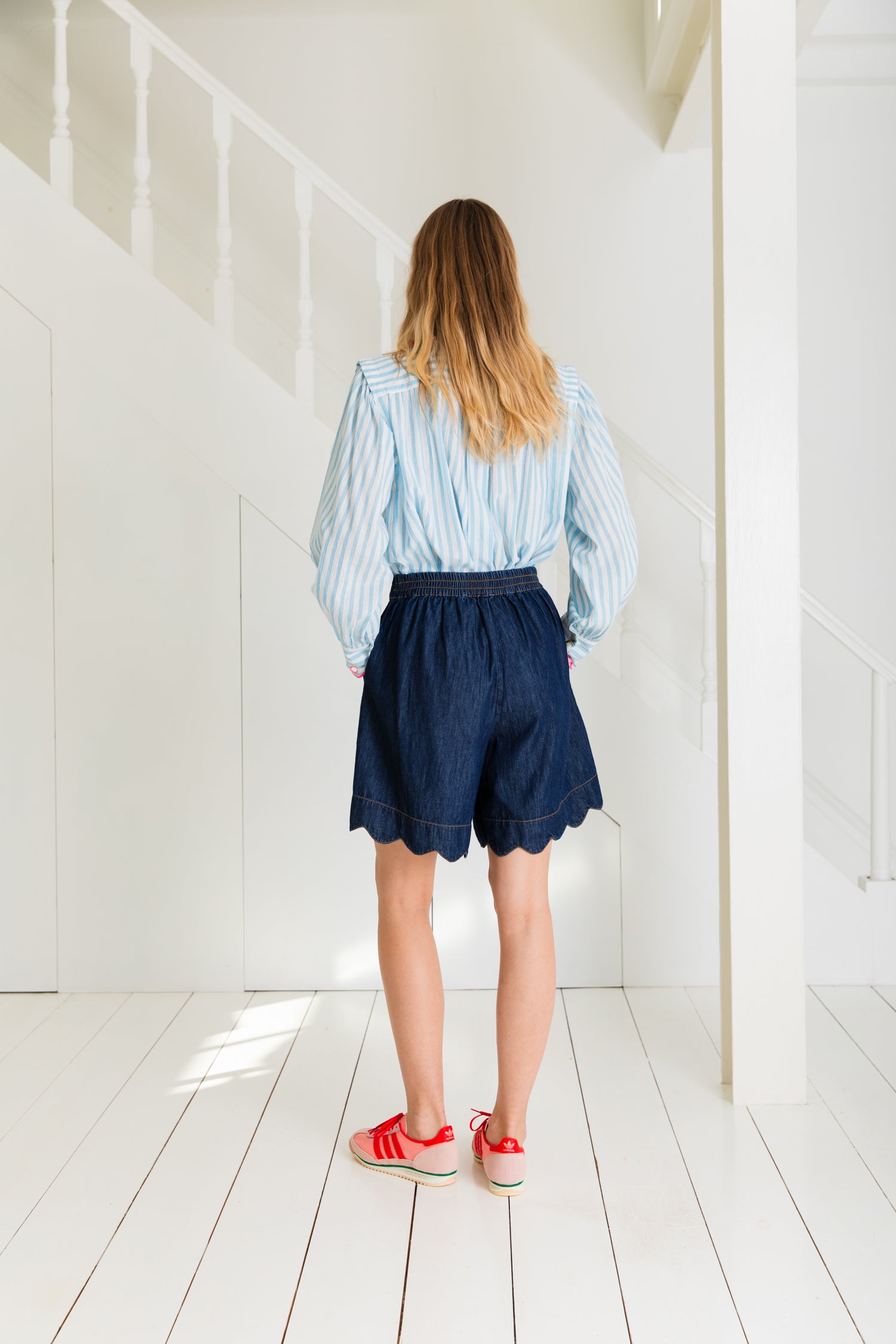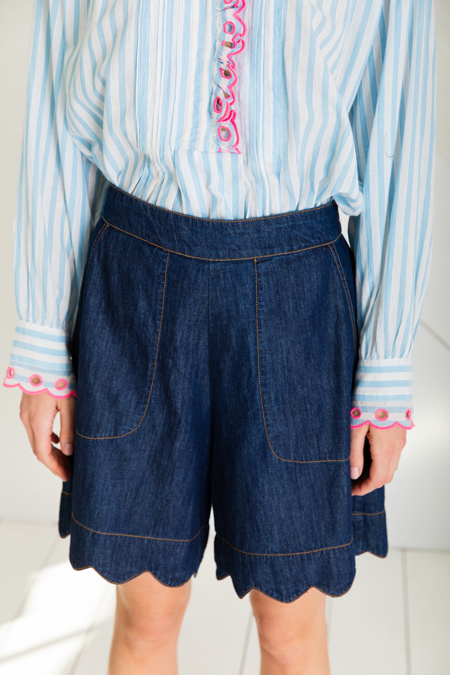 These scalloped denim shorts are the perfect twist on a classic summer style, simply pair with a white tee and the matching jacket for a trendy denim on denim look. These shorts are super comfortable thanks to an elasticated waistband.
