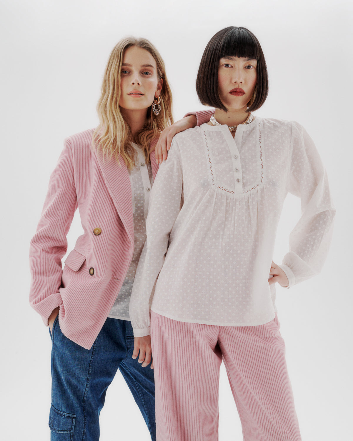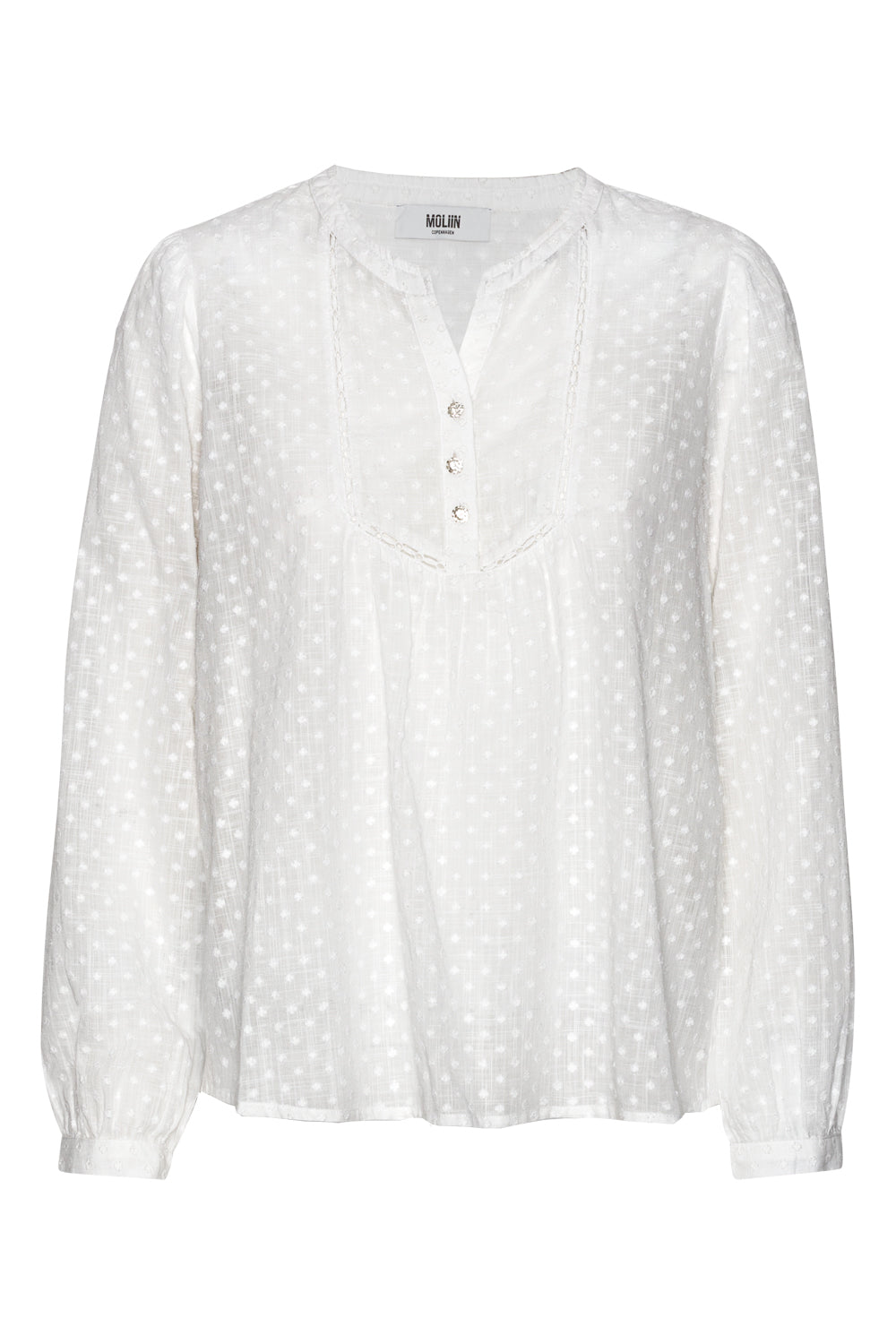 The Inga Shirt in Off-white is a must-have for a versatile wardrobe. This feminine classic shirt features a round ruffle detailed neck and half placket. The slight volume in the sleeves adds a touch of elegance to any outfit, perfect for working days or evenings out.