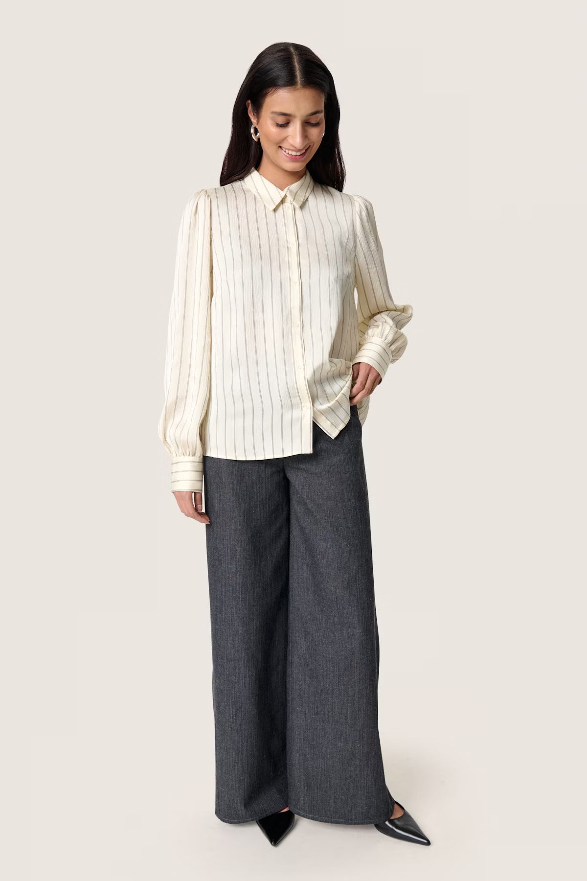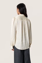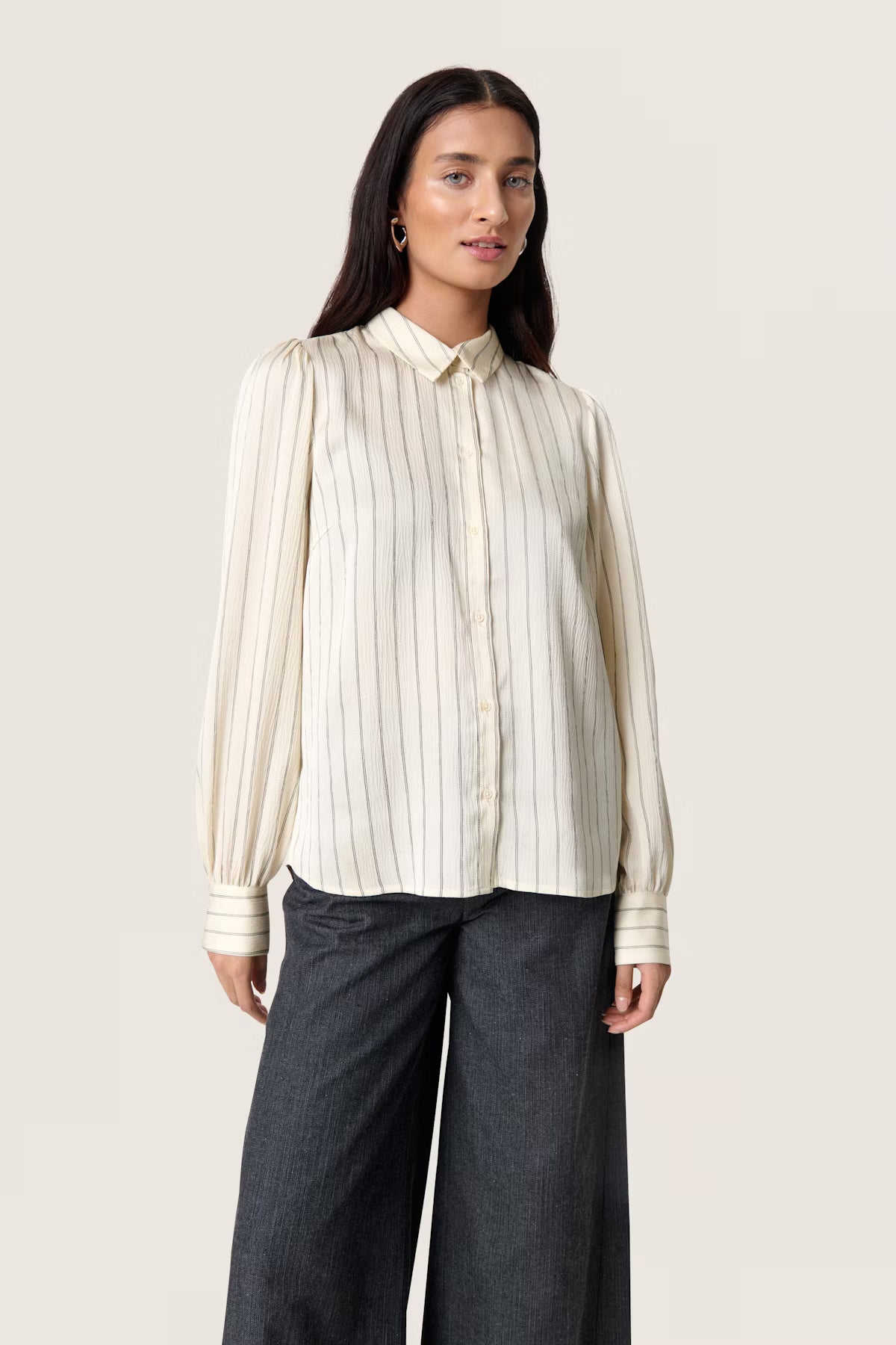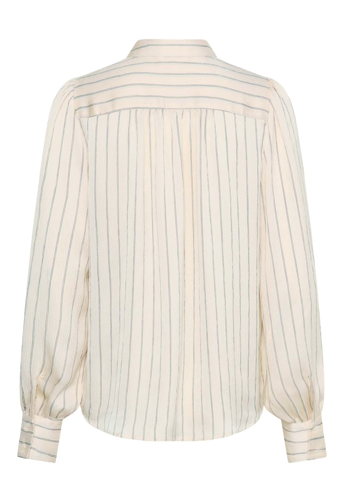 In a classic cream colour with fine black stripes, this feminine cut blouse is a staple for the wardrobe. Easy for both formal and relaxed styling, this piece can transform from an outfit suitable for work to a girls night out shirt.