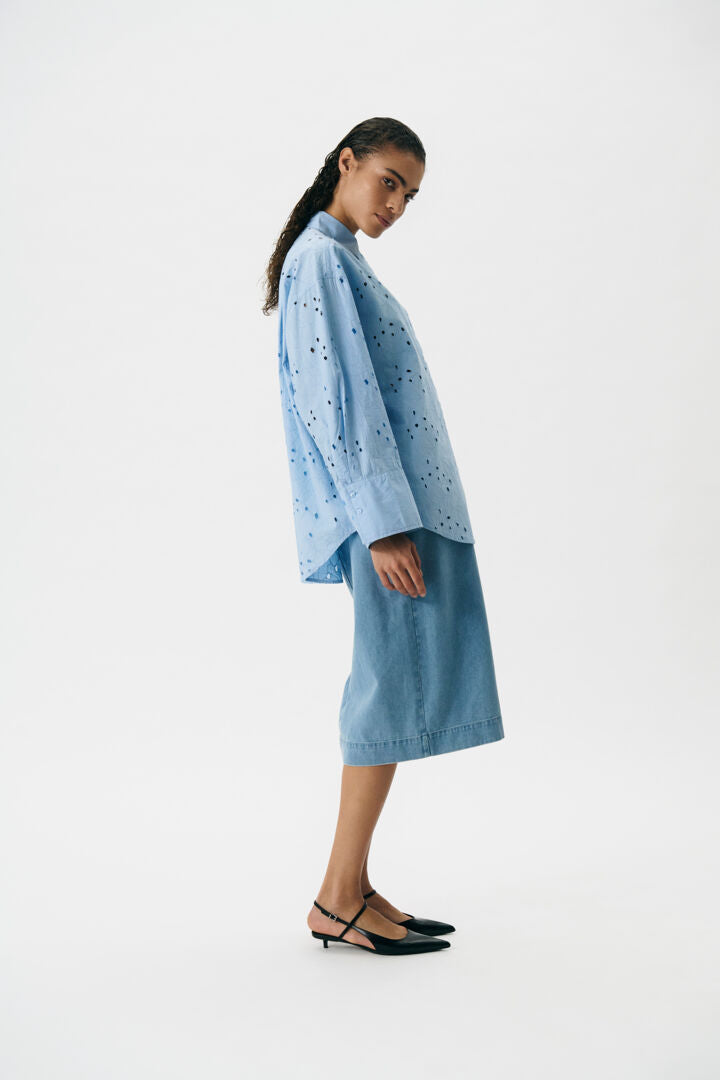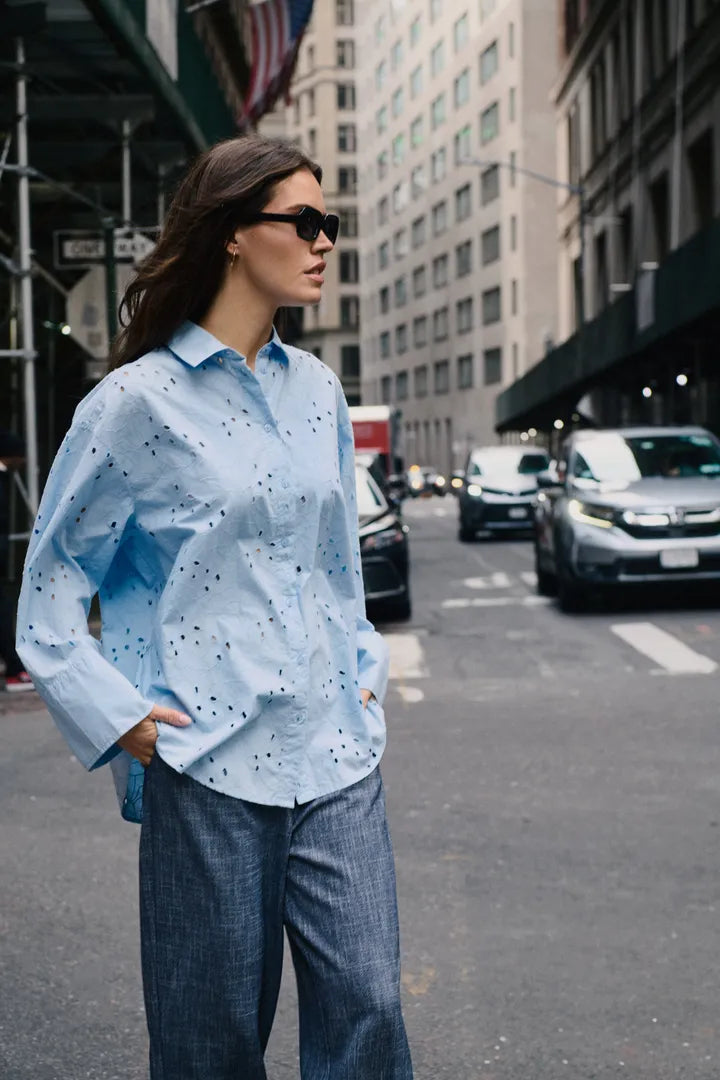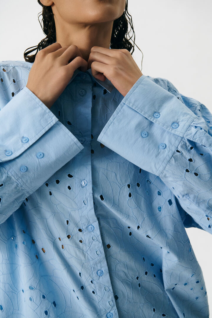In the perfect blend of classic tailoring and feminine charm, this shirt is the ultimate smart for spring look. The broderie finish compliments the traditional collar and button up style, making it great to pair with your jeans and heels for a night out.