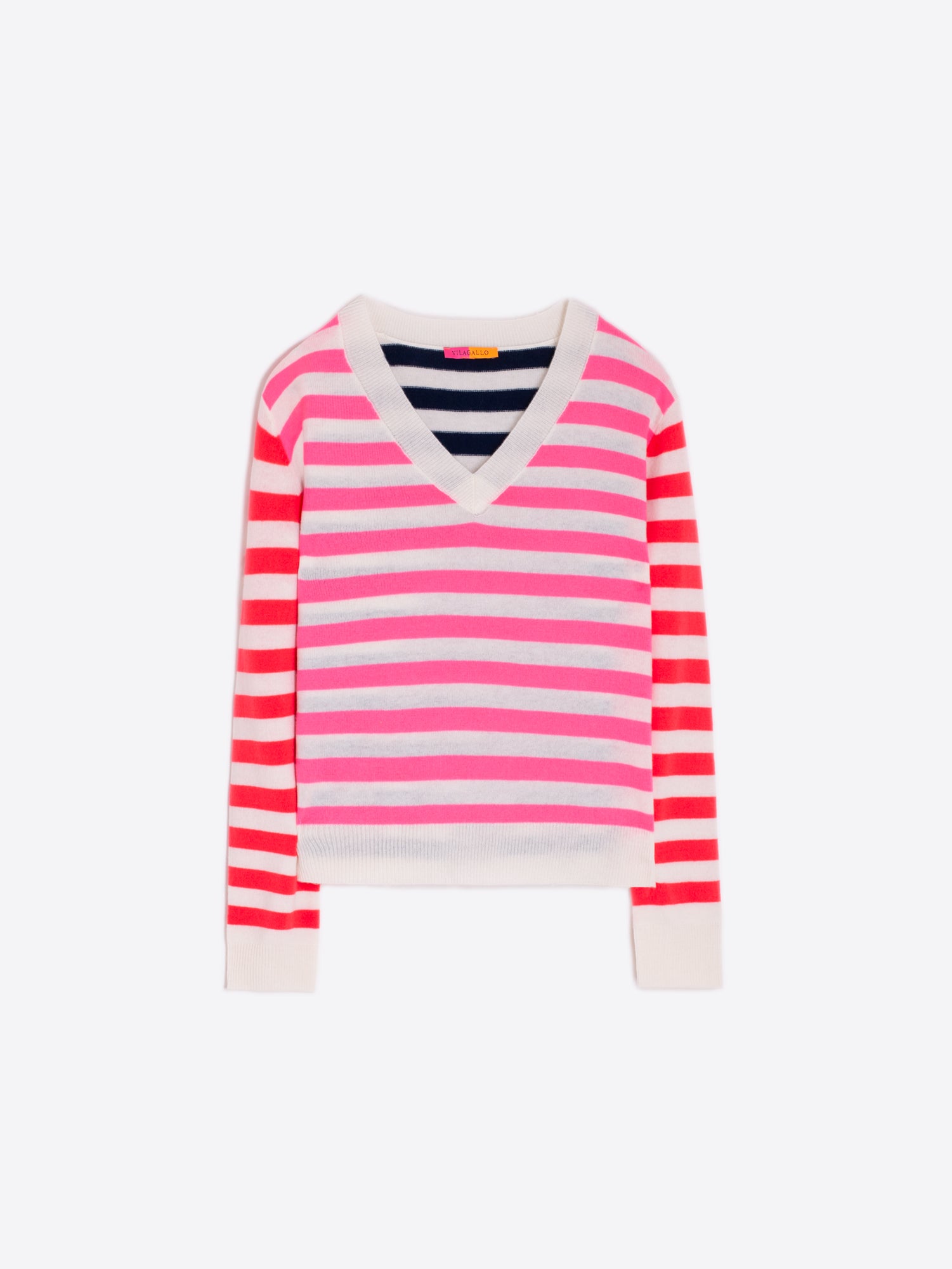 Replace your winter blues with something bright and beautiful for spring! This V-neck jumper is lightweight with navy, white and pink stripes for a flash of colour. Perfect for wearing with a simple denim jacket or pairing with a neutral maxi skirt, you'll find so many ways to wear this piece.