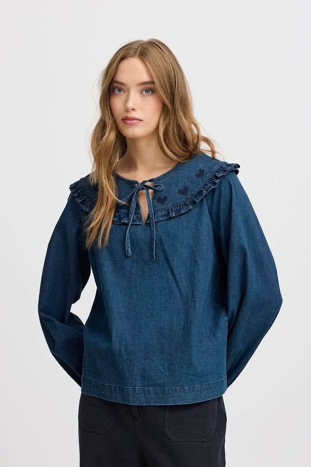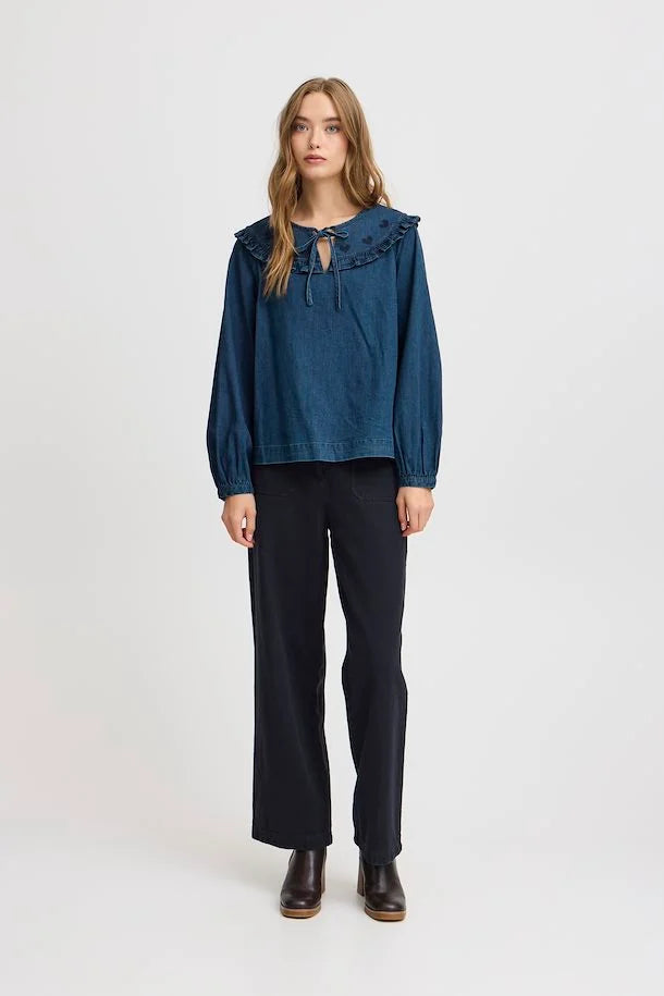 The Jules Shirt, features a loose fit and Peter Pan collar for a trendy look. Its denim effect adds a touch of sophistication while its regular length and long sleeves keep you comfortable. Pair with a tailored pair of trousers for a smart casual look.
