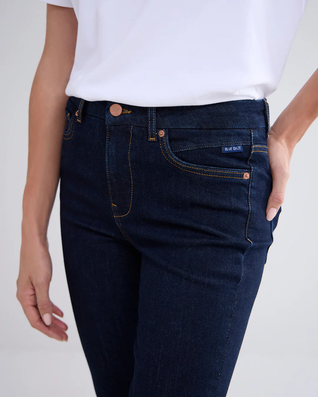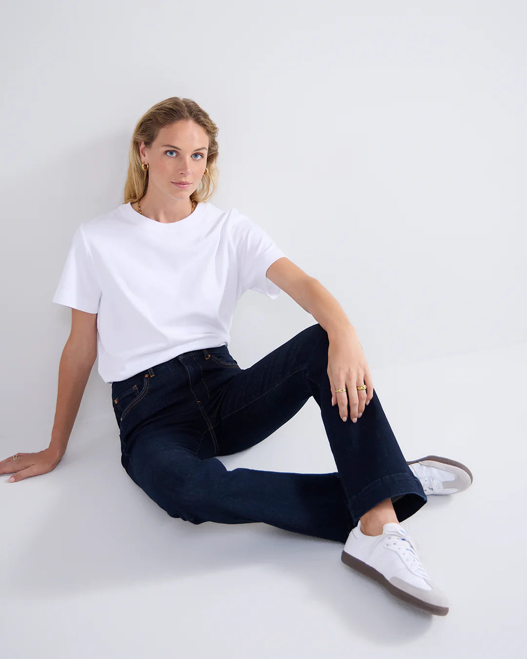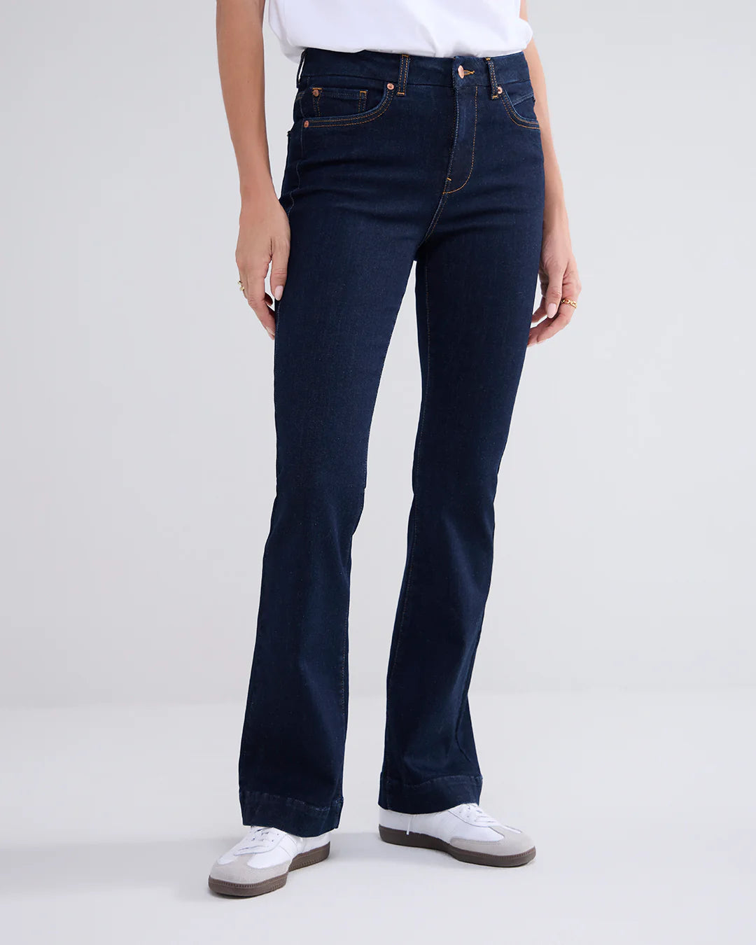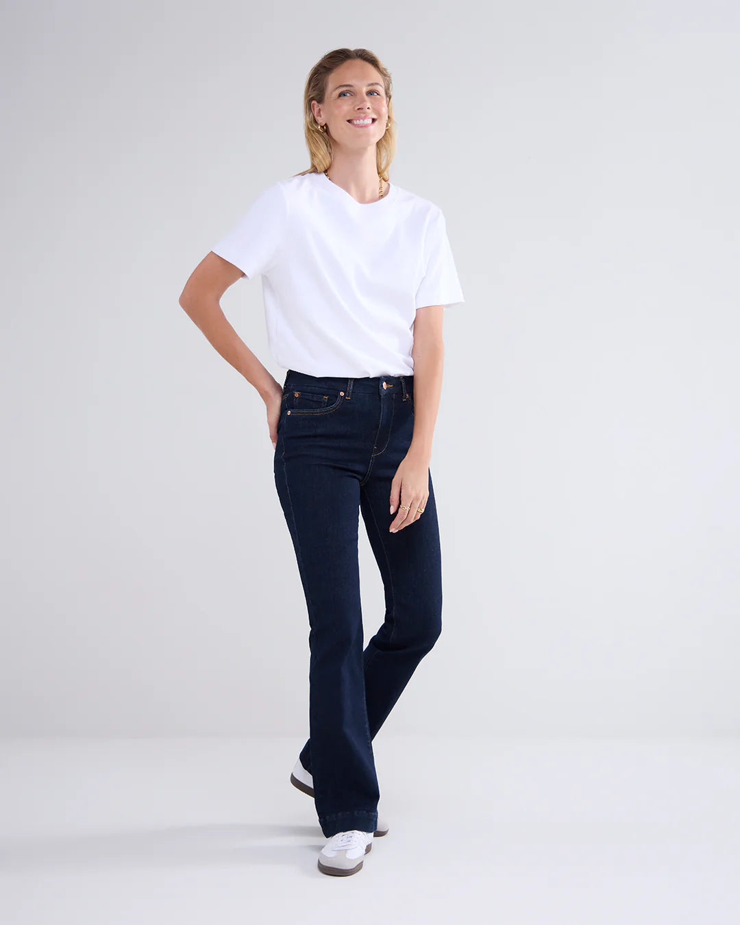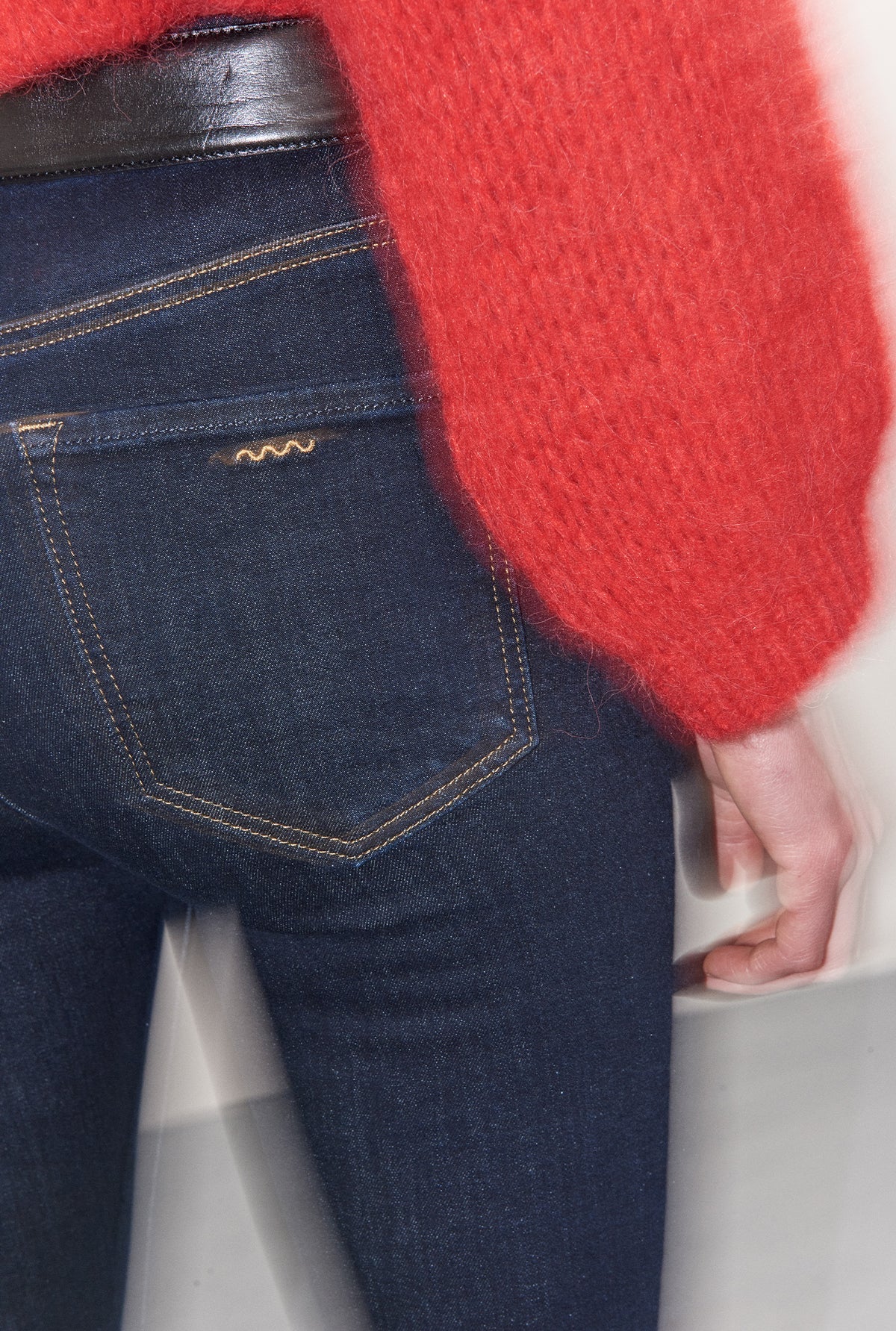 These classic skinny jeans feature a subtle flair for a modern touch. The dark stretch denim is versatile for wearing casually with chunky knit jumpers, or paired with an evening blouse for any occasion.