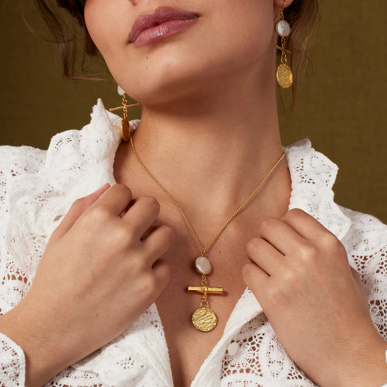 This statement necklace is truly unique, perfect for someone who likes something different! With a gold bar and freshwater pearl pendant, this necklace is beautiful for the summer.