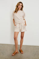 The Kimberly Top is inspired by your simple sweatshirt, perfect for travelling somewhere sunny where you don't want to compromise style for comfort. With short puffed sleeves and an intricate lase cut detailing, this crew neck top can be worn with jeans, or paired with the matching shorts to complete the look.
