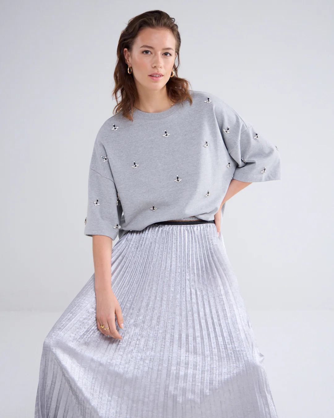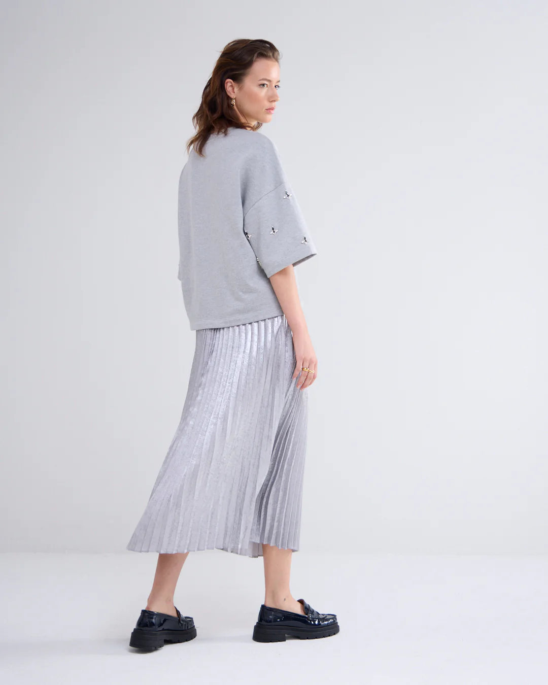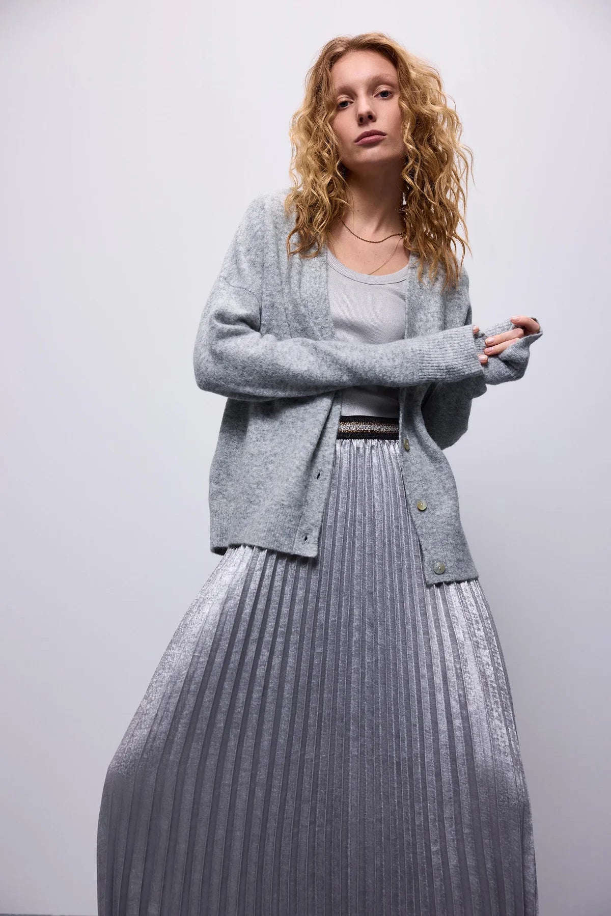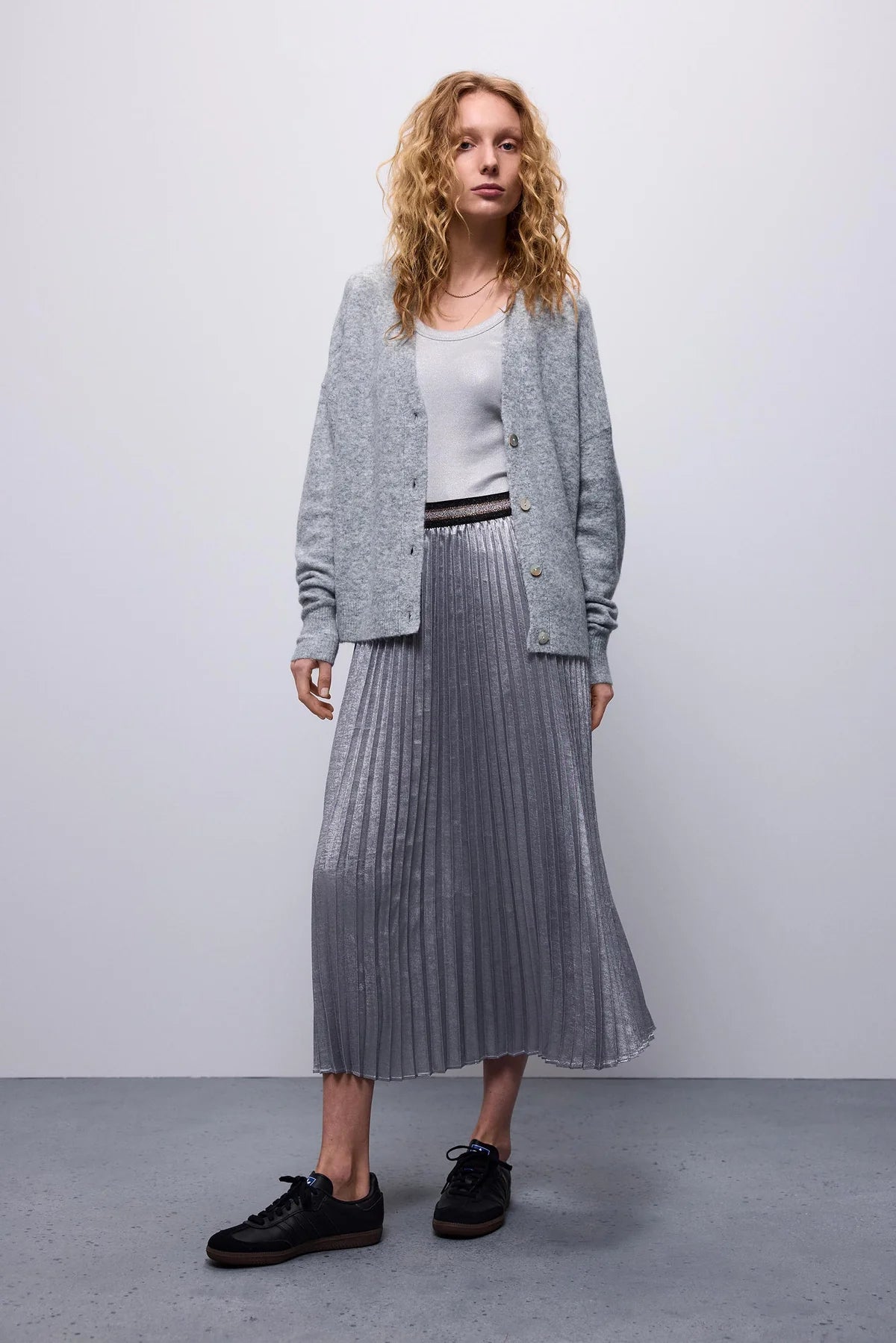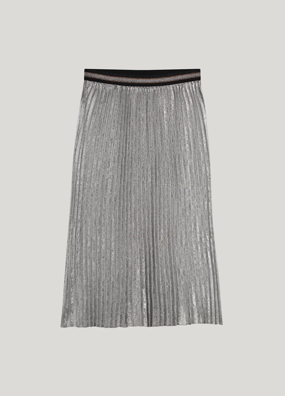 This pleated skirt is sure to make a style statement at any event this winter. With a silver metallic colour and striped elastic waistband, this skirt is easy to style, just pair with a white blouse and biker boots.