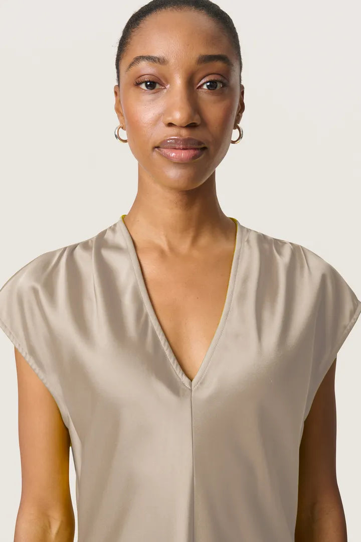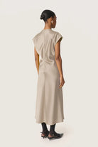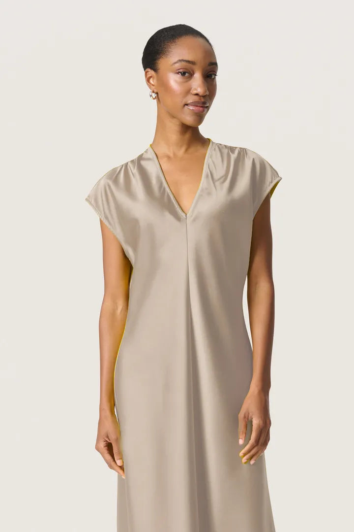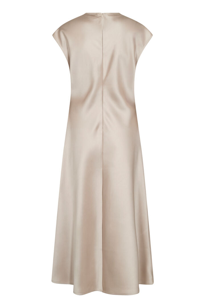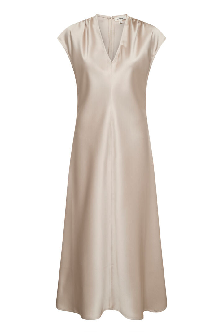 This elegant, satin look dress is beautifully simple, making it the perfect way to make an effortless statement this summer. With a capped sleeve and v-neckline, this dress comes in a feminine champagne colour which looks amazing with a tan!